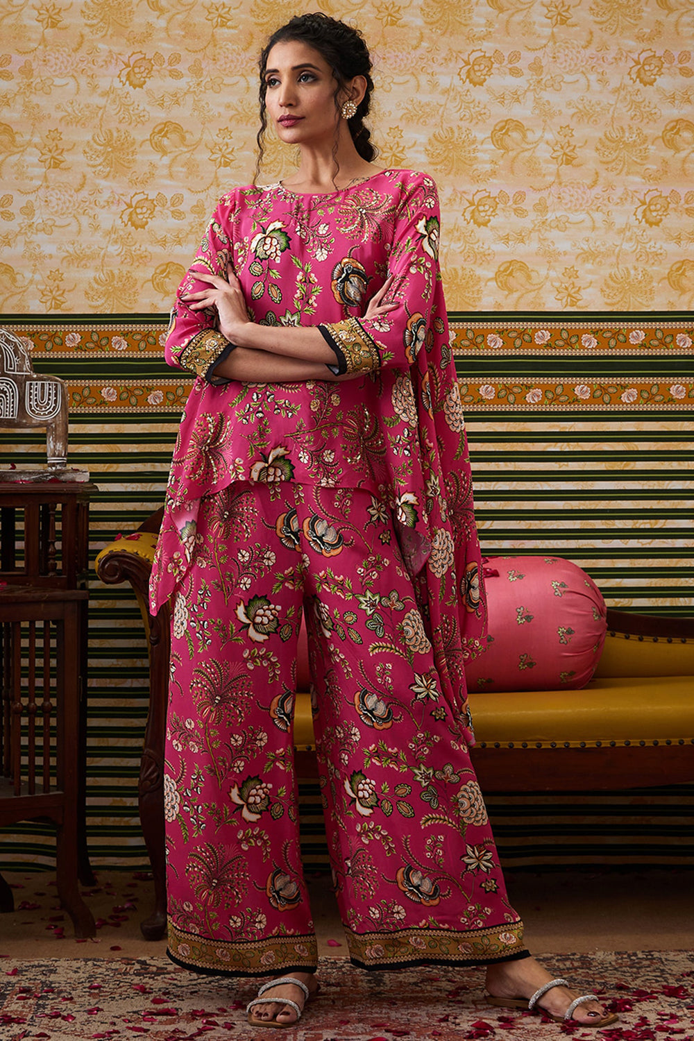 Pink Mehr Embroidered Asymmetrical Top With Straight Pants In Crepe.