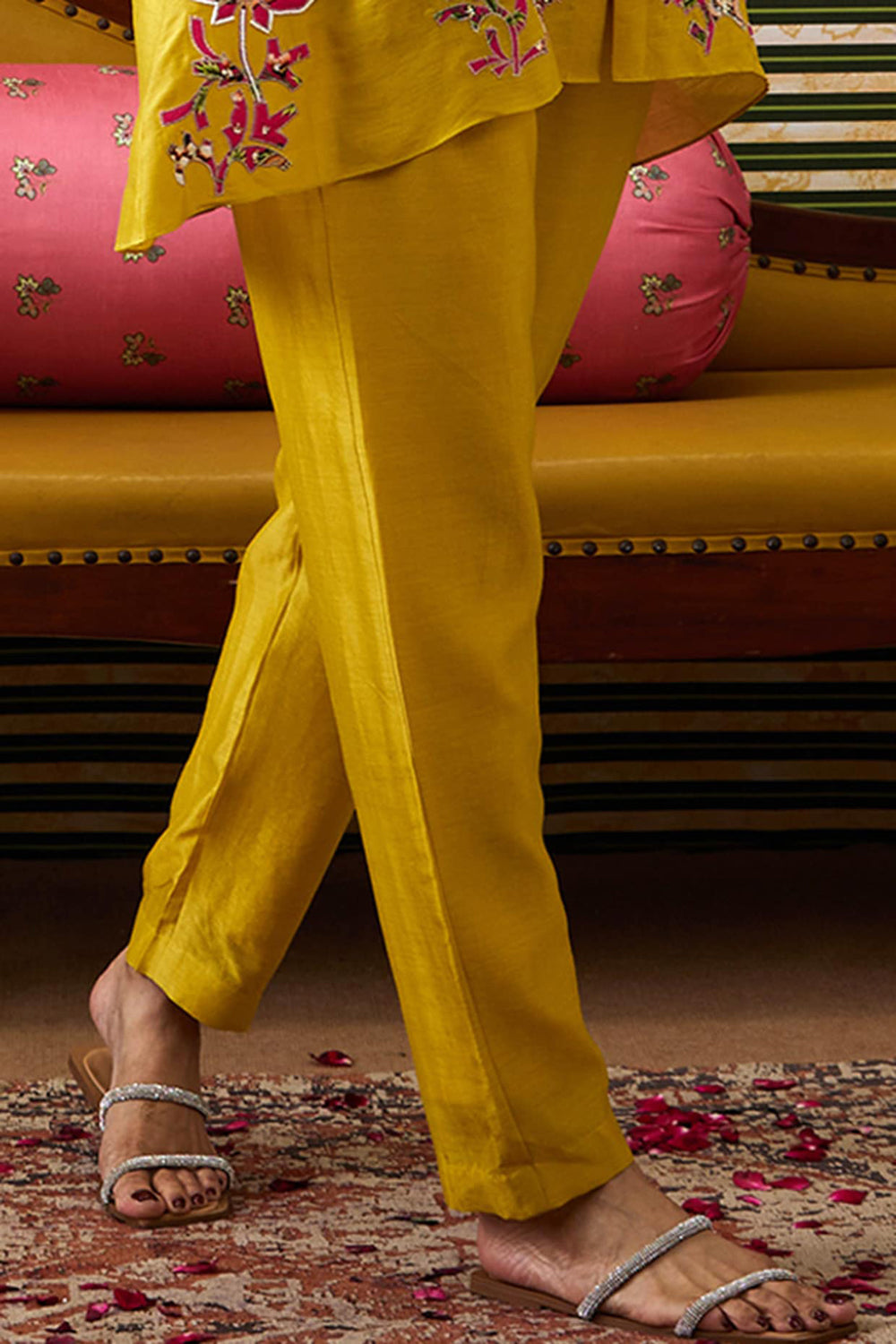 Yellow Mehr Applique Kurta With Flared Sleeves In Chanderi Paired With Pants In Cotton Silk.