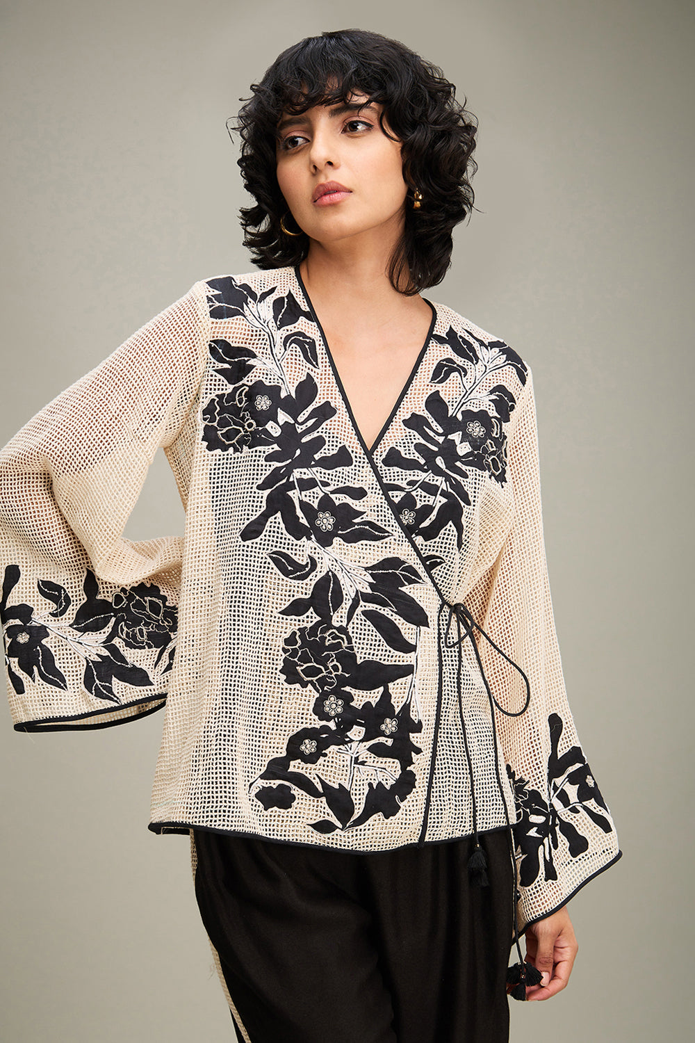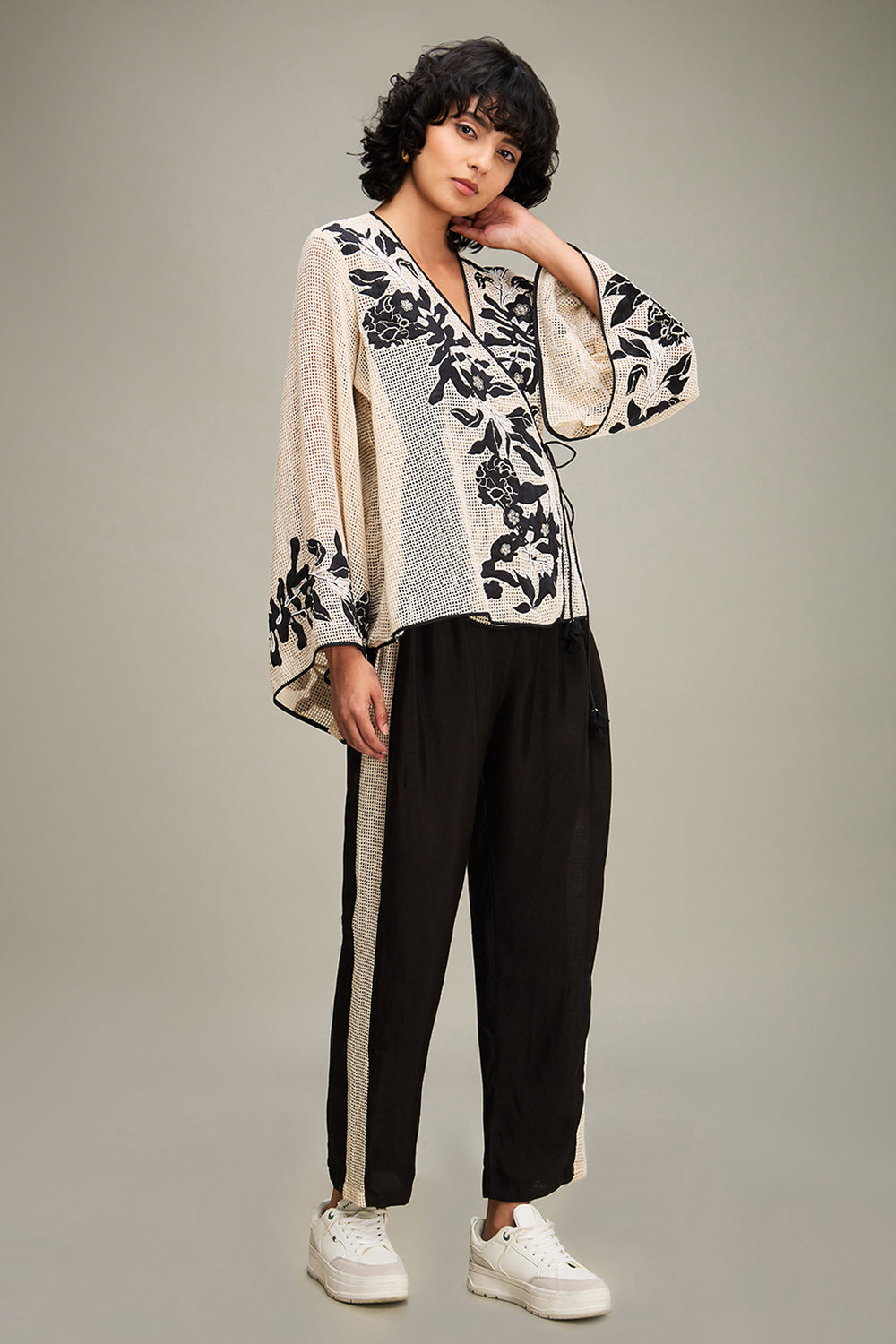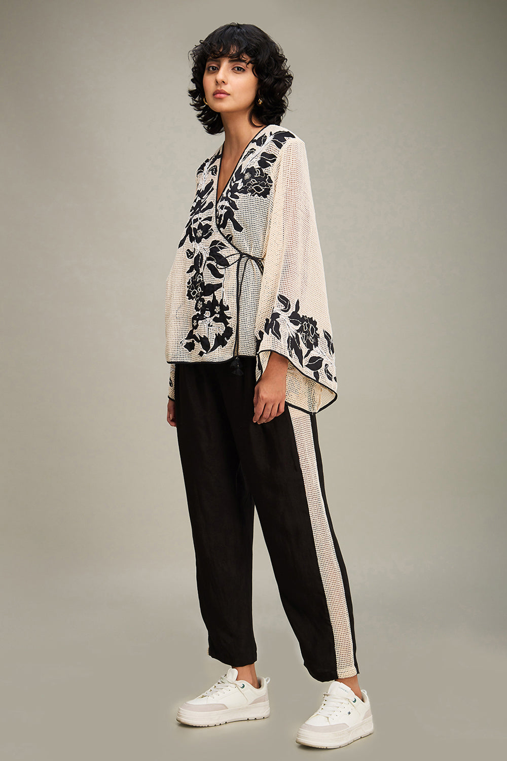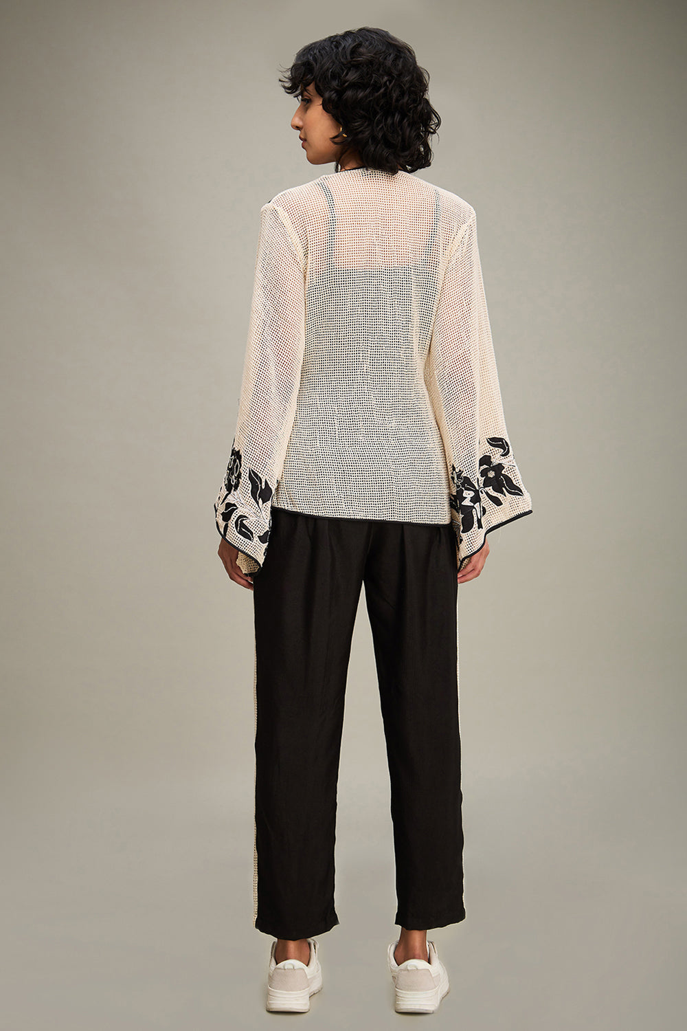 Emboridery & Embellishments: Off White Applique Short Angarkha Top in Handloom Cotton Comes With A Slip And Black Flared Pants in Linen Slub Cotton.