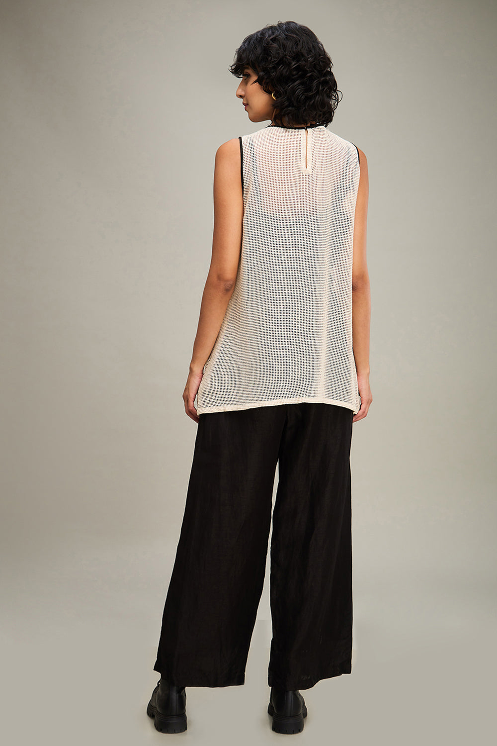 Emboridery & Embellishments: Off-white Zinnia Appliqued Sleeveless Top with handloom net, paired with black flared pants in chanderi.