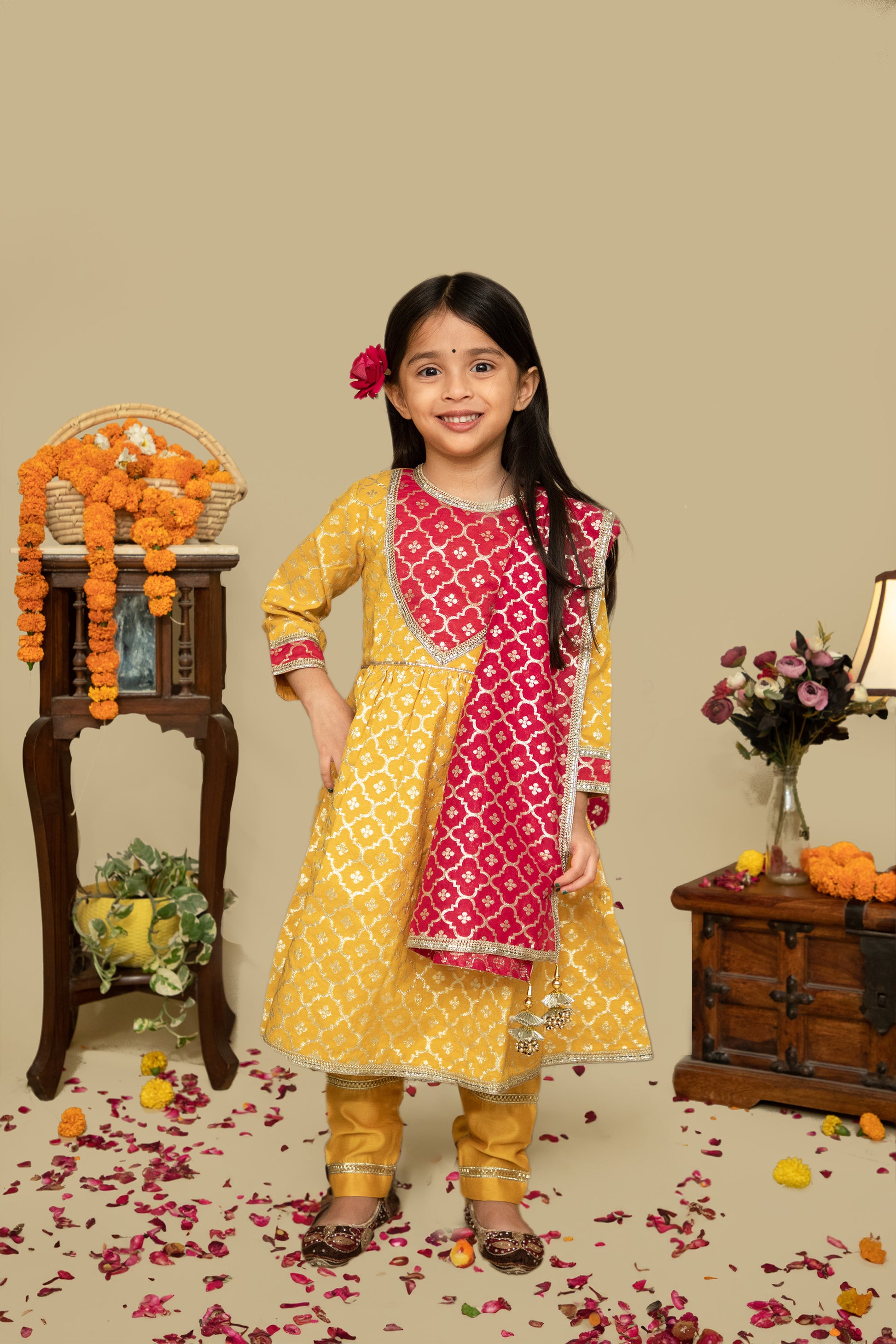 Buti Chanderi Anarkali with Fuschia buti chanderi applique comes with Chanderi Payjama with Voile Lining.It also includes Buti Chanderi Fuschia Dupatta