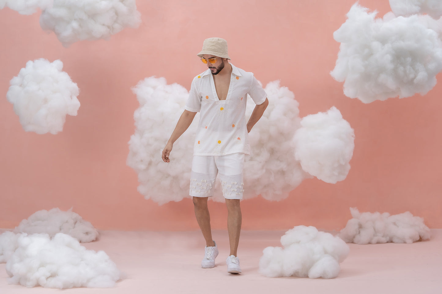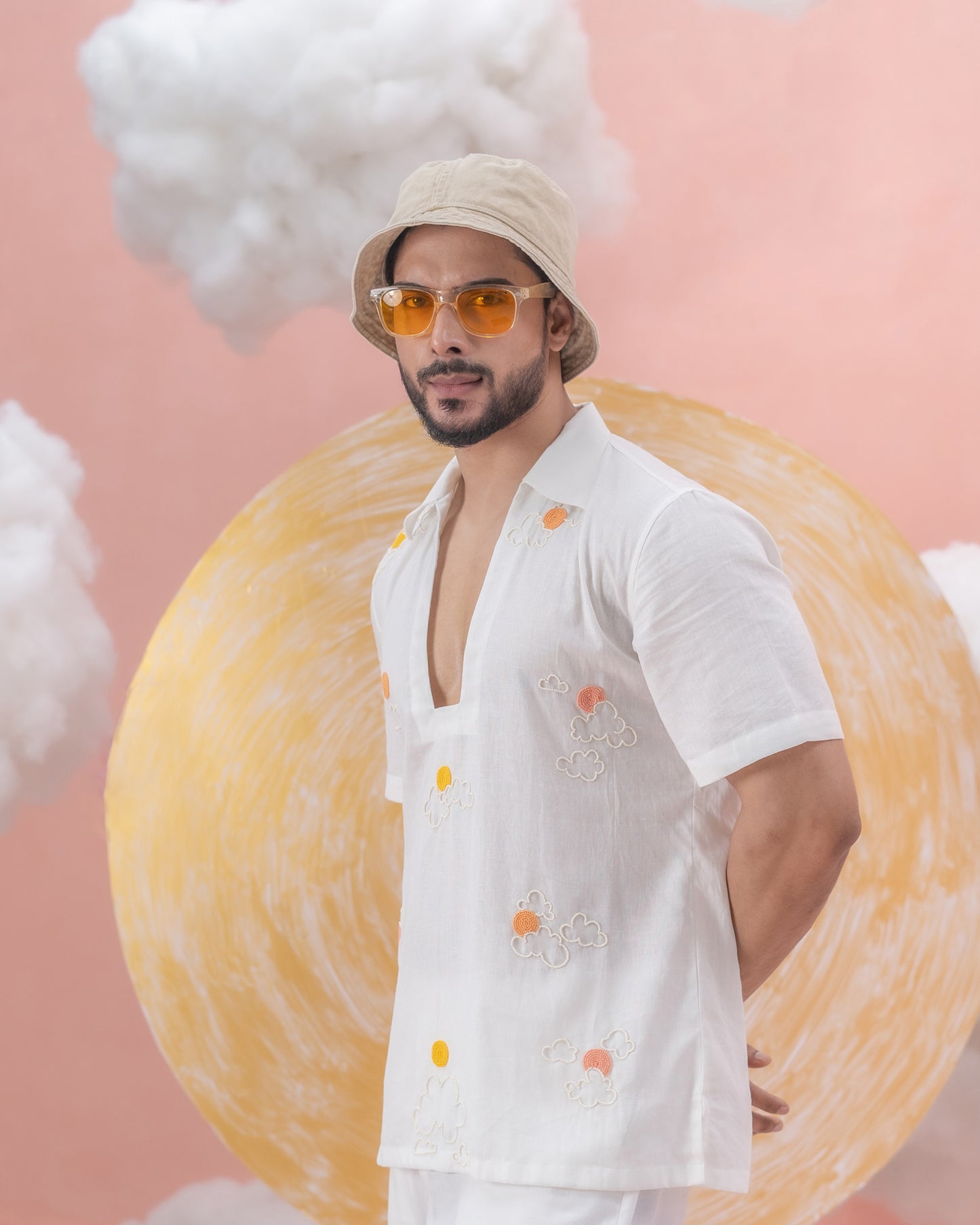 A white linen cotton shirt, exceptionally hand-embroidered with beadwork breezing the summer sun and clouds, enchanting the summer heat in ubercool silhouette. The unique neckline adds an extra touch of attention, making a dapper statement. Perfect for those who embrace skin aesthetics with a creative twist in their summer wardrobe.