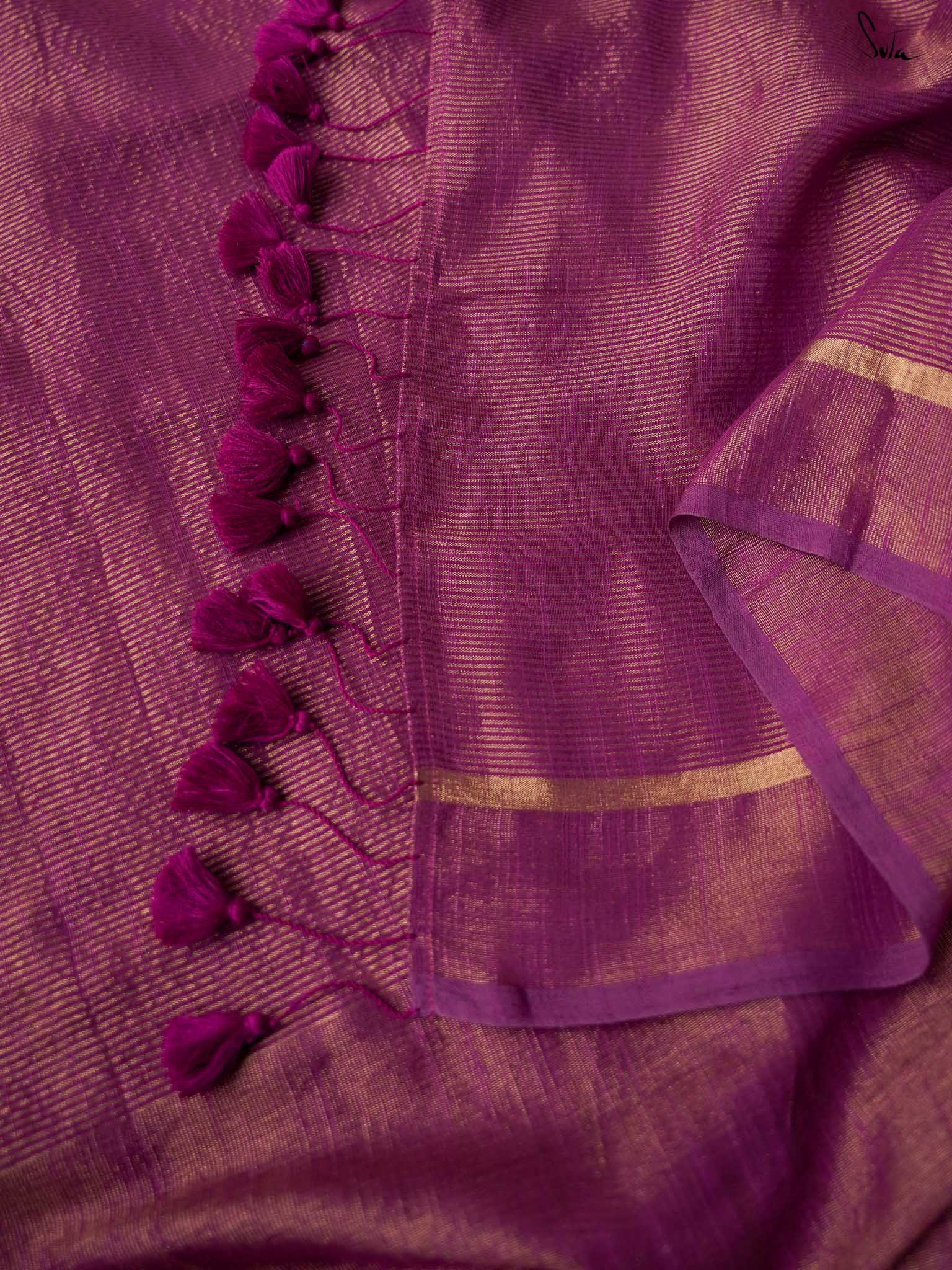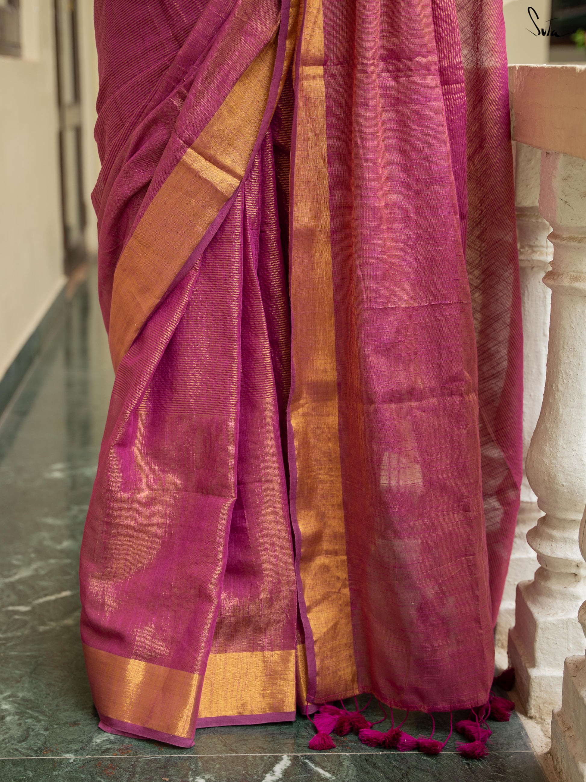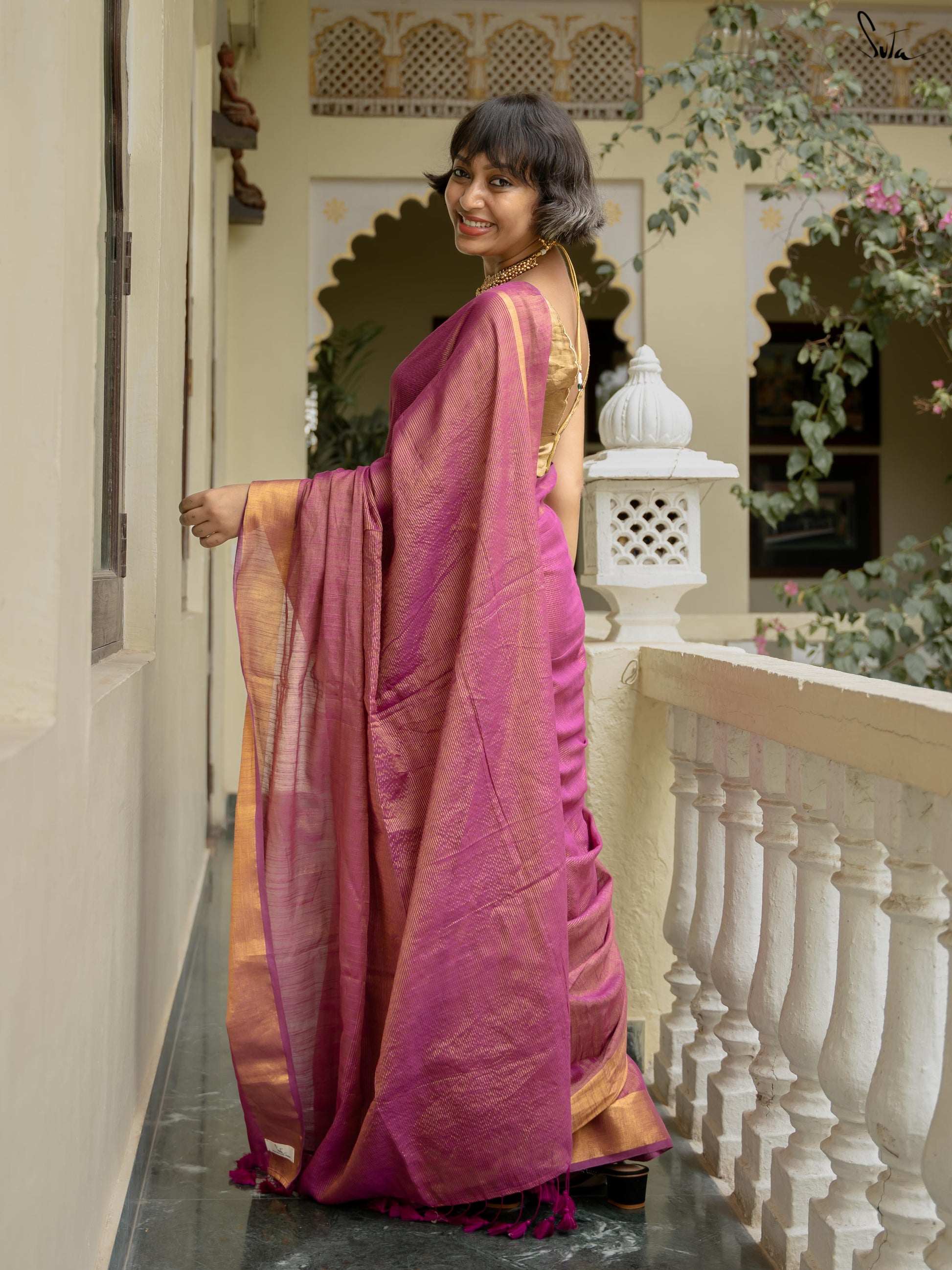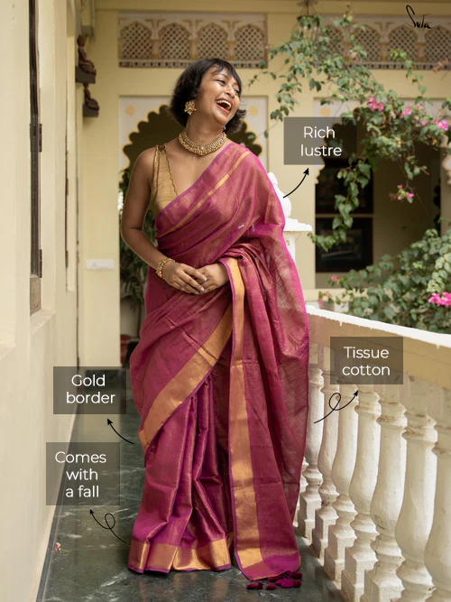 Delve in self-love as you adorn the Sunheri Gulkaner, a tissue cotton saree in lustrous magenta, crafted with a shimmering gold zari border and zari stripes throughout. Infused with the charm of moonlight, the saree is woven with festive magic.