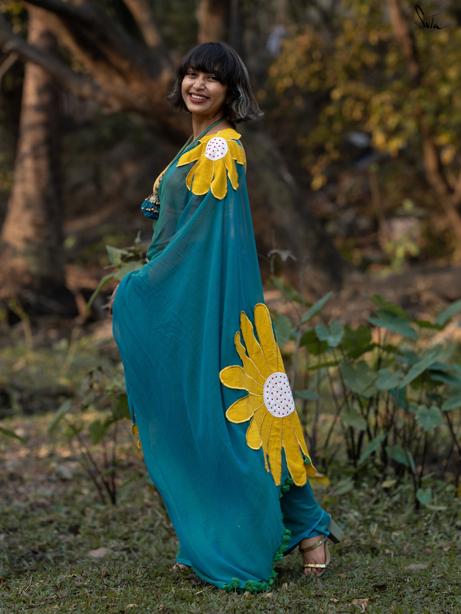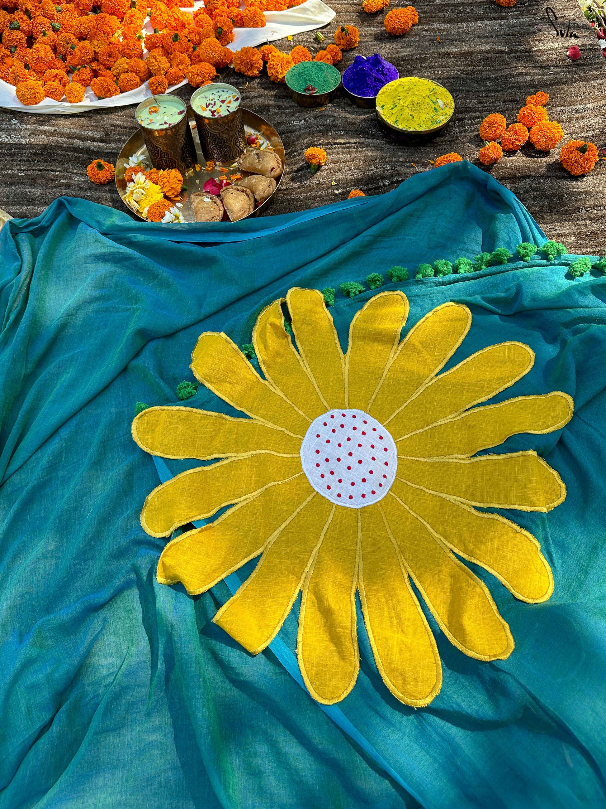 Usher in the exalted spirit of the season in this cottony soft teal saree with contrast floral appliqué patches.