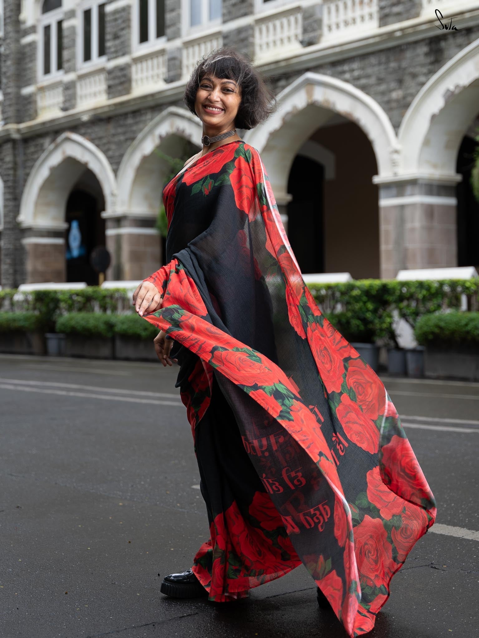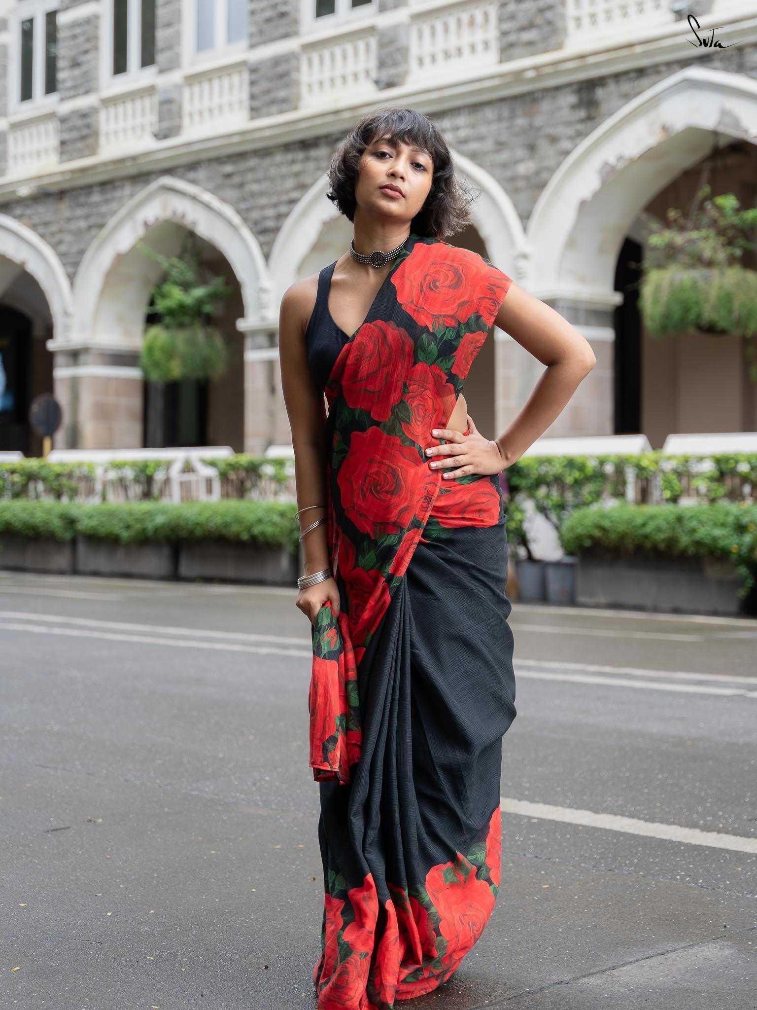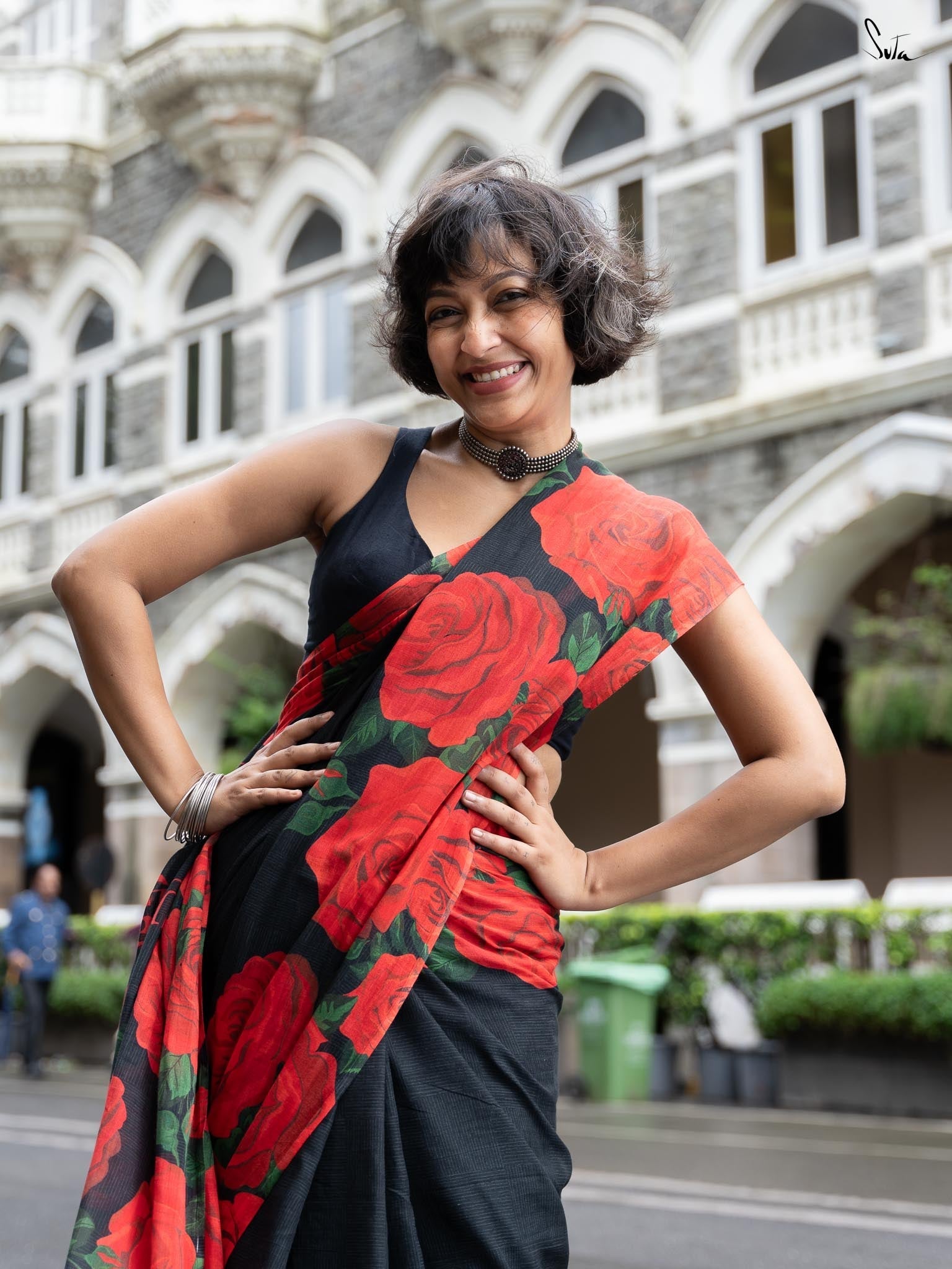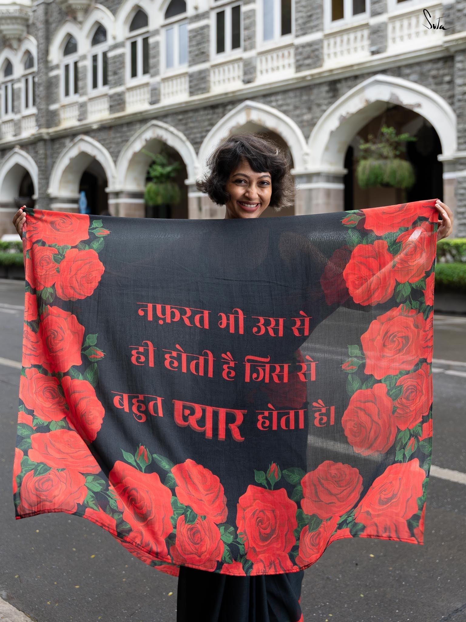 Suta's Mul Cotton sarees beautifully blend elegance with comfort. Presenting the Taapsee × Suta collection, capturing love and passion in every thread. 'Surkh Gul' is a captivating black digitally printed saree, woven from buttery-soft Mul Cotton, featuring a red rose pattern across the border, and a pallu that reads, “ नफरत भी उस से ही होती है जिस से बहुत प्यार होता है “. Designed to add grace to your look, make space in your wardrobe for this Surkh Gul Mul Cotton saree.