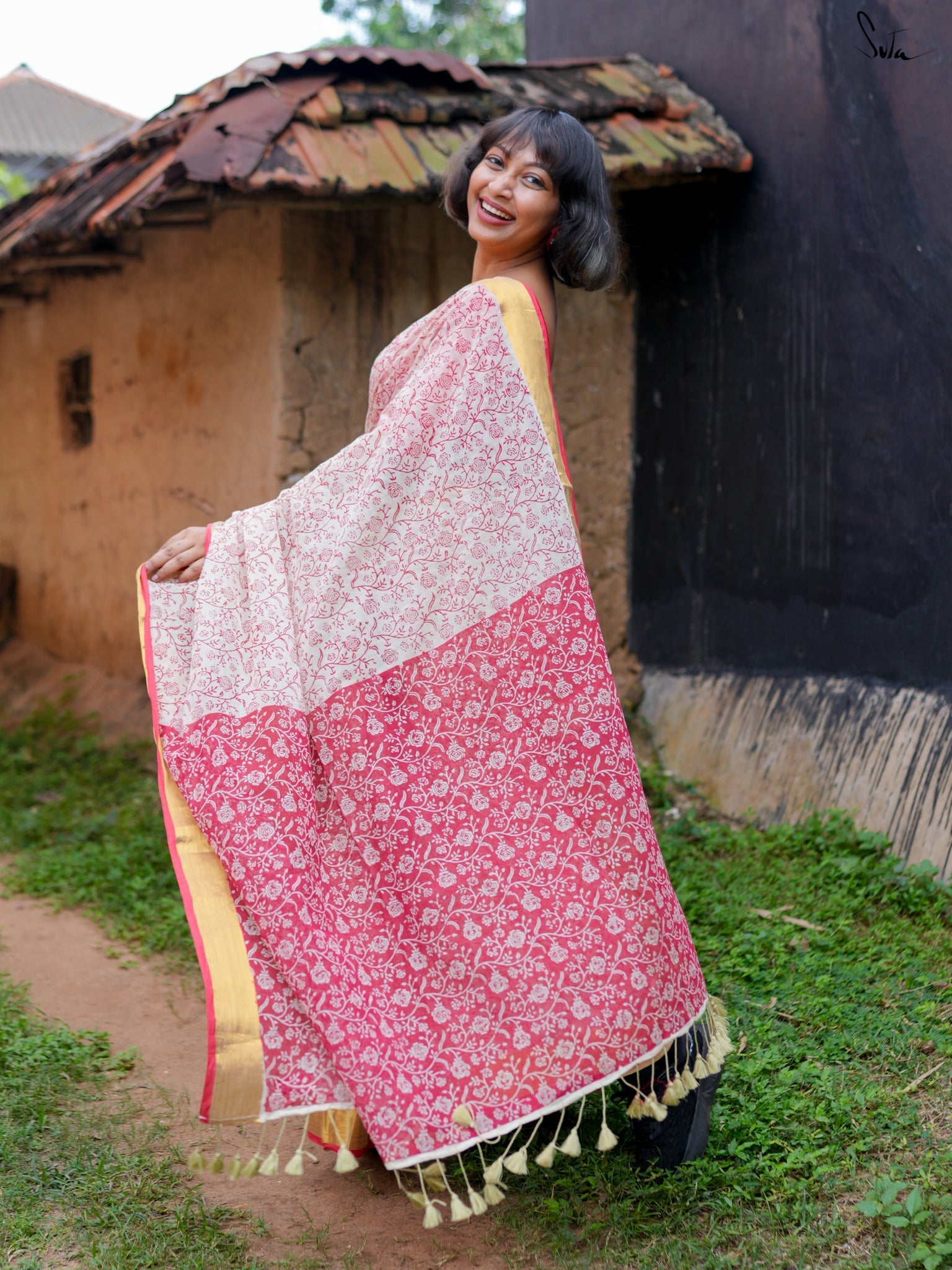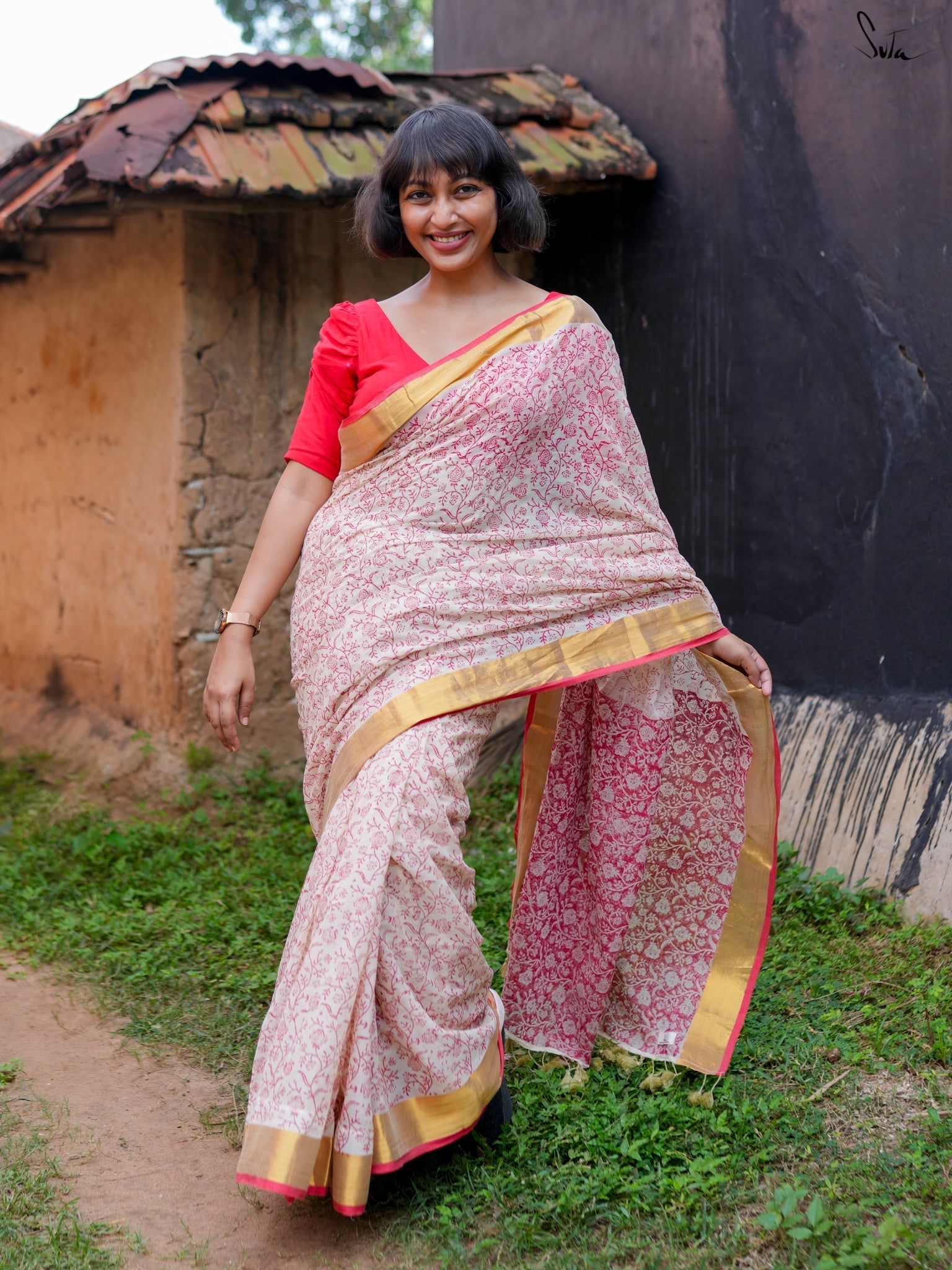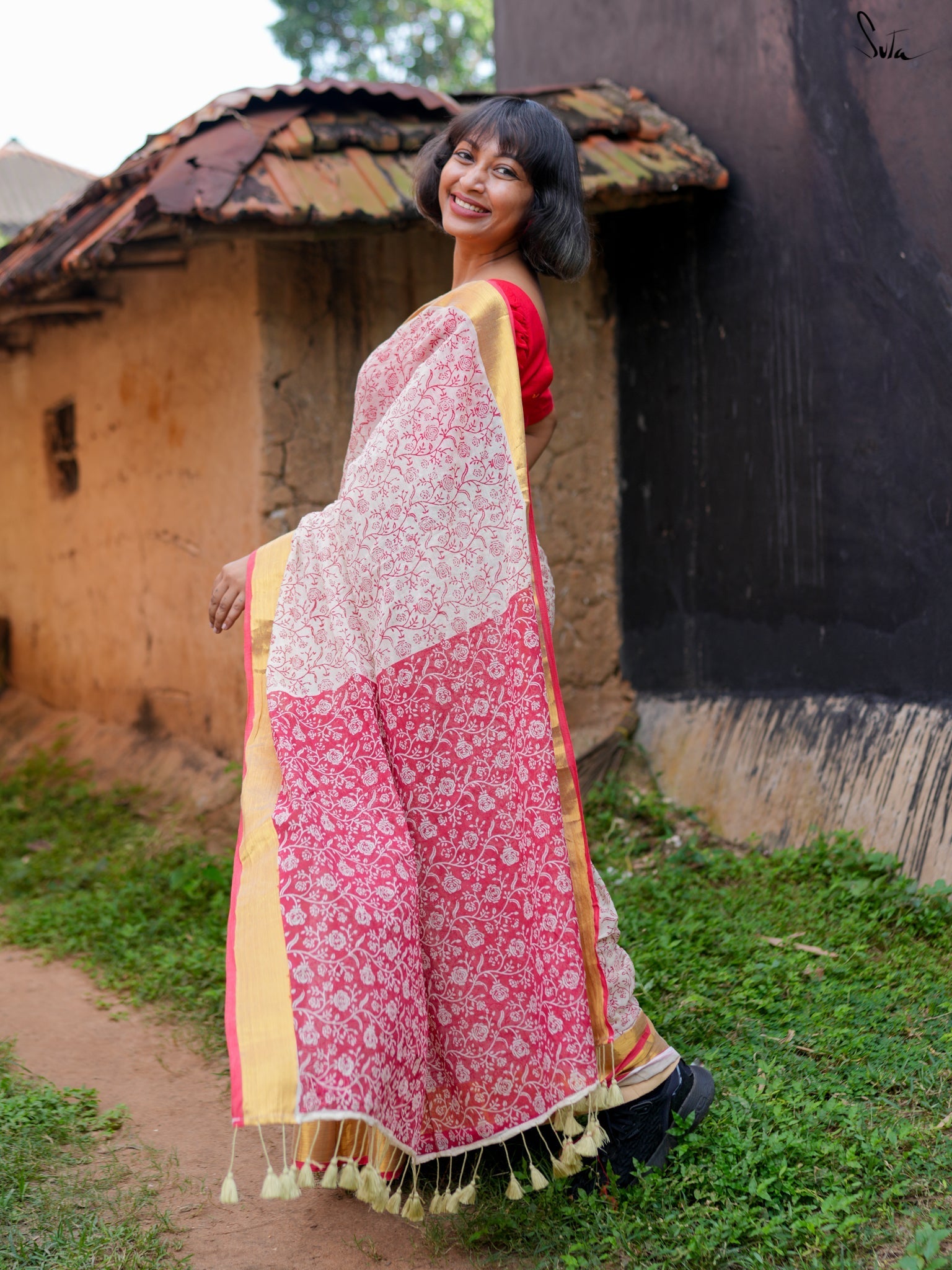 Derived from the Sanskrit word meaning "virtuous" or "pure," Suvrata is a striking red-and-white saree crafted from feather-light mul cotton. Adorned with intricate block prints and a luxurious golden border, it merges passion and piety effortlessly. With Suvrata, let your elegance speak volumes and your style win hearts.