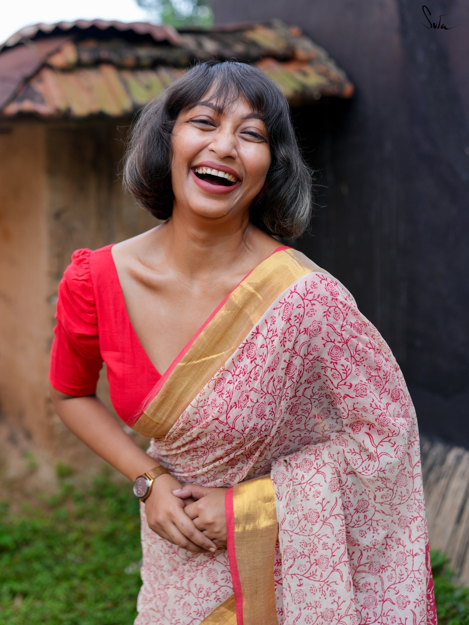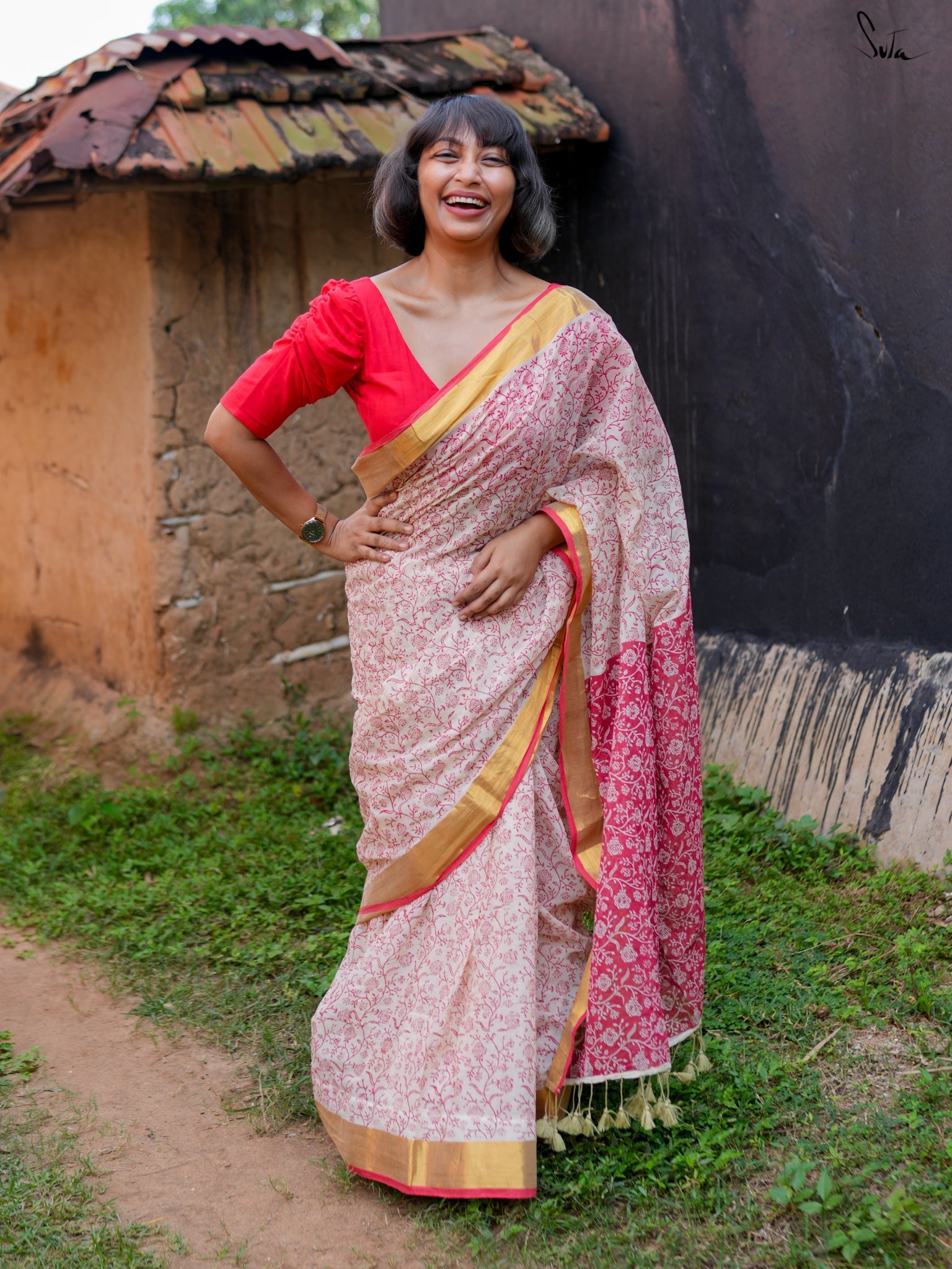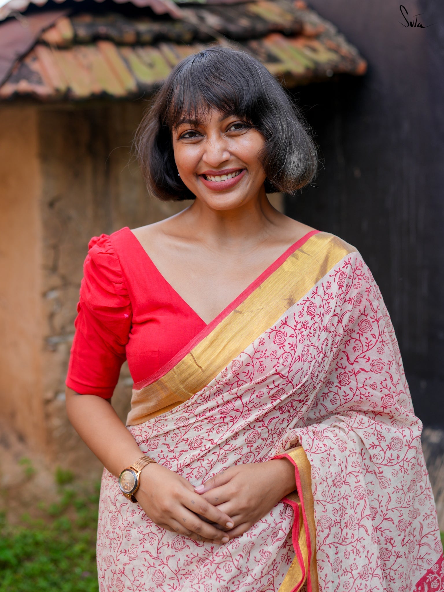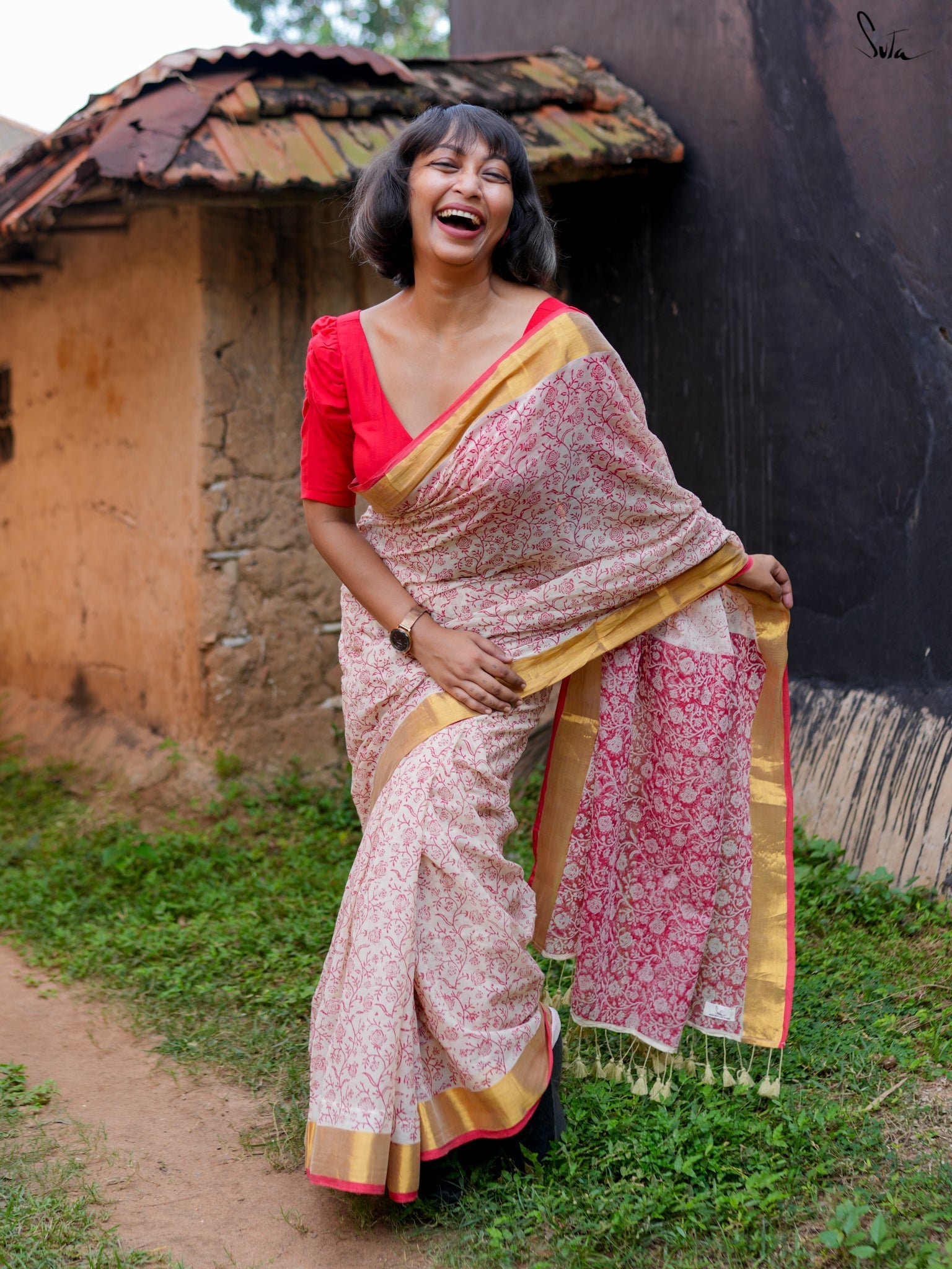 Derived from the Sanskrit word meaning "virtuous" or "pure," Suvrata is a striking red-and-white saree crafted from feather-light mul cotton. Adorned with intricate block prints and a luxurious golden border, it merges passion and piety effortlessly. With Suvrata, let your elegance speak volumes and your style win hearts.