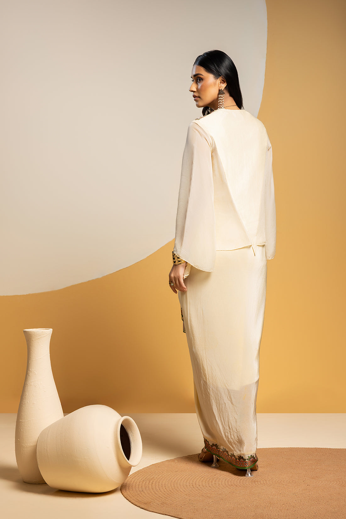Off-white Taarani embellished V-neck asymmetric top in organza, paired with printed drape skirt in crepe.