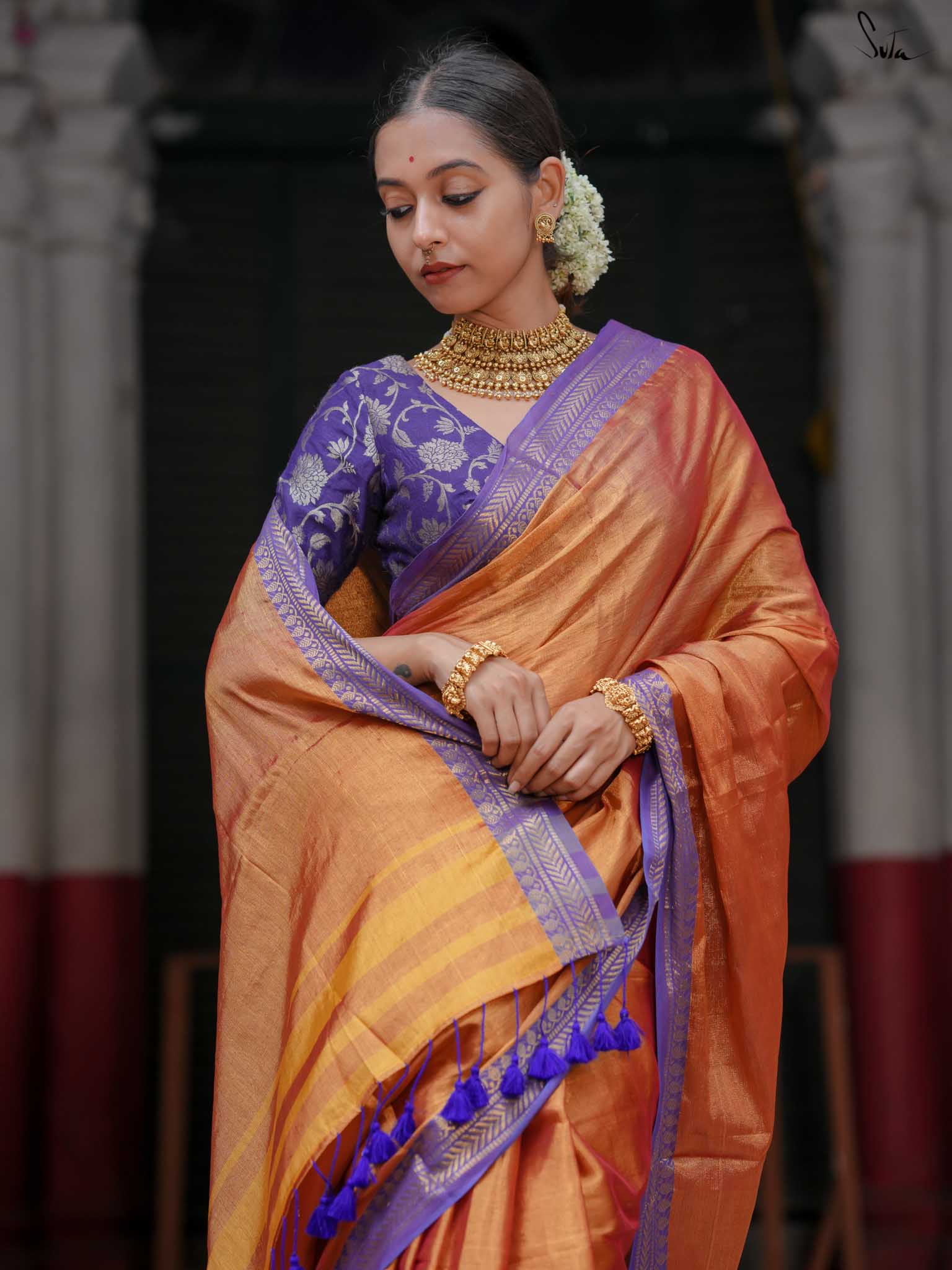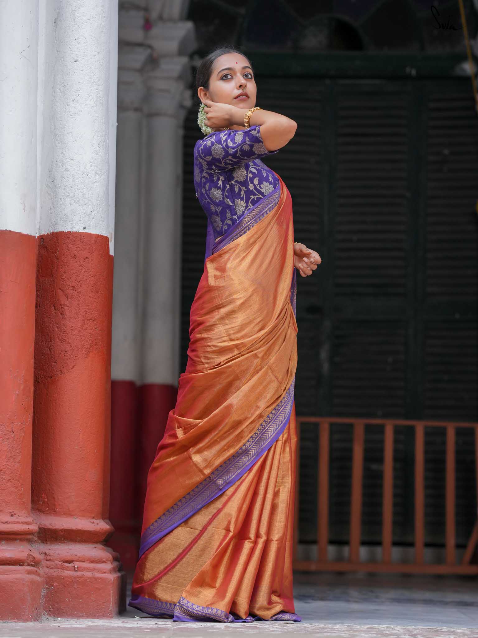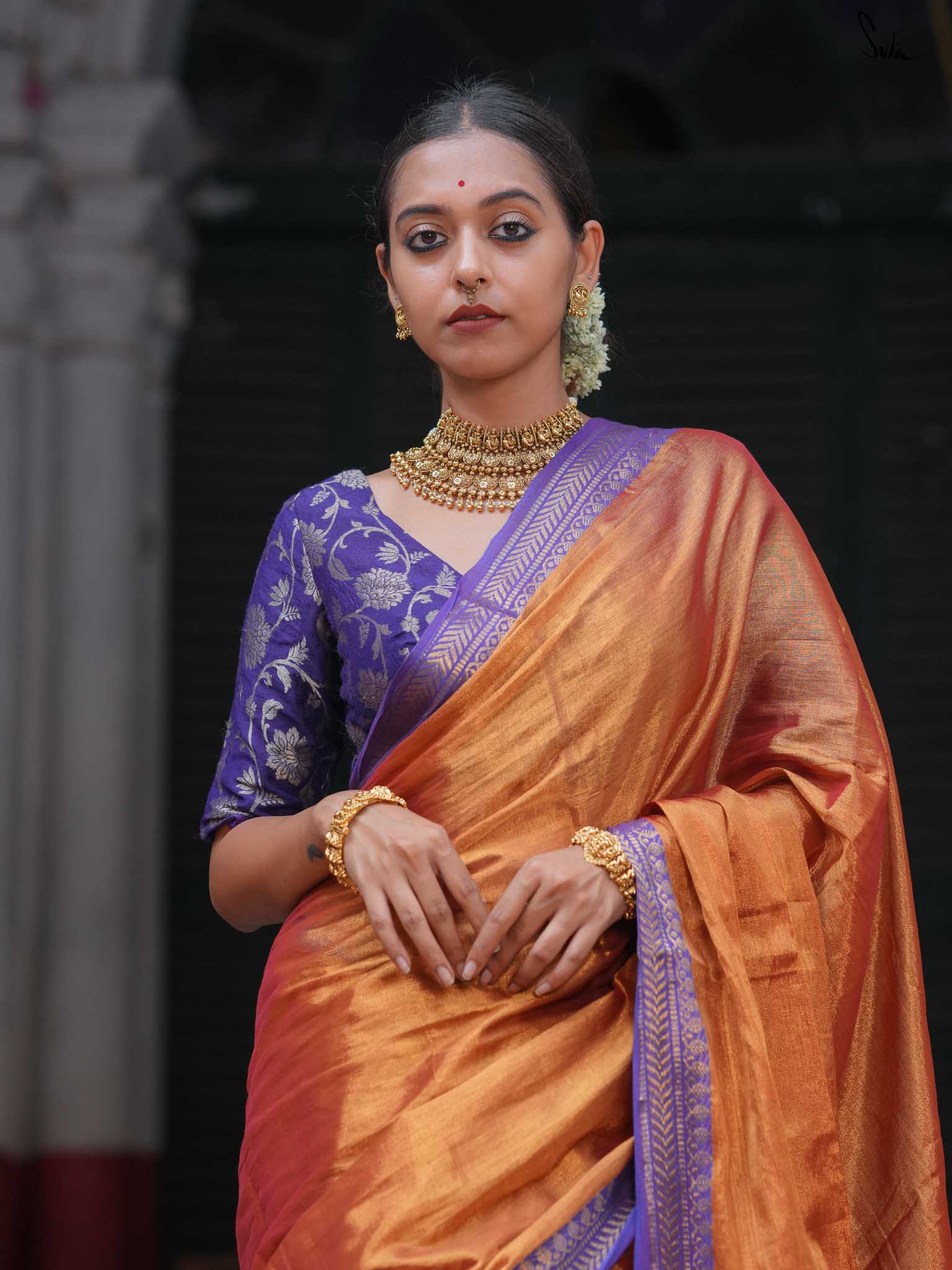 Taarini, a captivating dual-colored copper tissue cotton saree embraced by a rich purple jacquard border celebrates the elegance of festivities. "Taarini," meaning "savior," symbolizes hope and renewal. This saree is a celebration of life's vibrant colors, inviting you to embrace every joyful occasion. Wear it with pride, as it reminds you that every moment holds the power to shine.