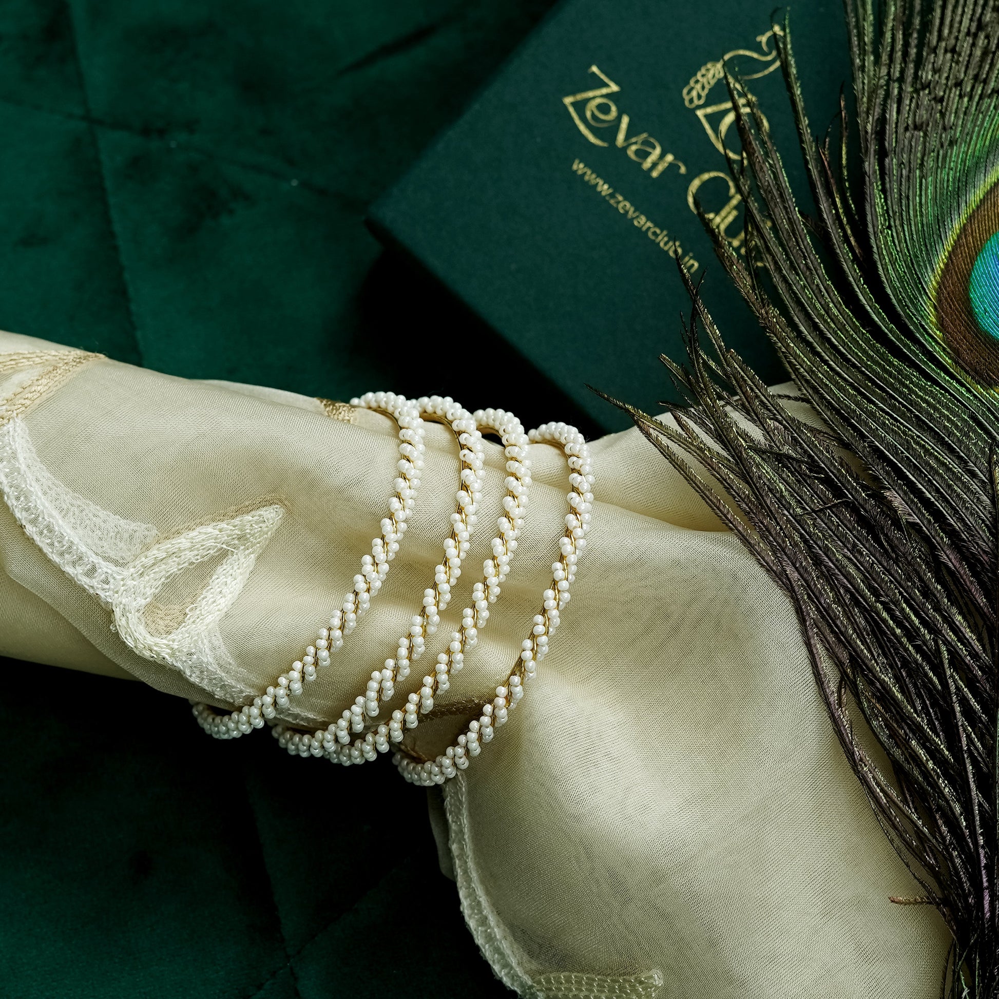 The Taj Twisted Pearl Bangles from Zevar Club blend timeless elegance with contemporary design. Featuring lustrous pearls twisted with intricate detailing, these bangles evoke the grandeur and sophistication of royal heritage. The pearls are delicately woven into the design, adding a touch of class and femininity to your ensemble. Whether worn alone or stacked, these bangles bring a graceful, luxurious flair to any occasion.