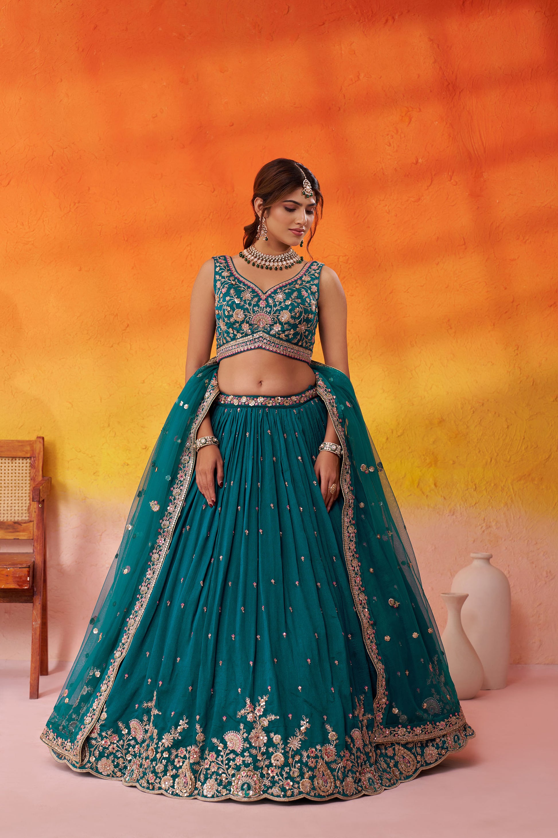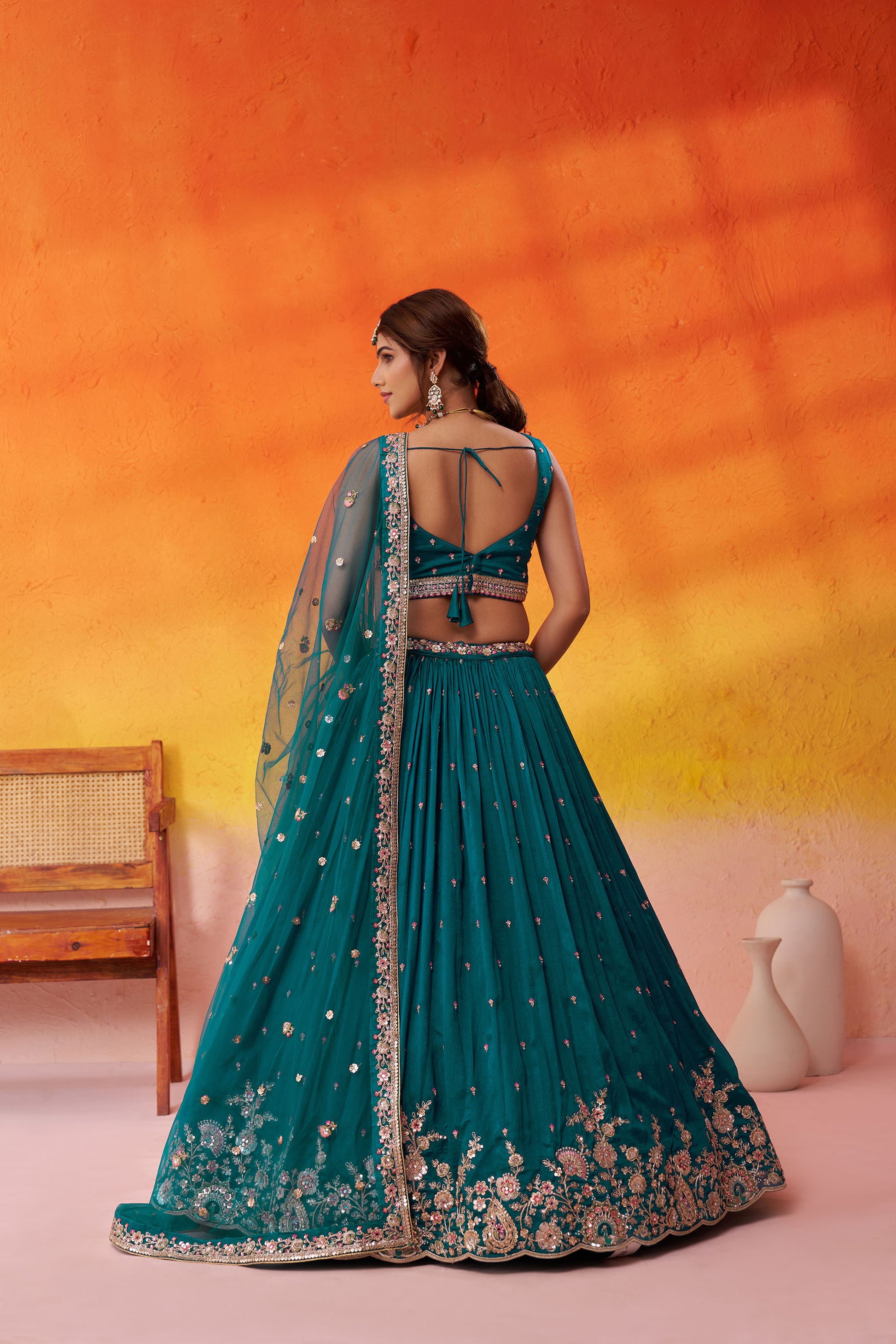 Teal Georgette Sequins Thread & Embroidery Engagement Lehenga