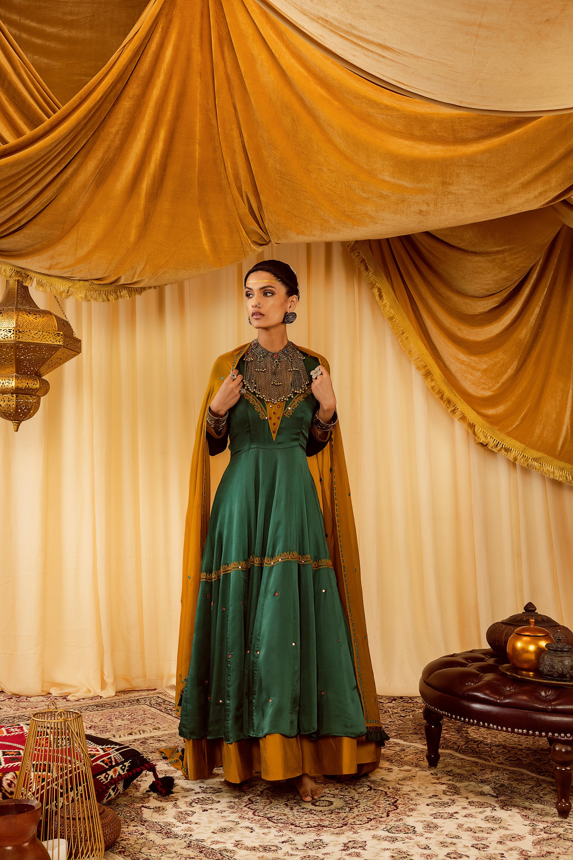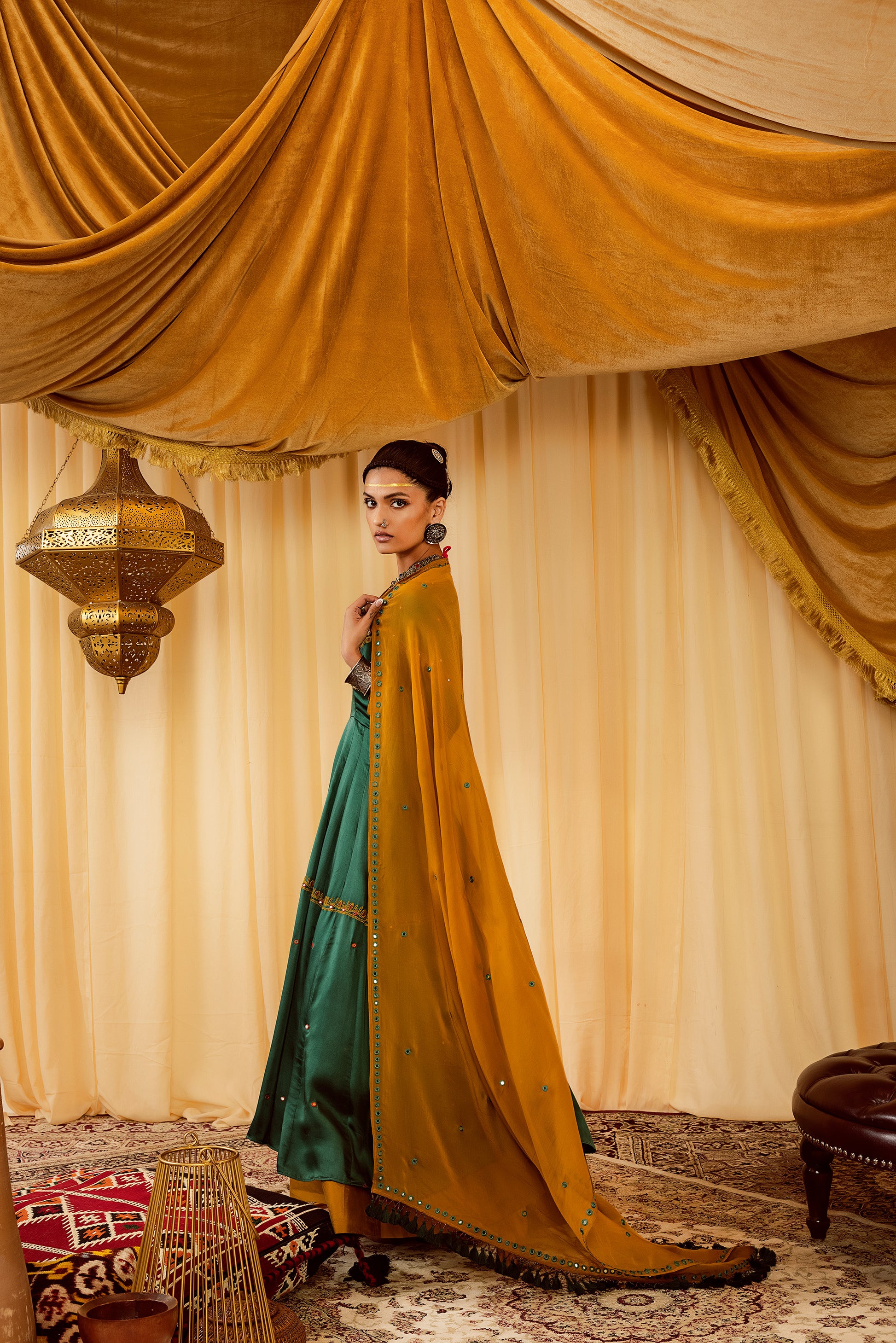 Sacramento teal Anarkali suit comes featuring hand embroidery details & mirror work on the sleeve, upper bust, knees till hem, with a hint of mustard finishes. it has been paired up with a mustard color duppatta with mirror work & tassel details.