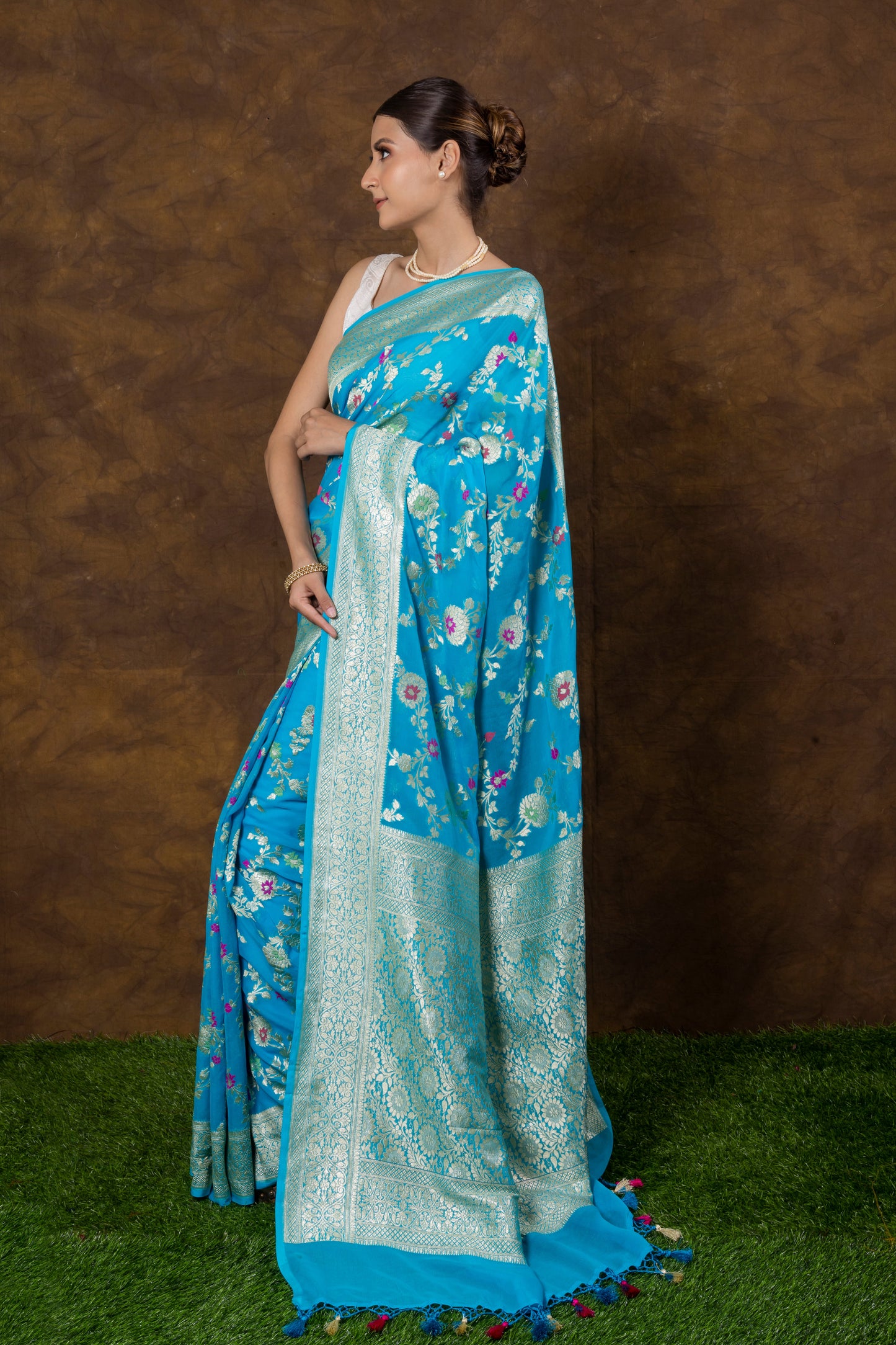 Turquoise Blue Georgette Khaddi Pure Silk Saree