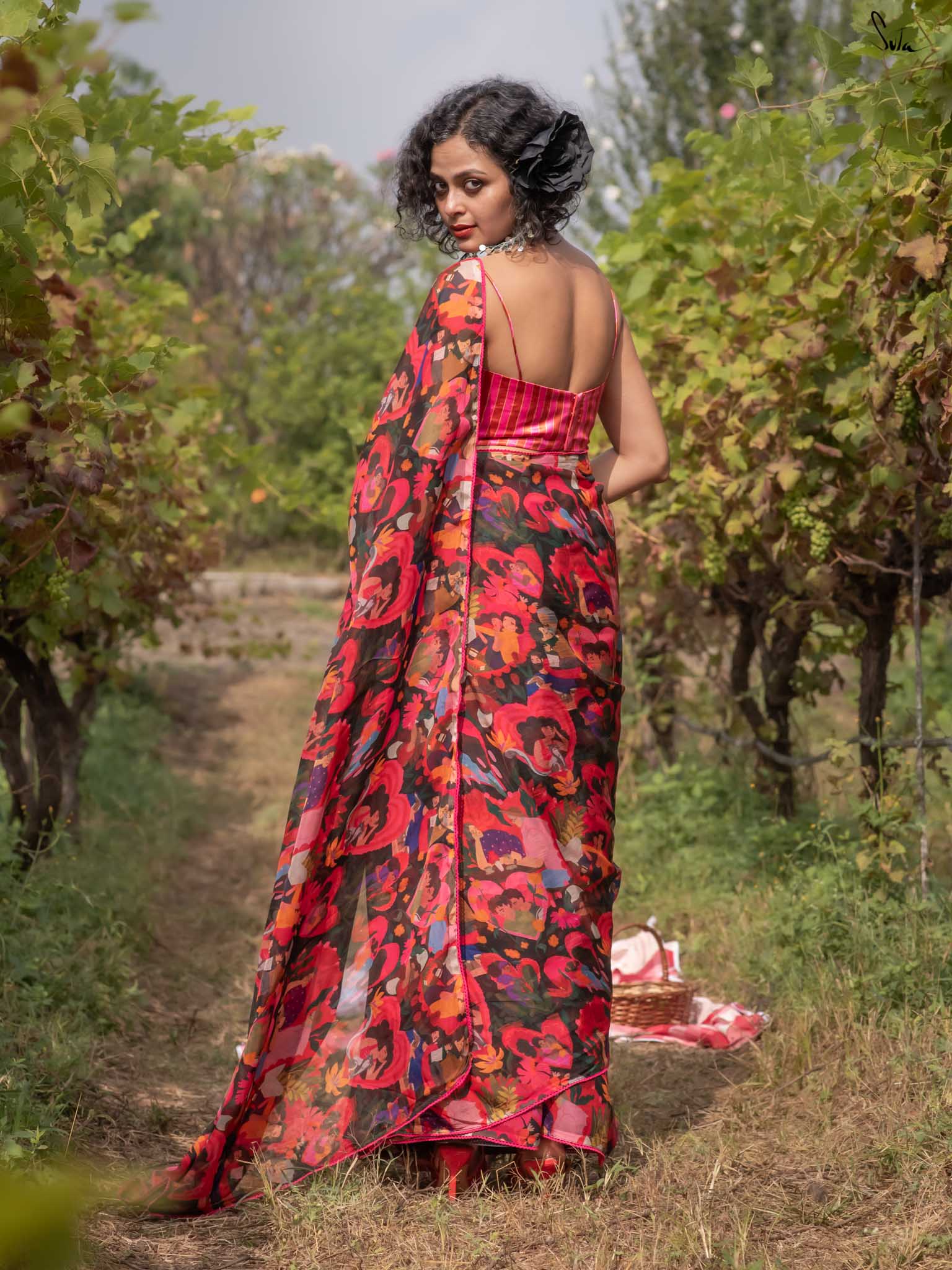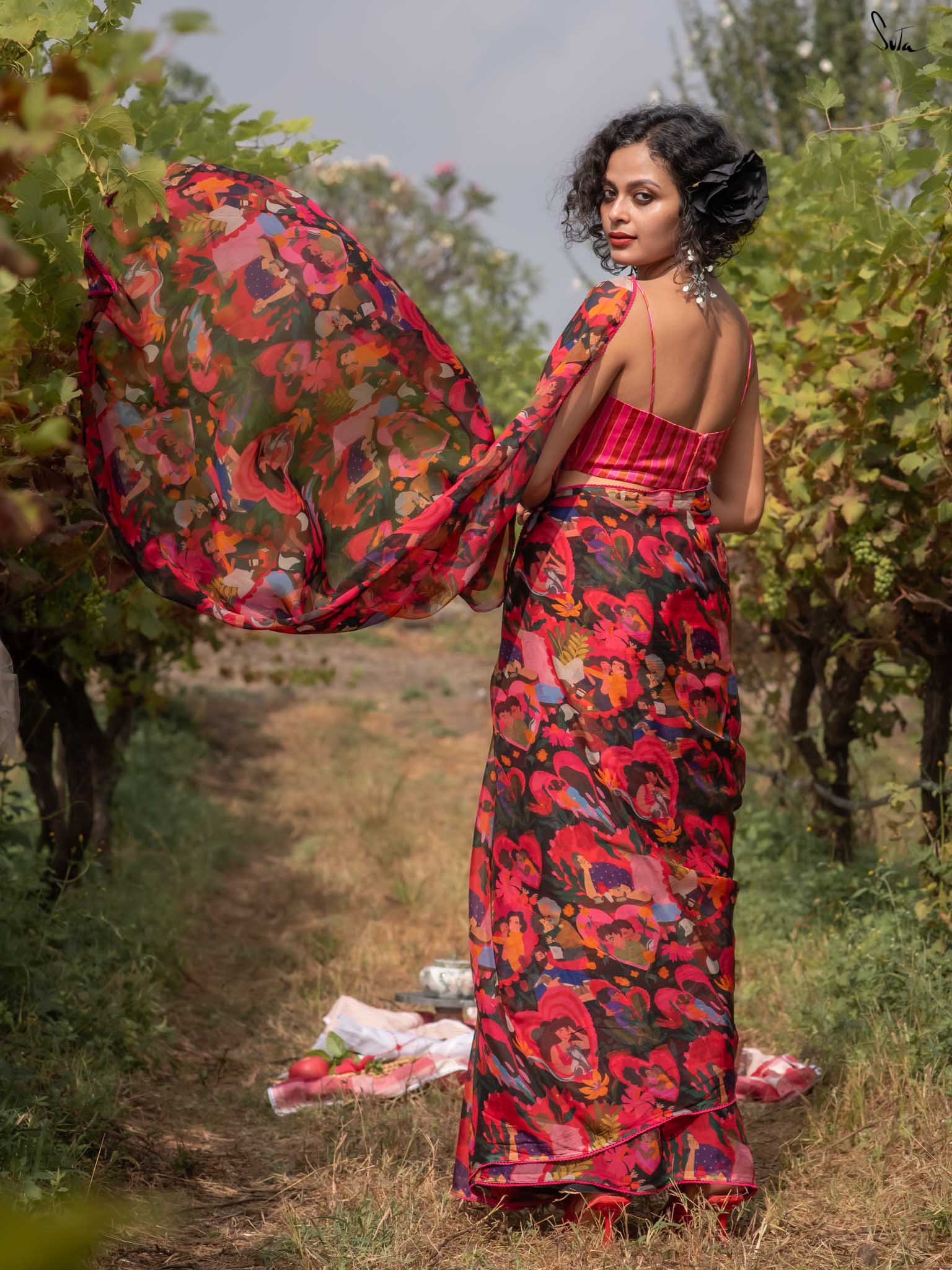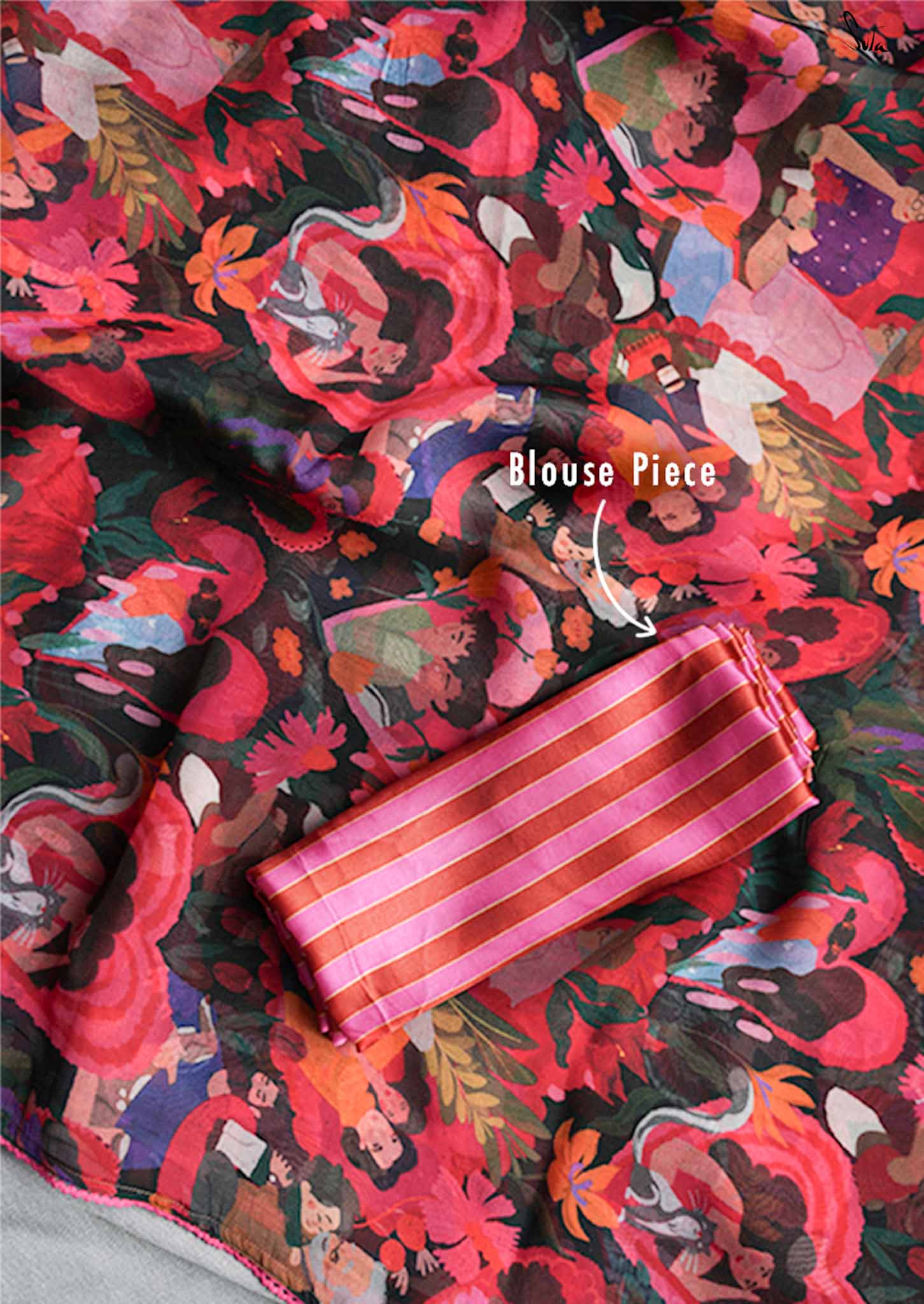 In a world where love takes countless forms, Universal Pyaar is a radiant tribute to the many shades of the heart. This multicolored saree crafted from viscose organza beautifully captures the essence of love in all its forms. Cherishing moments in every print: pet love, motherly affection, romantic bonds, and timeless companionship weave together a vivid tapestry of joy, connection, and togetherness. This saree comes with a striped blouse piece attached.