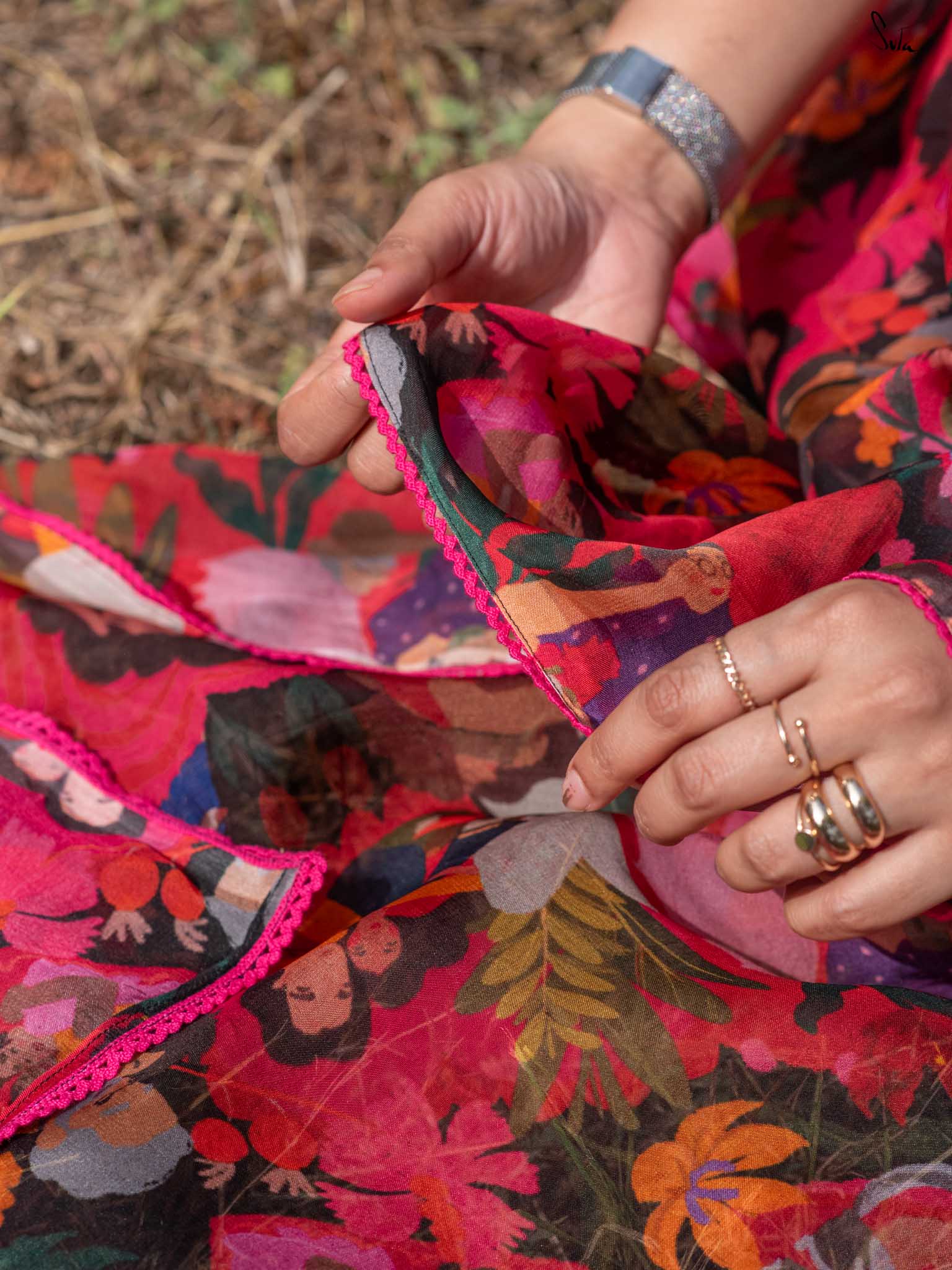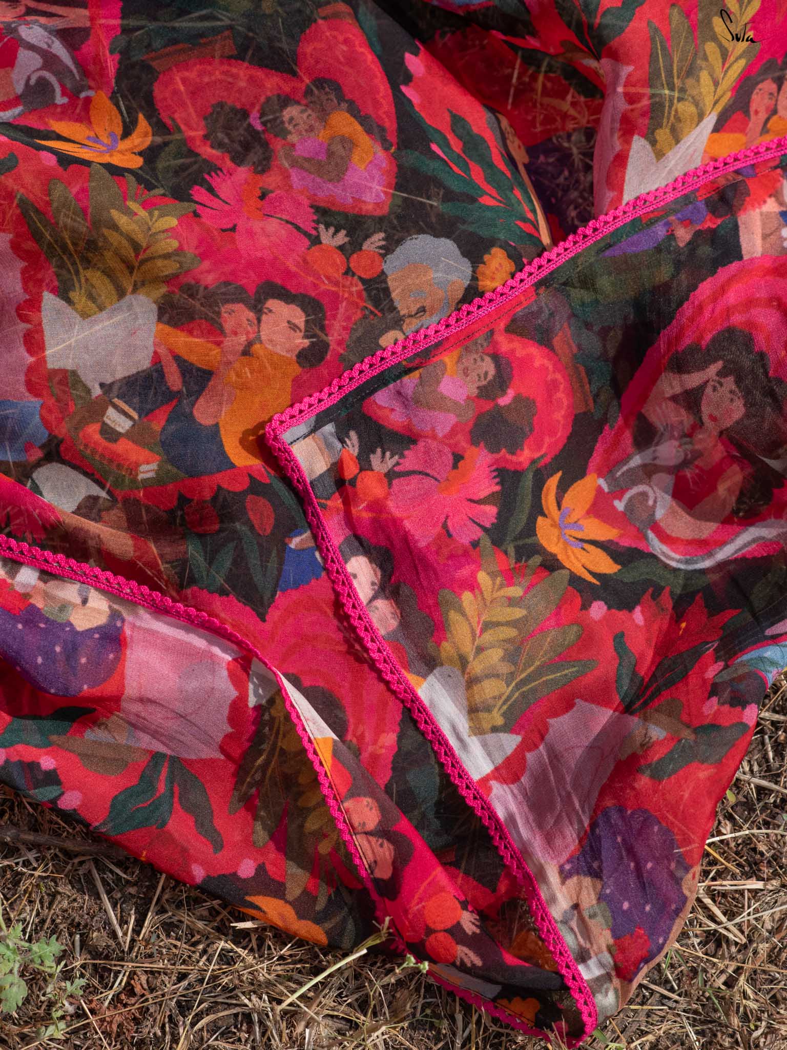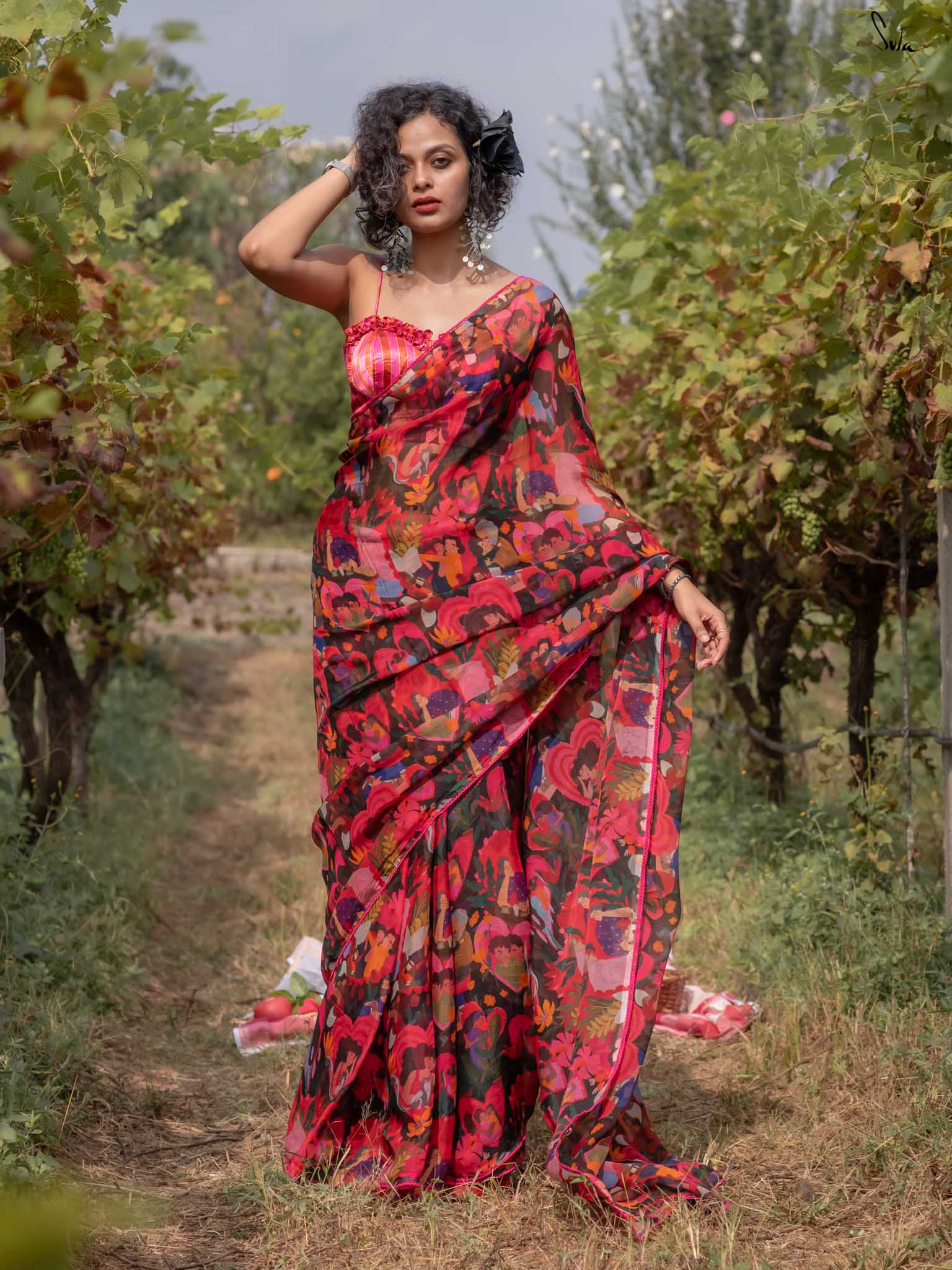 In a world where love takes countless forms, Universal Pyaar is a radiant tribute to the many shades of the heart. This multicolored saree crafted from viscose organza beautifully captures the essence of love in all its forms. Cherishing moments in every print: pet love, motherly affection, romantic bonds, and timeless companionship weave together a vivid tapestry of joy, connection, and togetherness. This saree comes with a striped blouse piece attached.