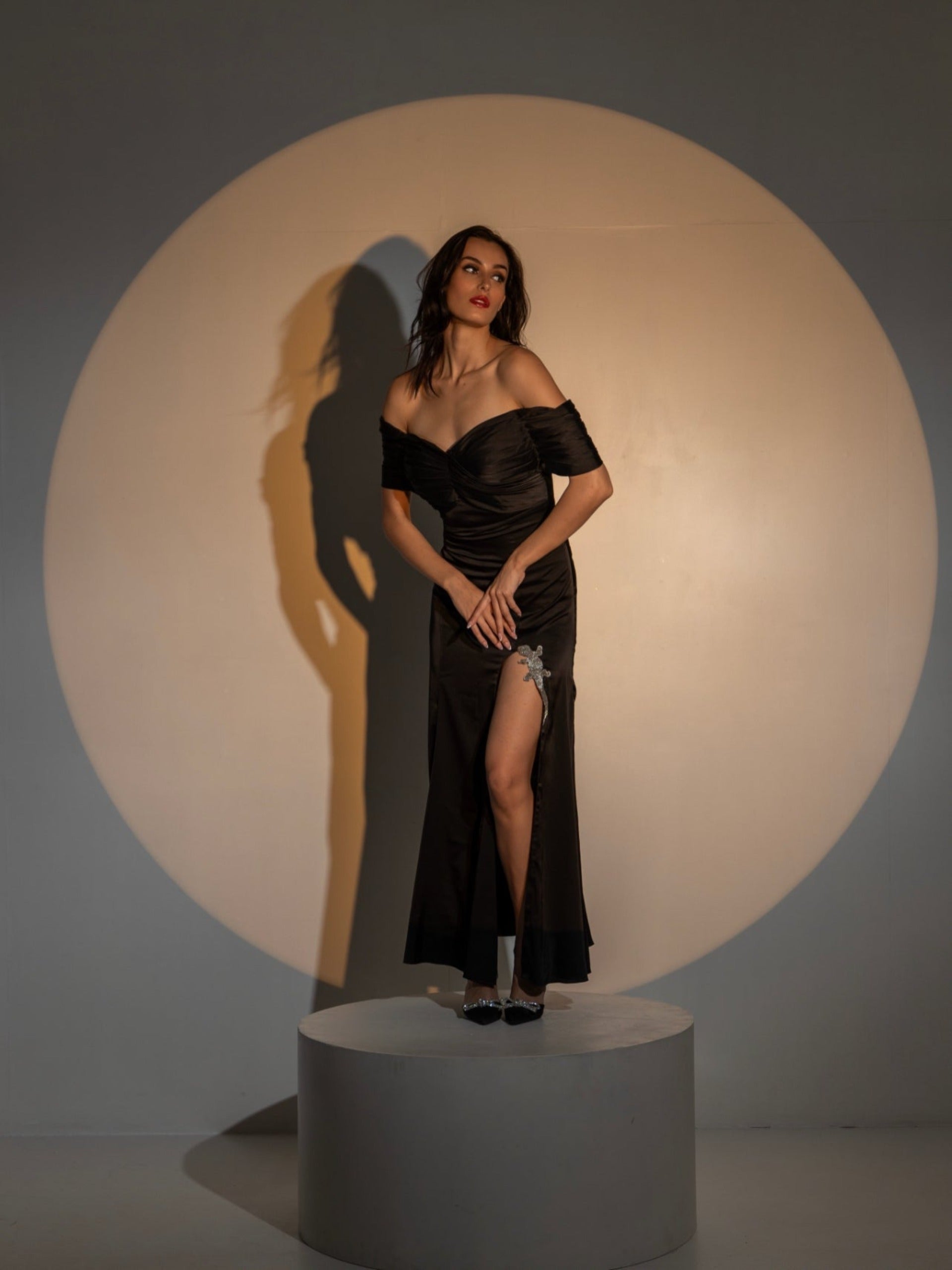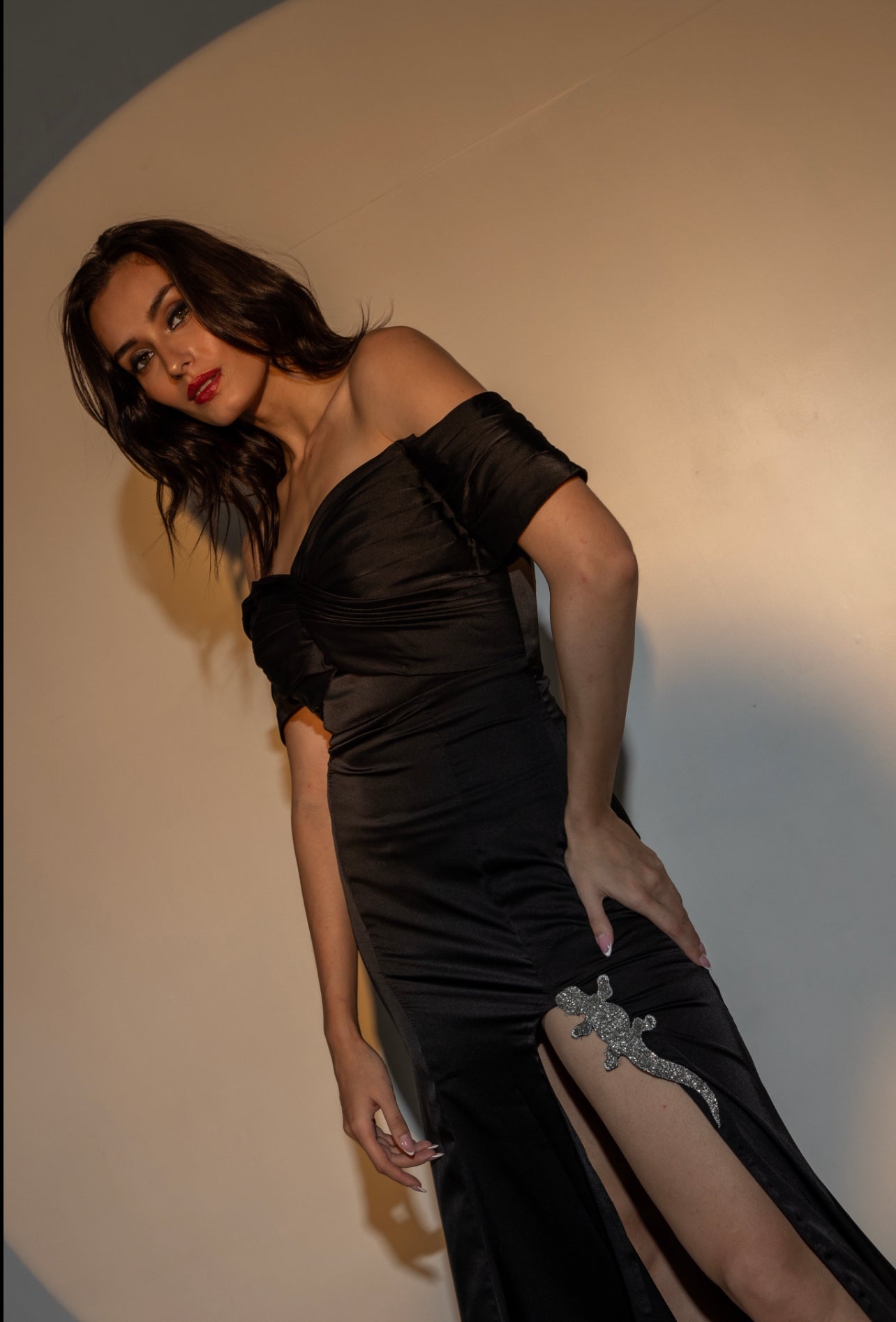 DETAIL- Black colour off shoulder gown with a thigh high slit highlighting a handwork lizard. Padded and back zipper