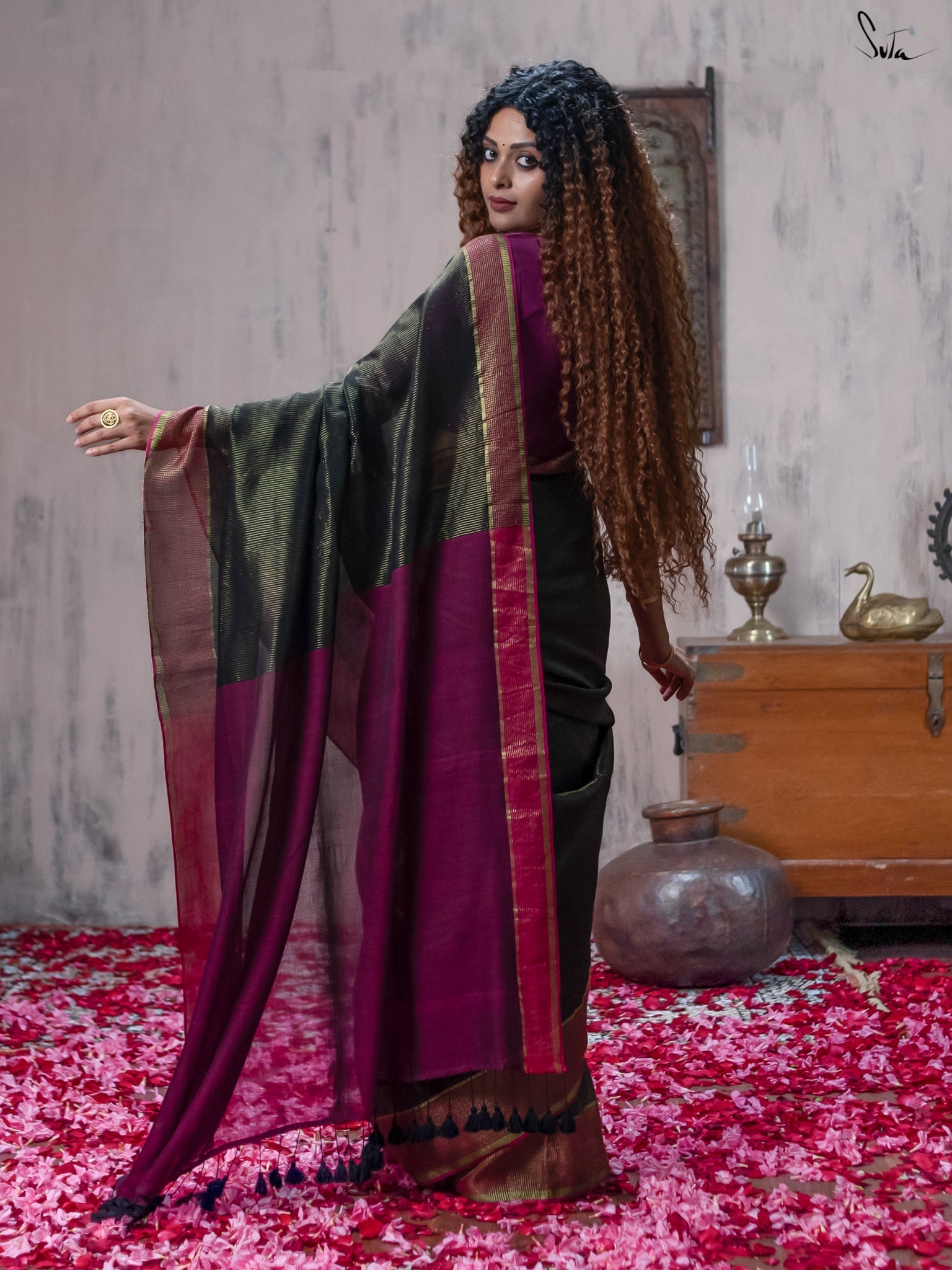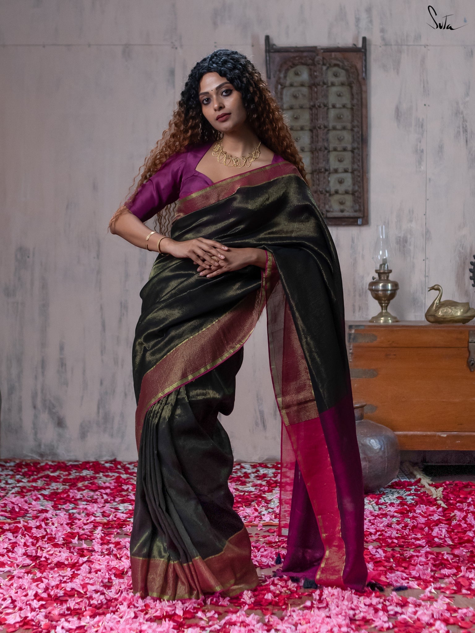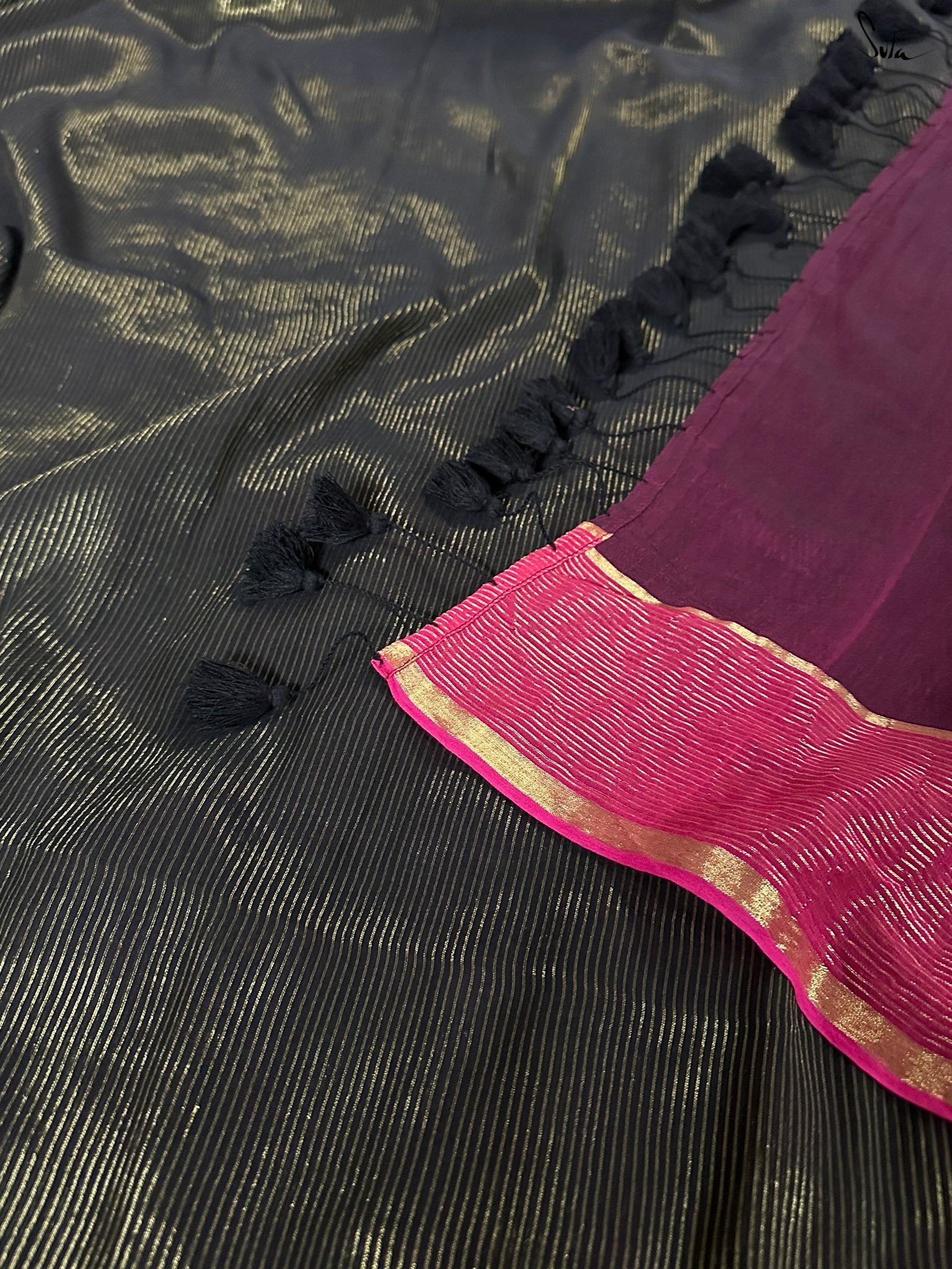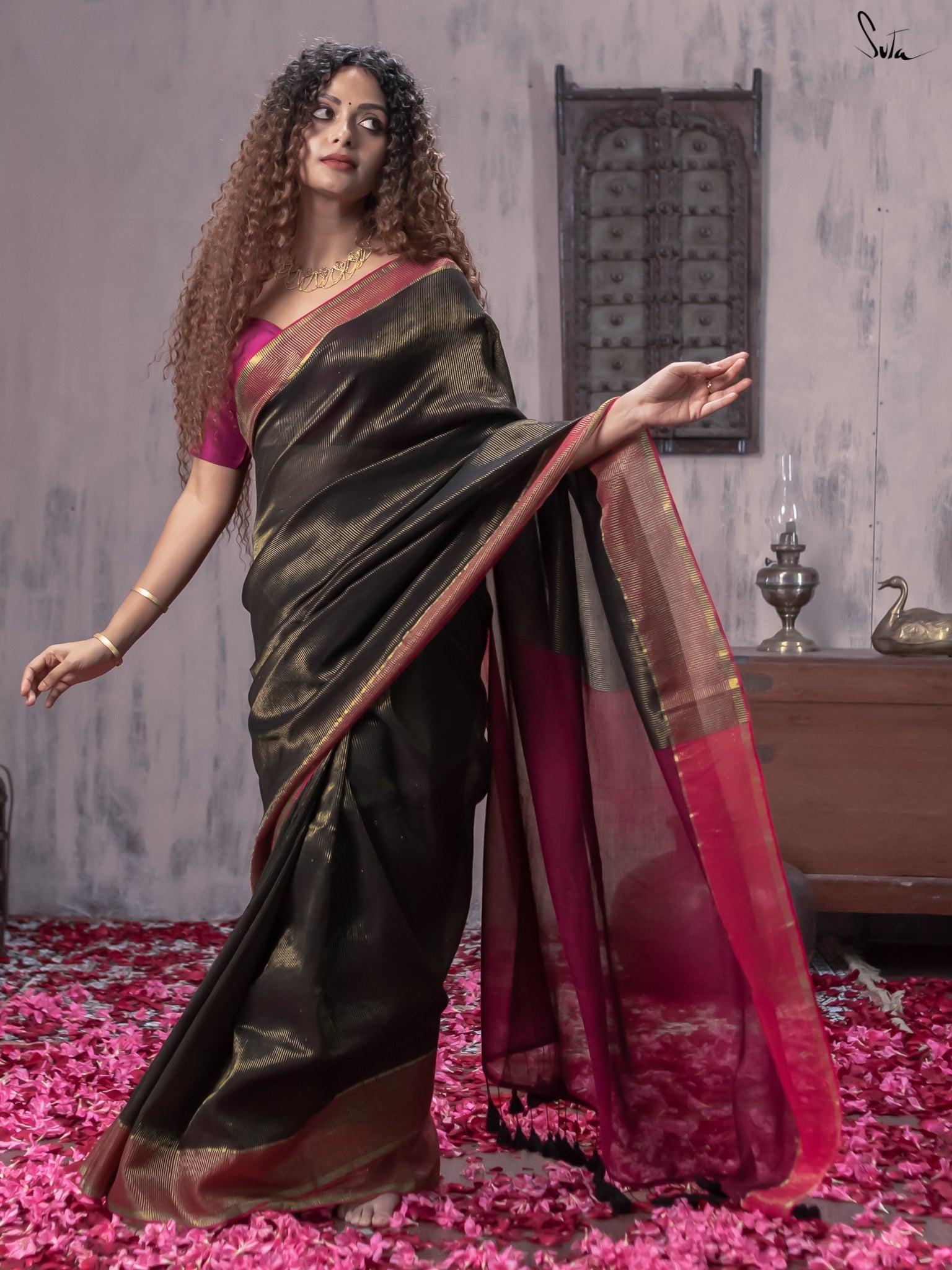 Be as mystical as a moonless night, when you wear this enchanting black saree thats made of light-as-air mul-mul cotton and infused with shimmering zari.
