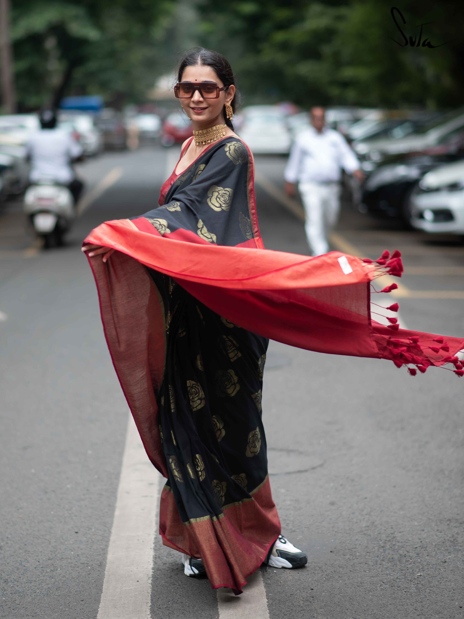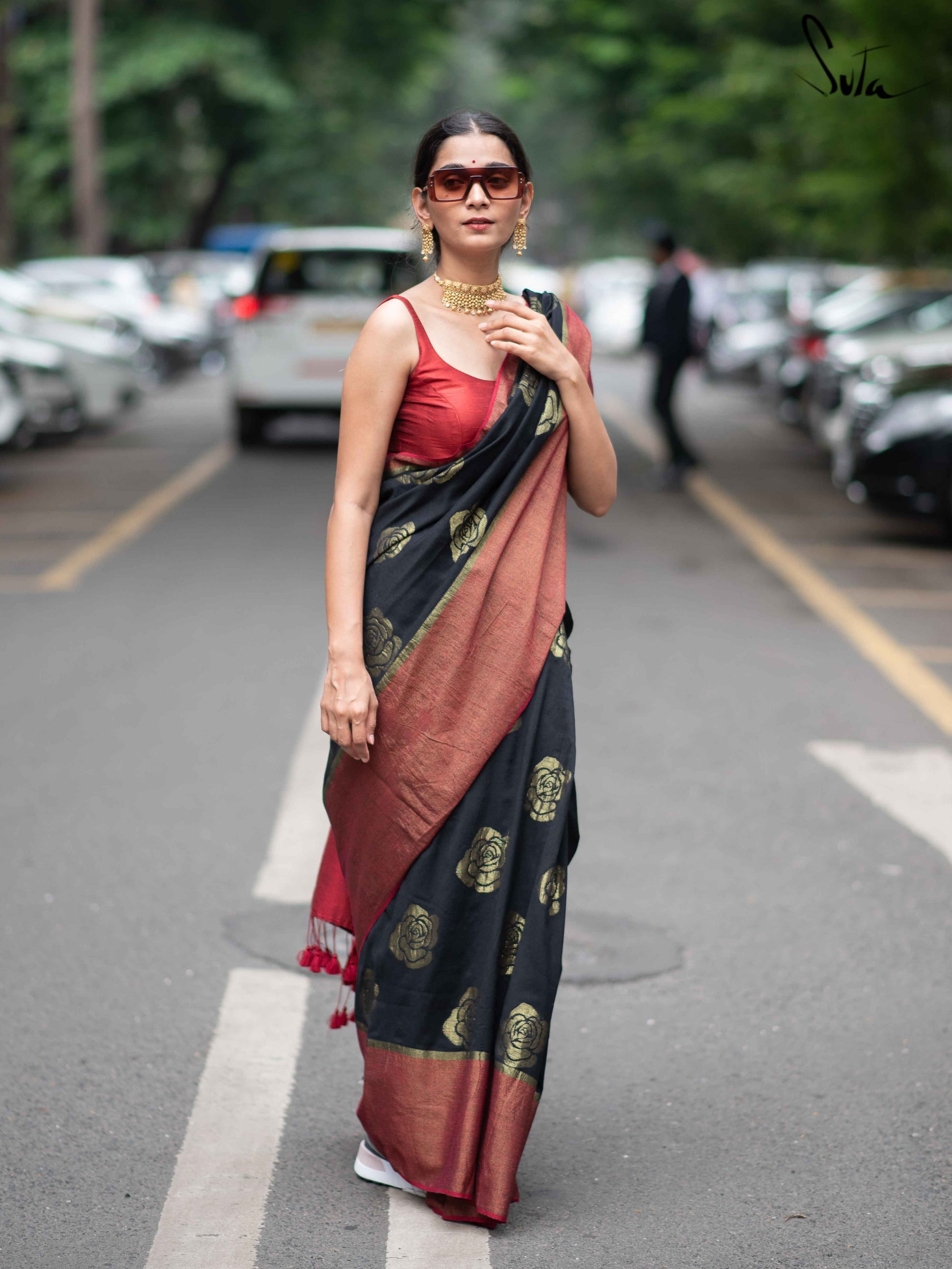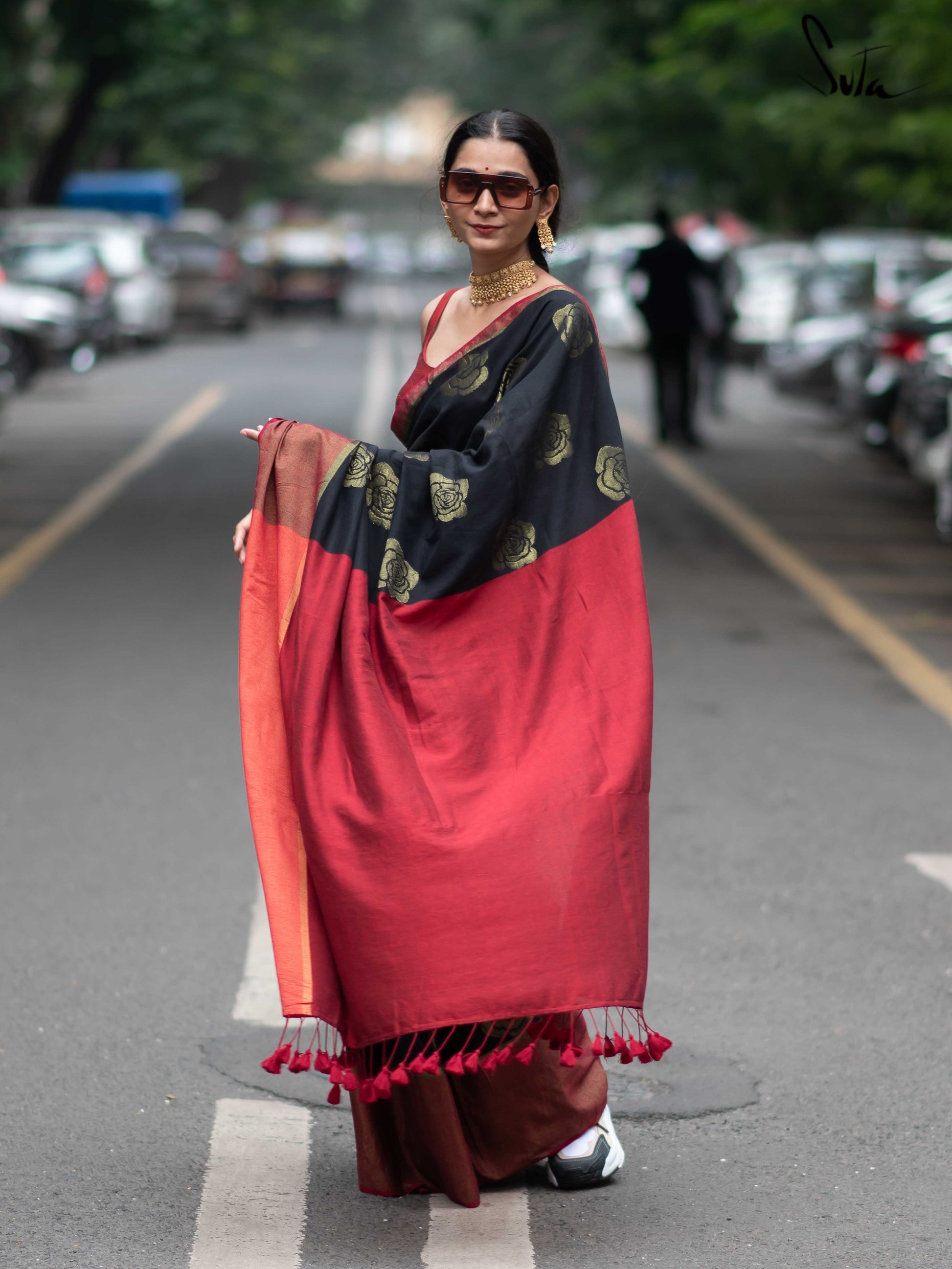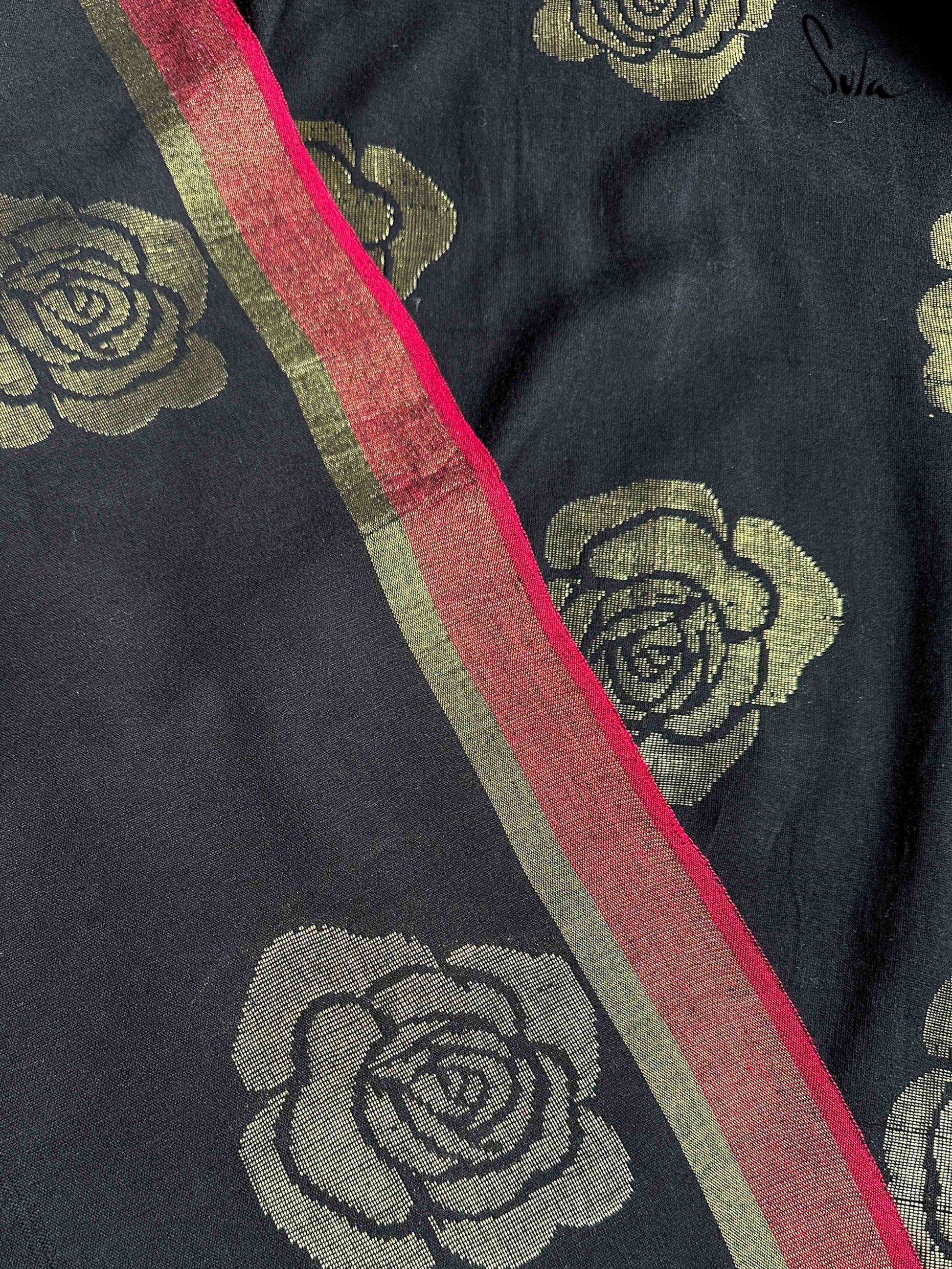 Win hearts in our black and red saree made of cotton and acrylic, embellished with opulent zari and rose motifs.