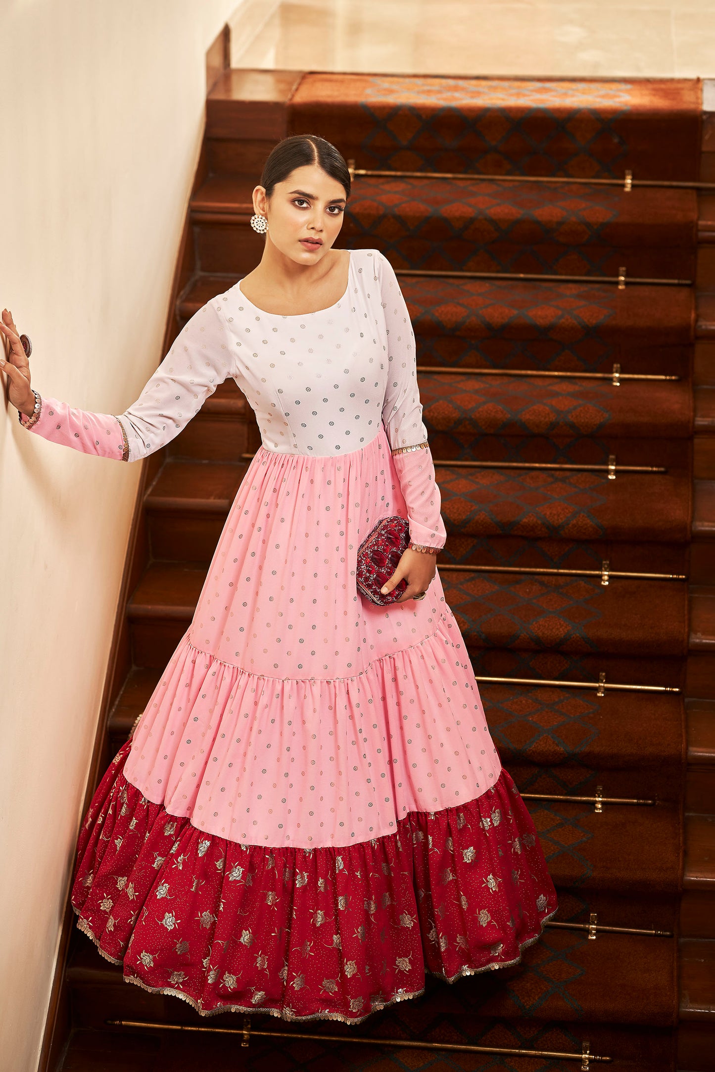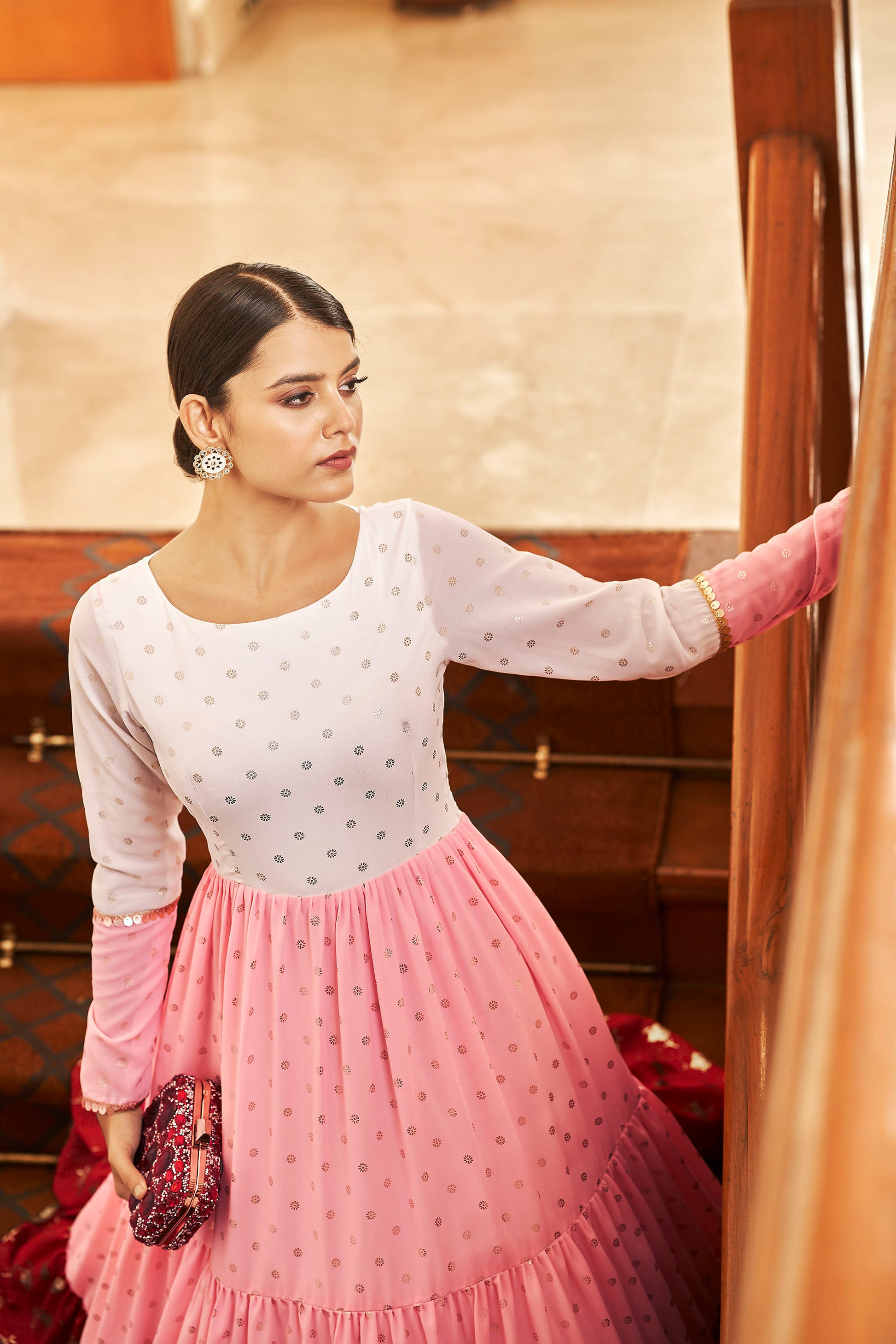 White and Pink Georgette Metalic Foil Work Partywear Gown