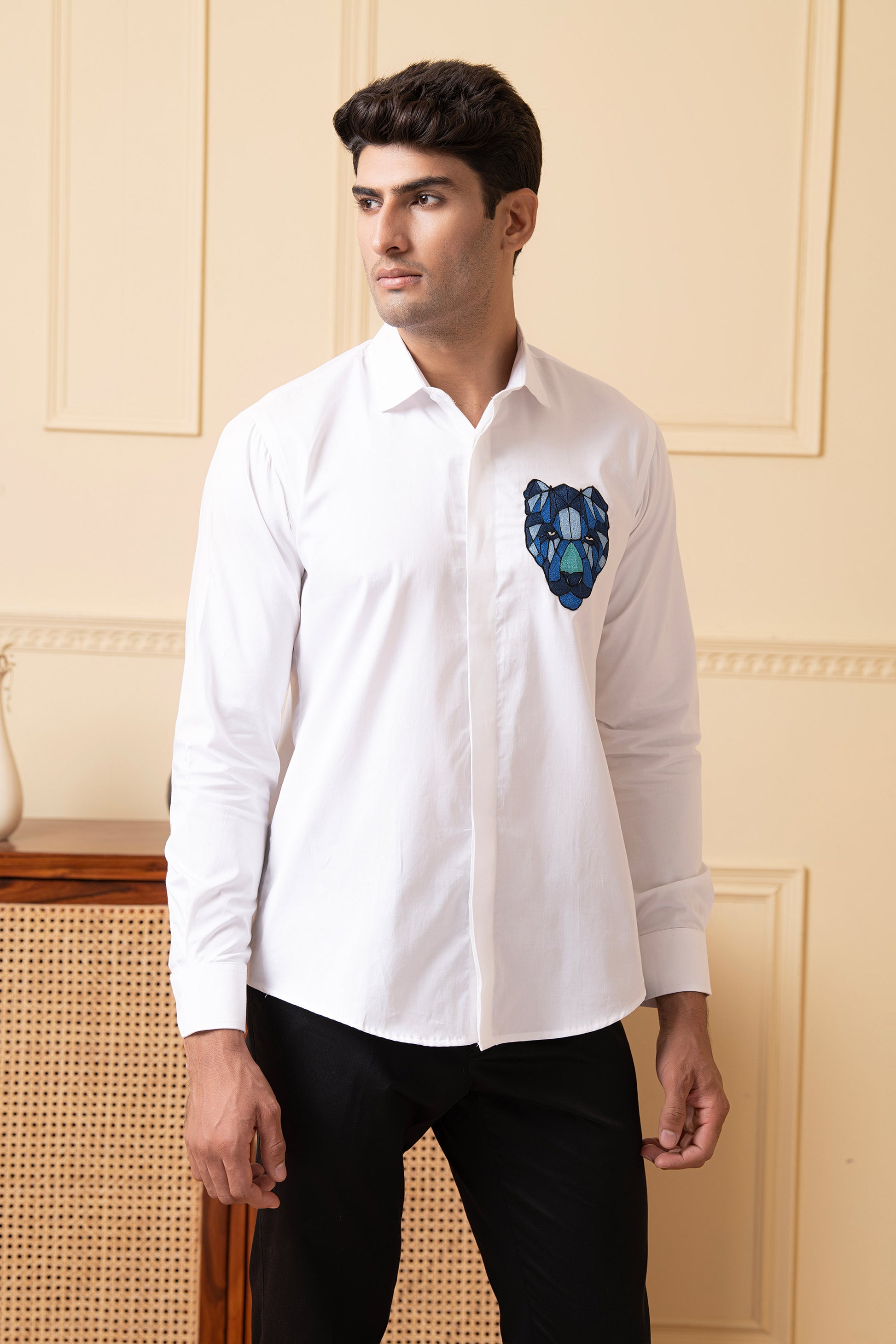 White Giza Cotton Fierce Panther Embroidered Shirt