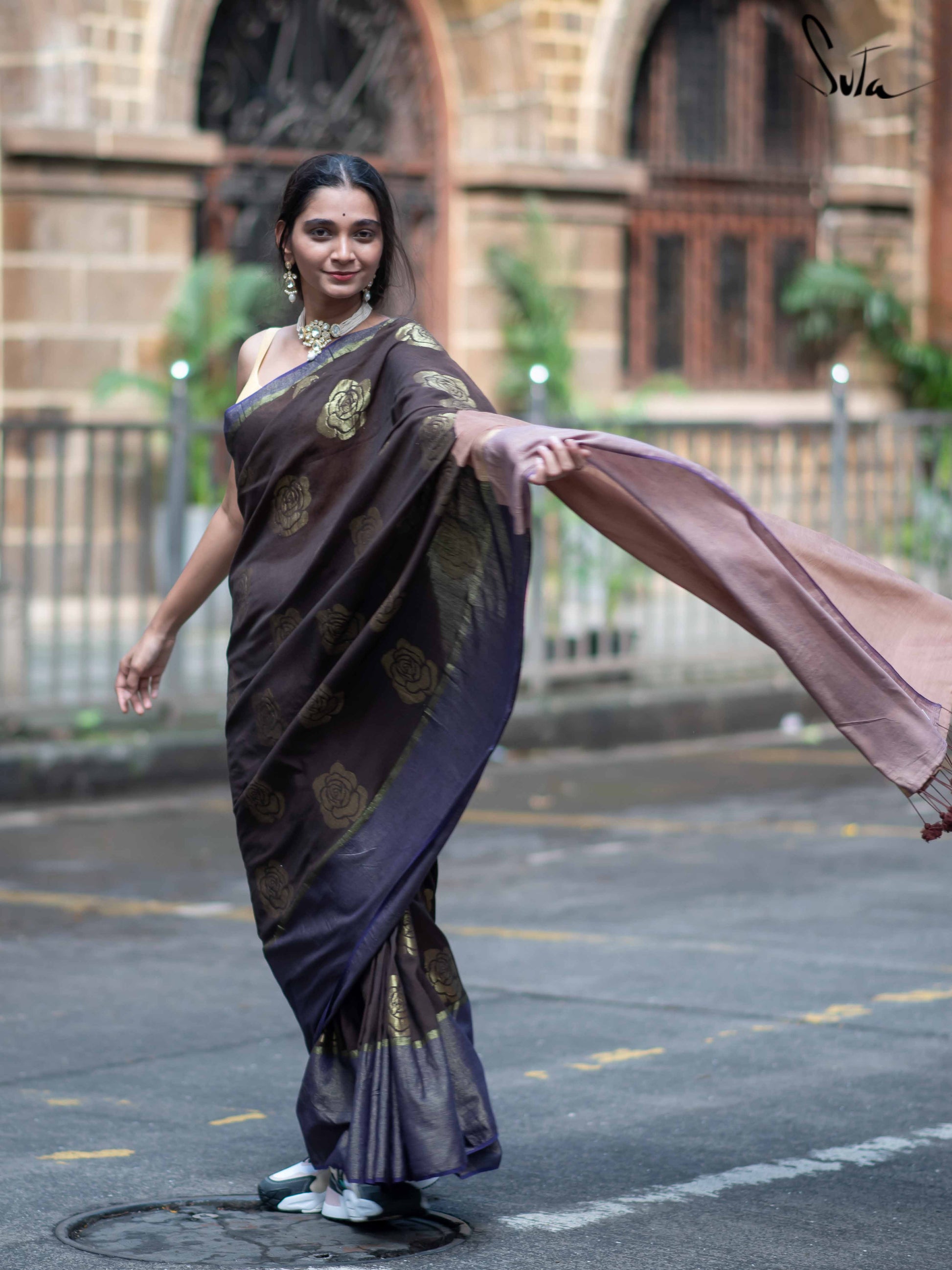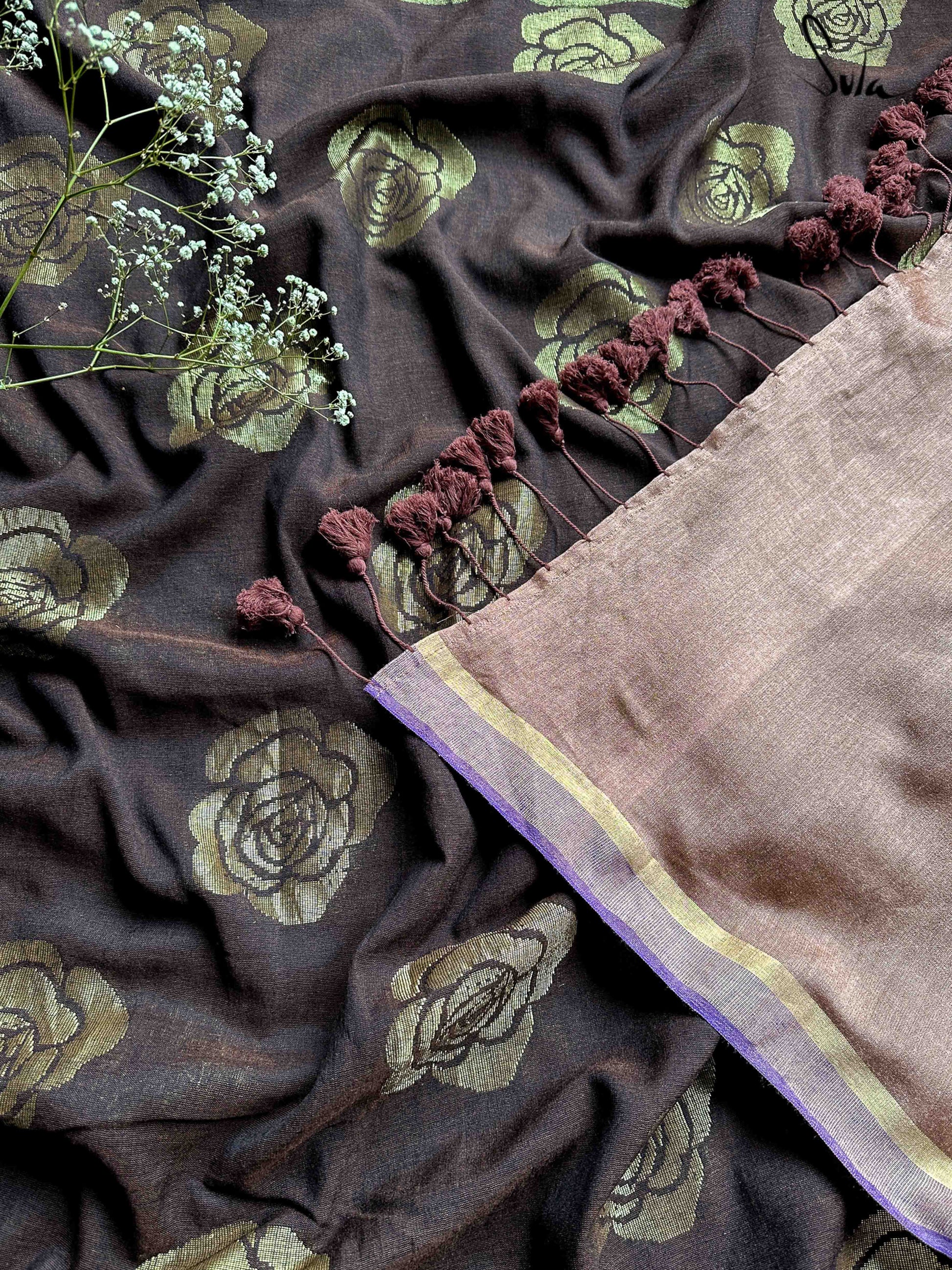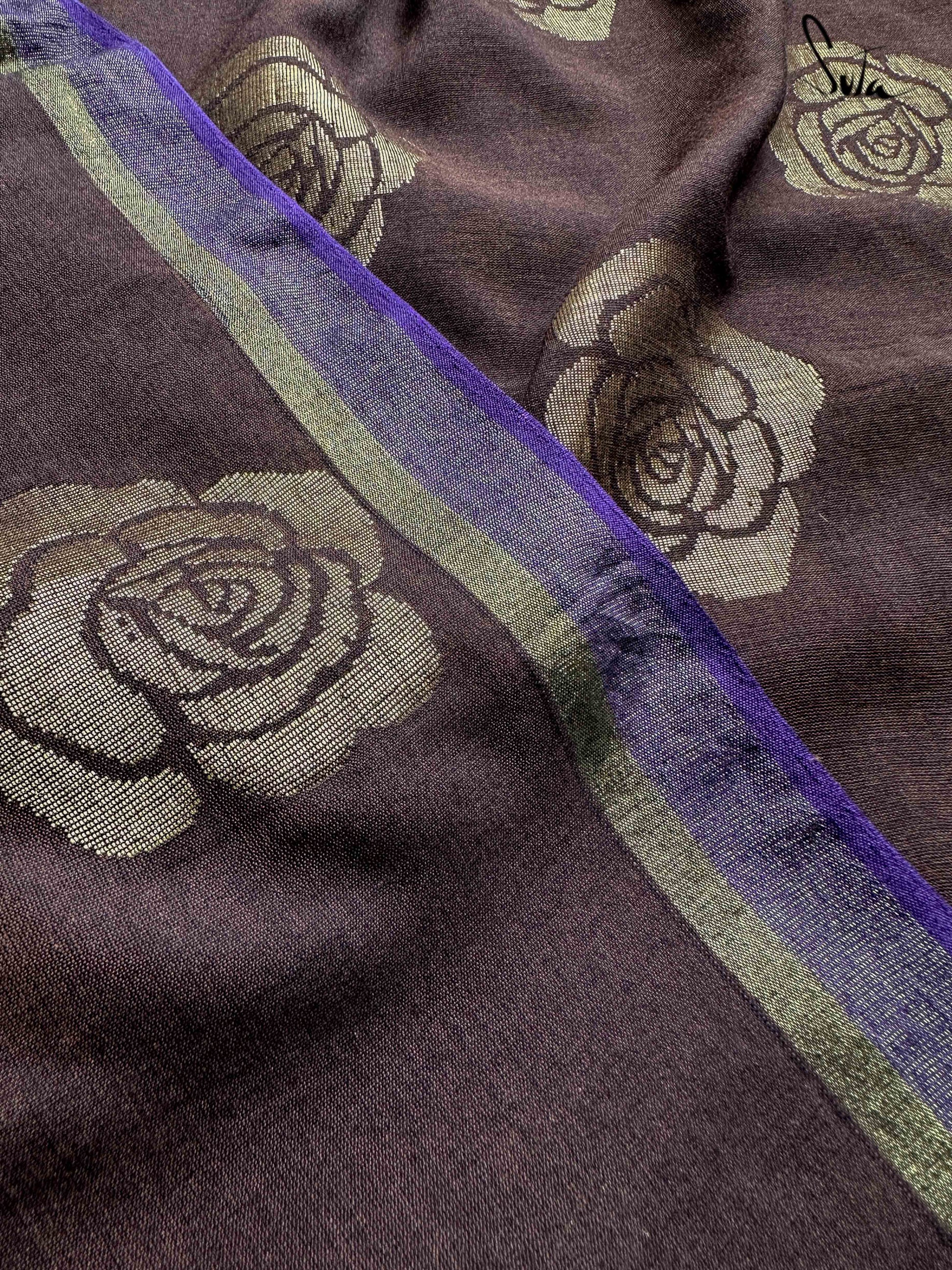 Let your unwavering faith find a new home in Sutas brown and purple saree made of cotton and acrylic, embellished with zari roses.