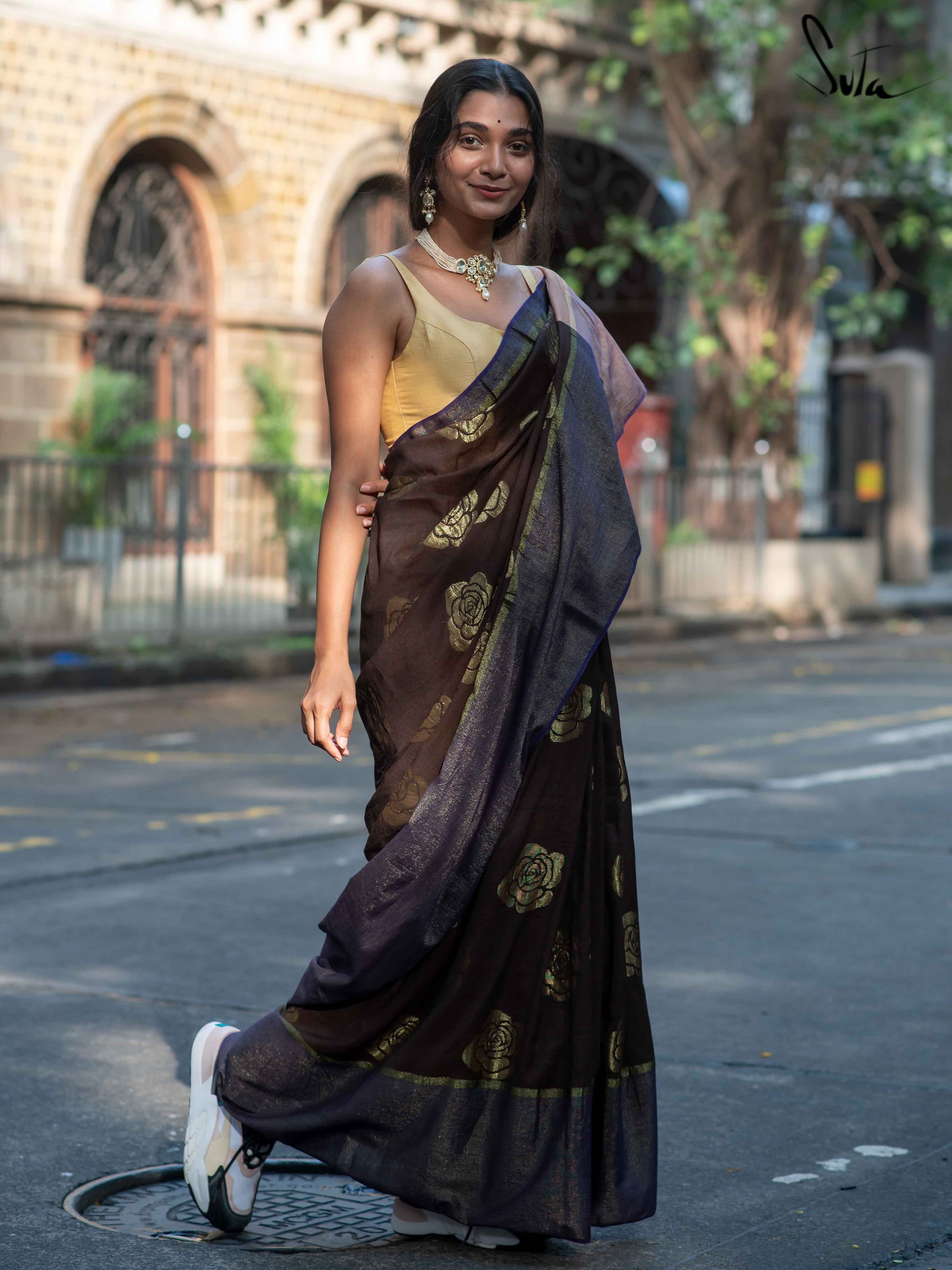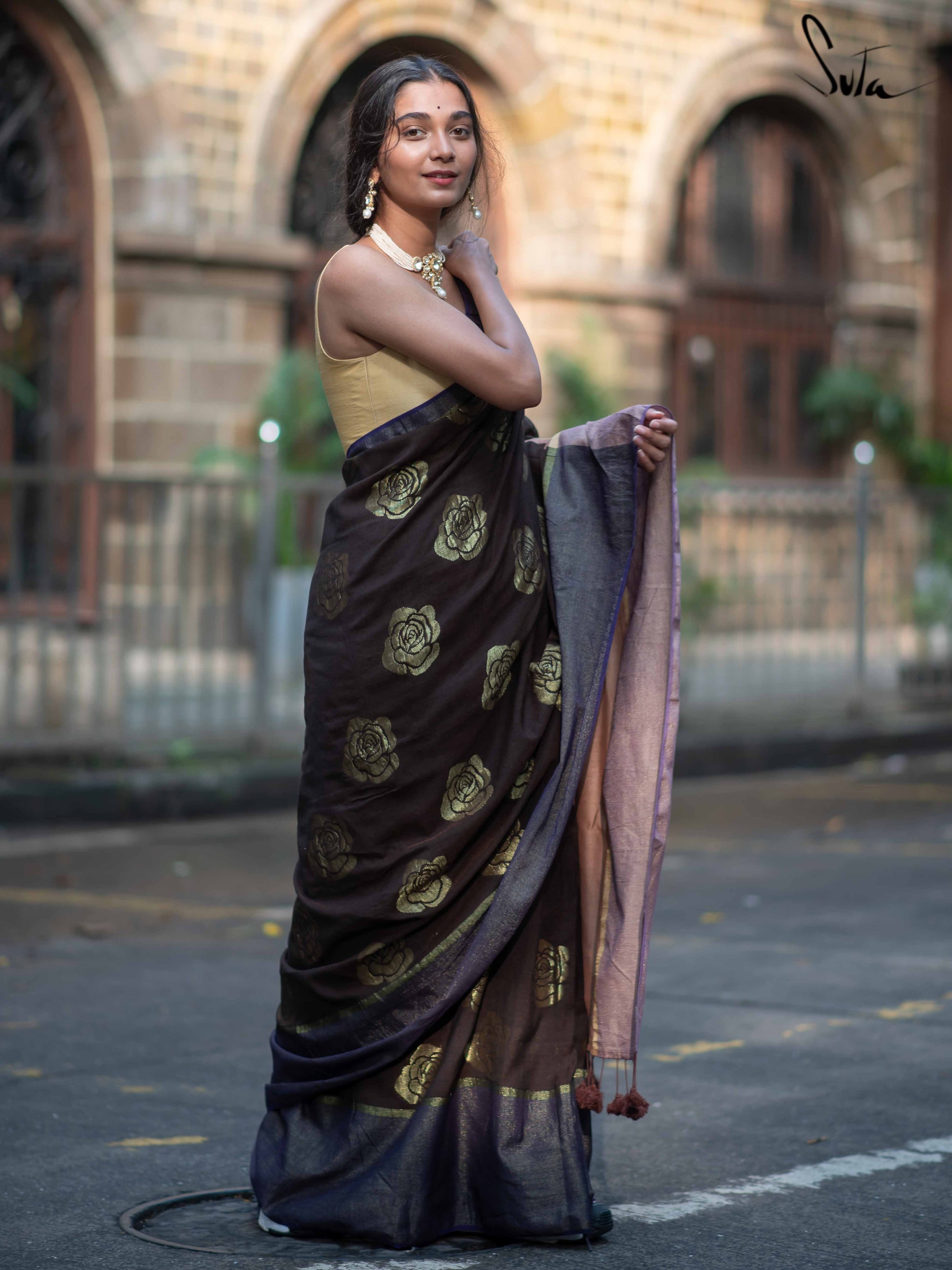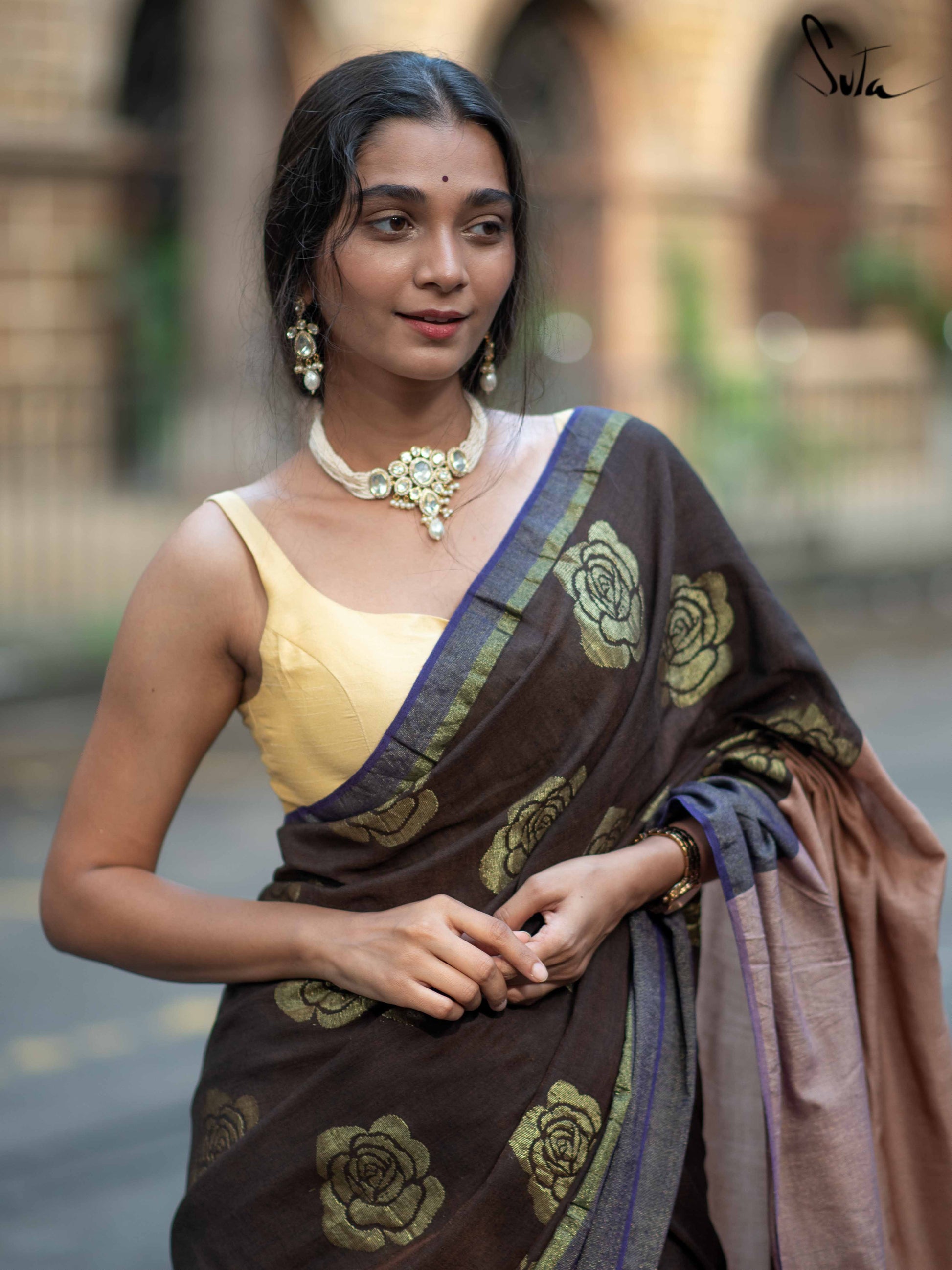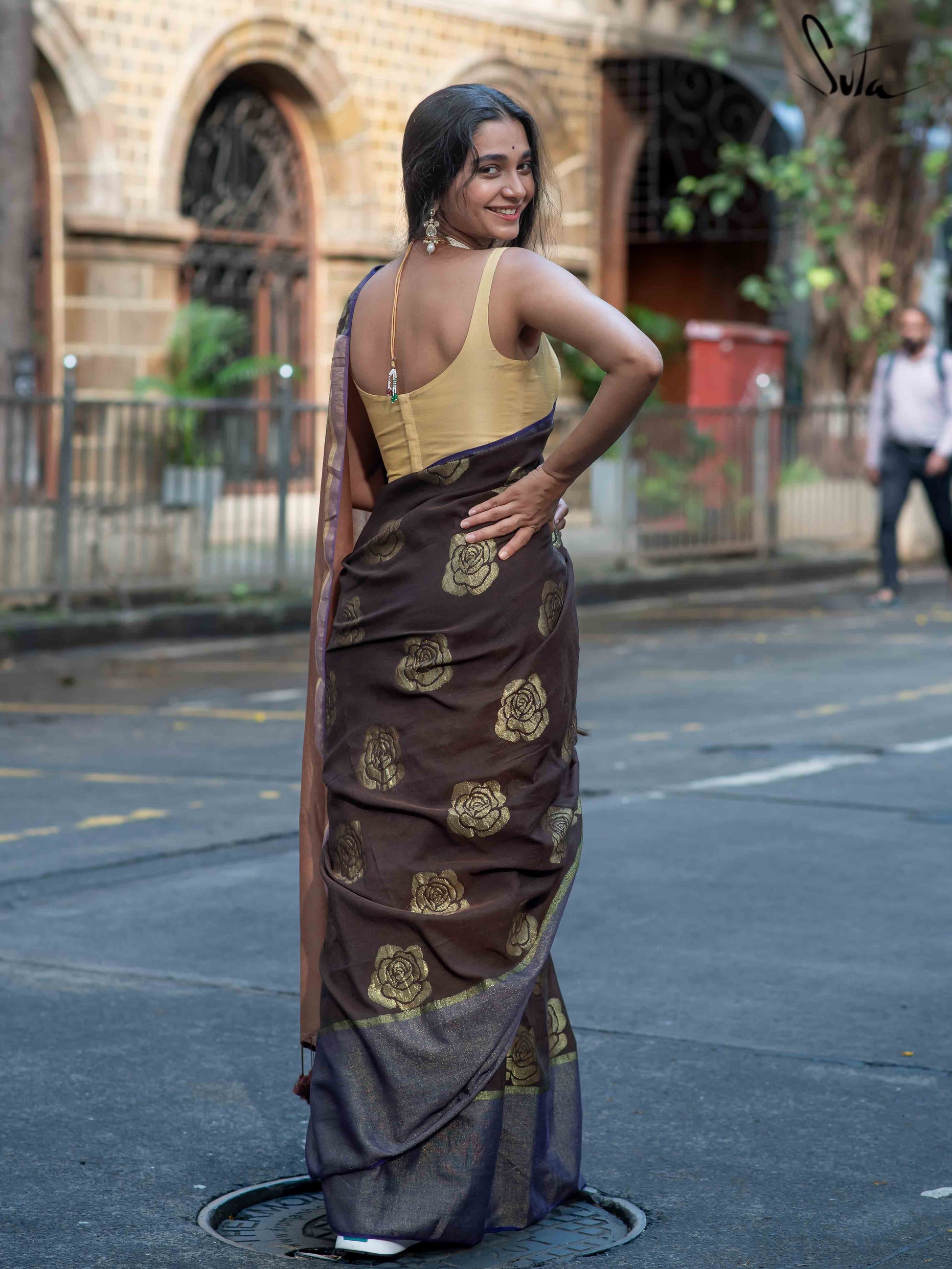 Let your unwavering faith find a new home in Sutas brown and purple saree made of cotton and acrylic, embellished with zari roses.