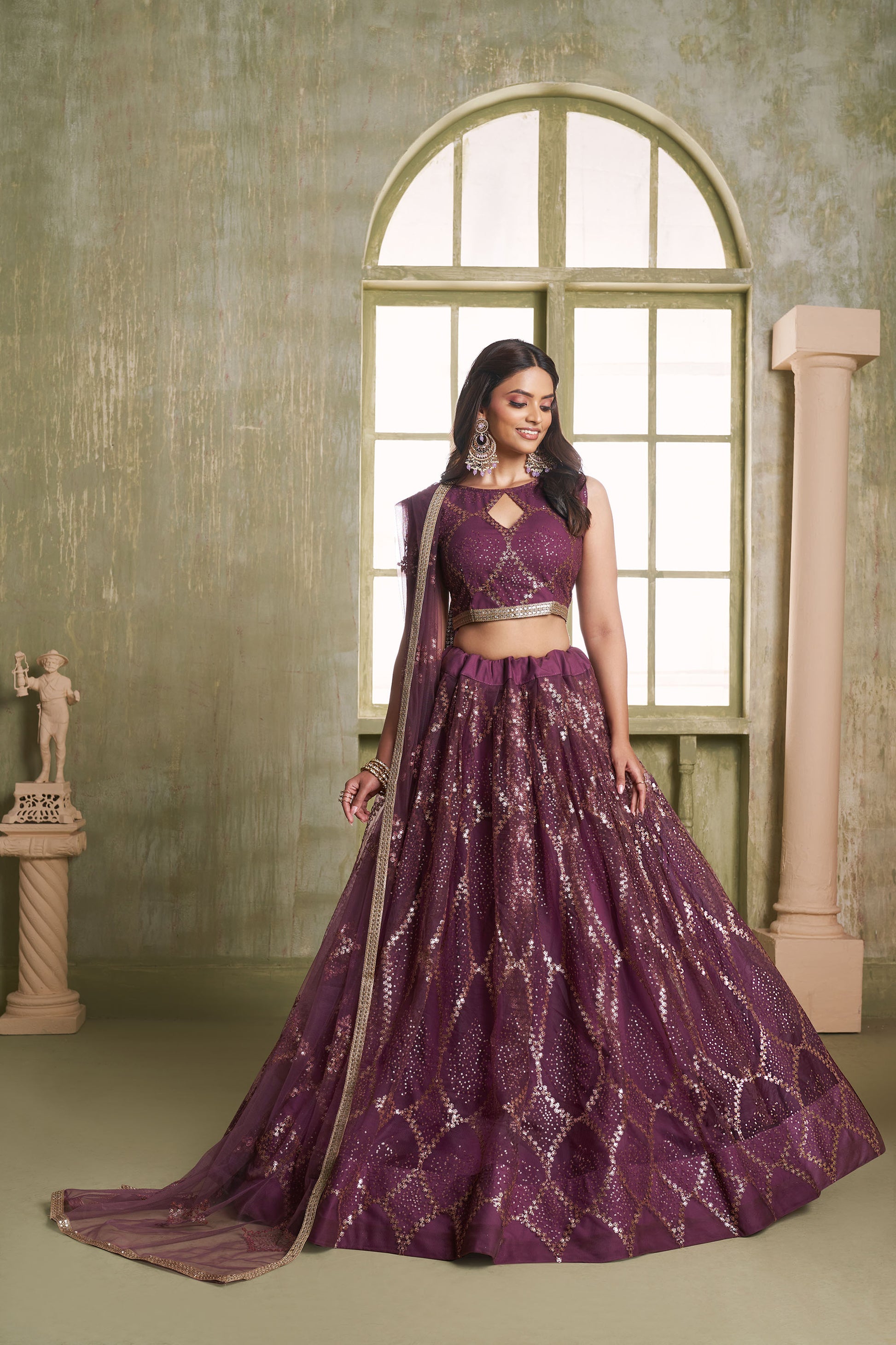 Looking for something a little out of the ordinary? We've got just the thing! This Wine Butterfly Net Thread & Sequin Work Reception Lehenga is perfect for those who want to make a statement. With its beautiful sequins embroidery and wine color, this lehenga is sure to make you the center of attention. A Bridesmaid would look gorgeous in this outfit. It is suitable for any occasion, such as weddings, receptions, engagement parties, and sangeets. So don't wait any longer, add this Wine Butterfly Net Thread & Sequin Work Reception Lehenga to your wardrobe today!