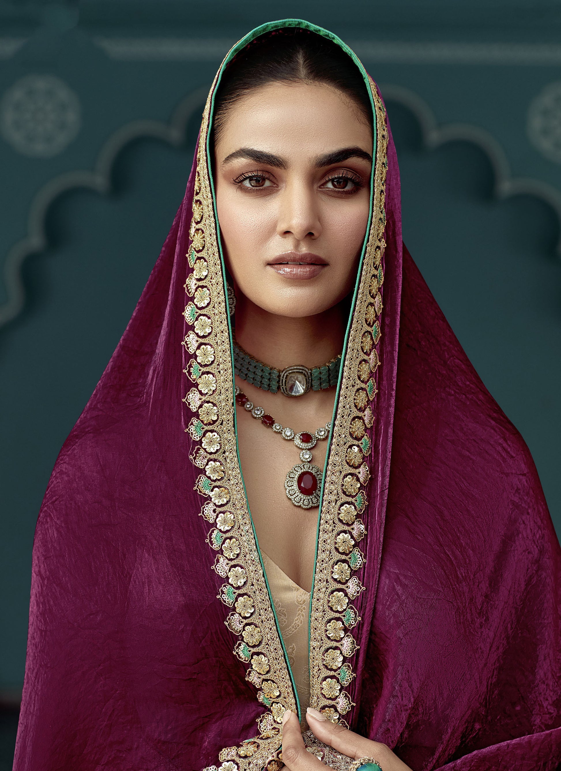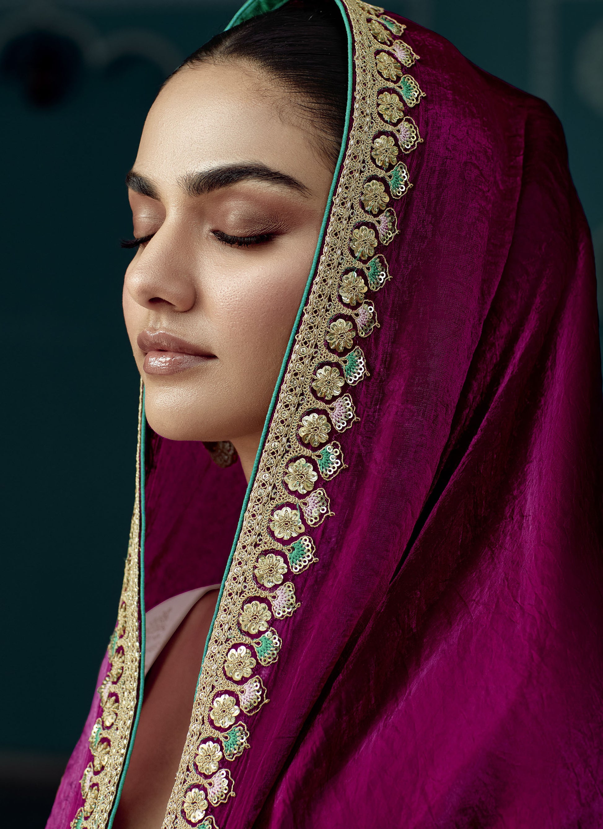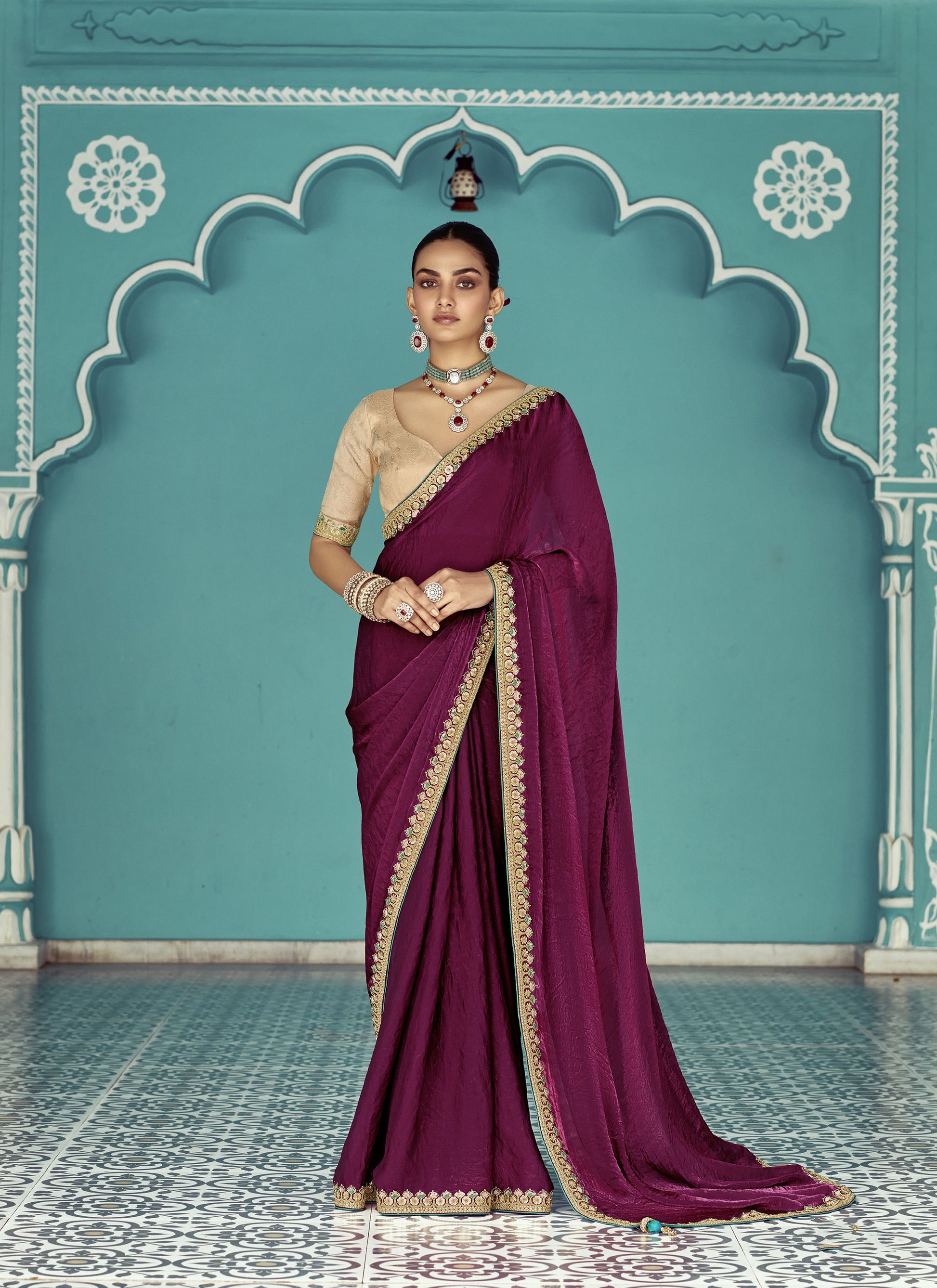Wine Glass tissue Organza & Crush Moti Embroidered Festive Amber Saree