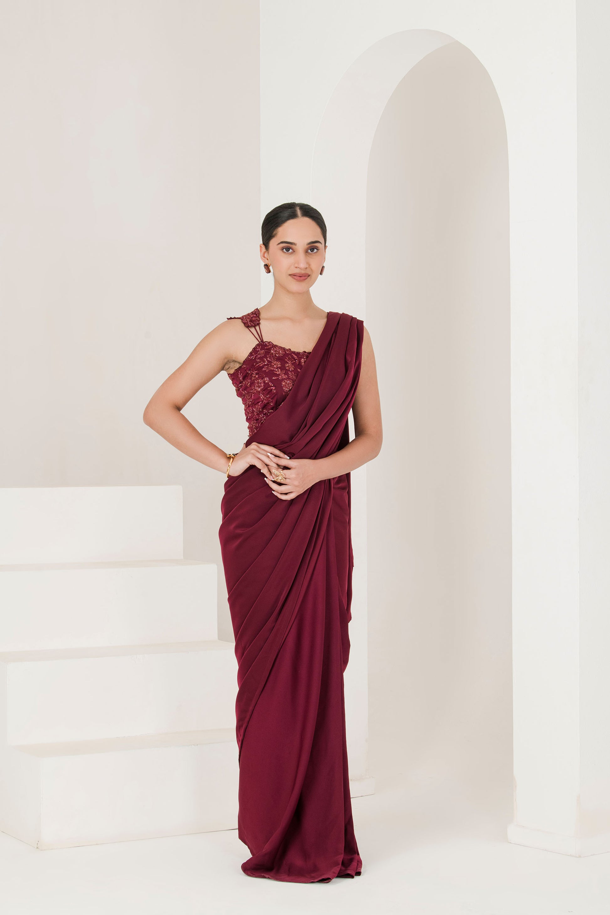 Step into a world of ethereal elegance with this wine pre-stitched draped saree, paired with a bustier style blouse.The saree is made from rich silk satin fabric,adorned with intricate handwork embroidery featuring same coloured cutdana beads.Perfect for weddings, cocktail parties, or festive gatherings, this statement ensemble ensures you make an unforgettable impression while feeling effortlessly chic.