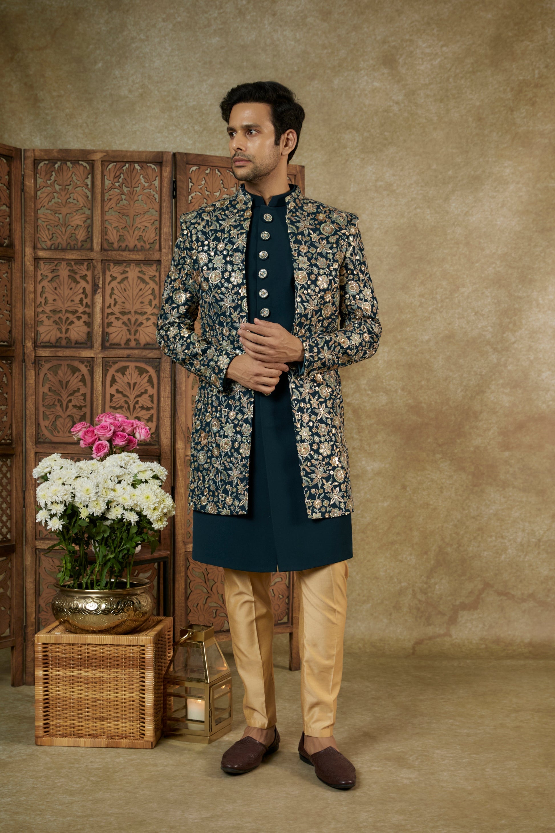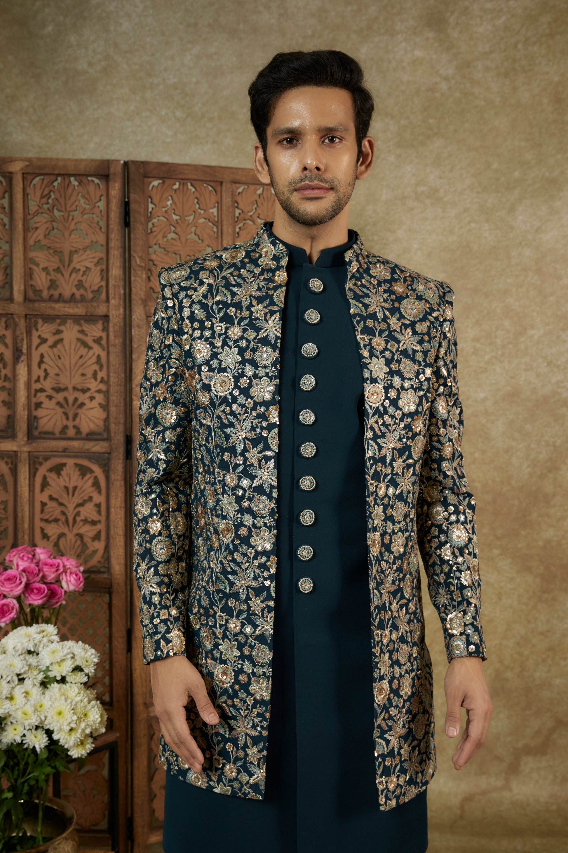 YALE BLUE GEORGETTE SEQUINNED OPEN INDOWESTERN SET