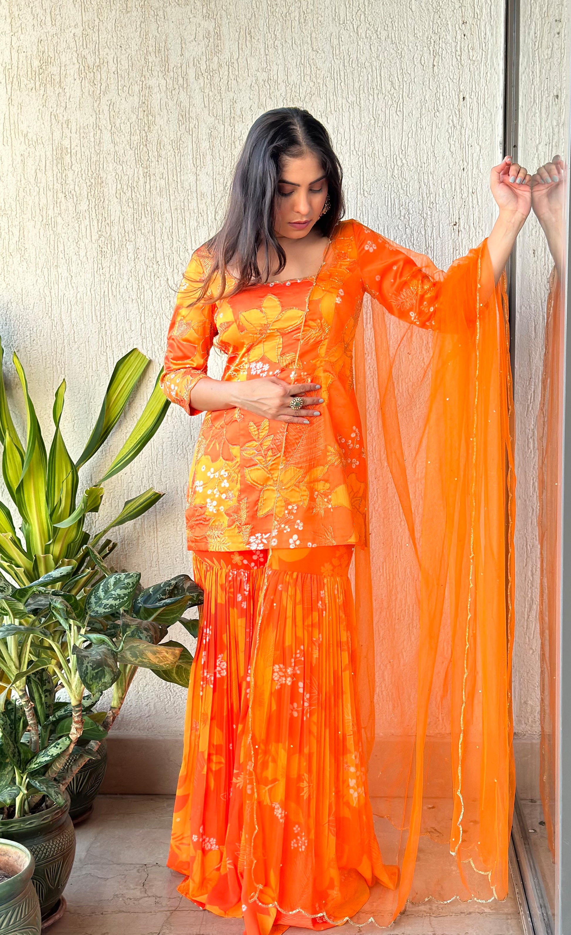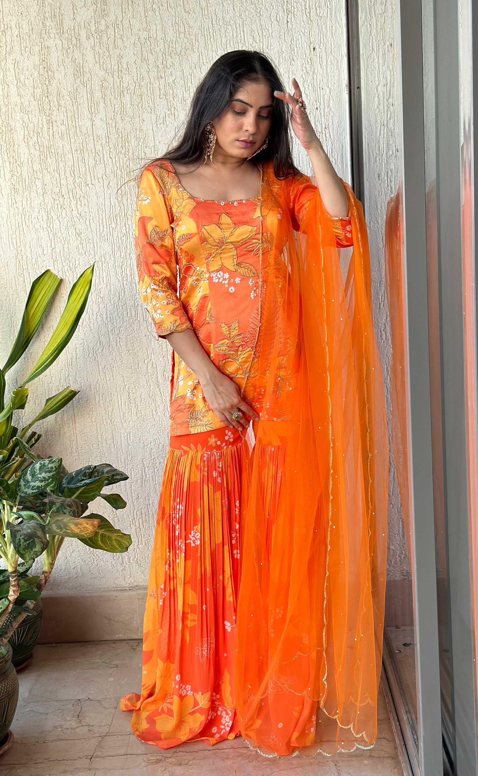 Yellow/orange scoop scallop embroidered kurti with matching sharara and matching net scallop embroidered and sequin chinta on dupatta.