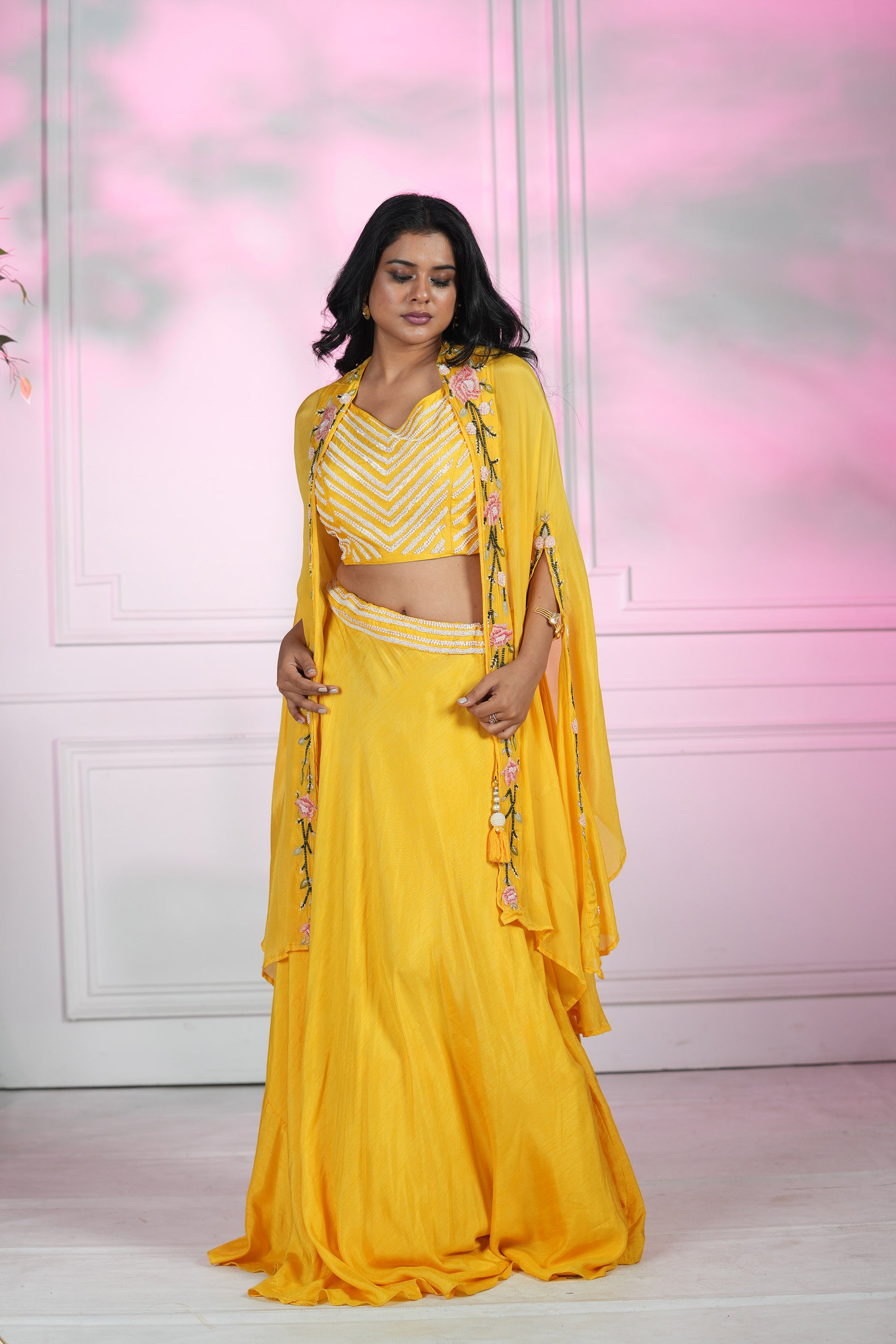 Embroidered Spaghetti & Cape with intricate embroidery pattern & embellished handwork with skirt & embroidered waist belt
