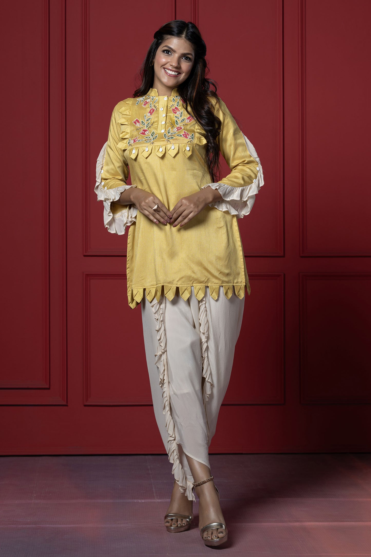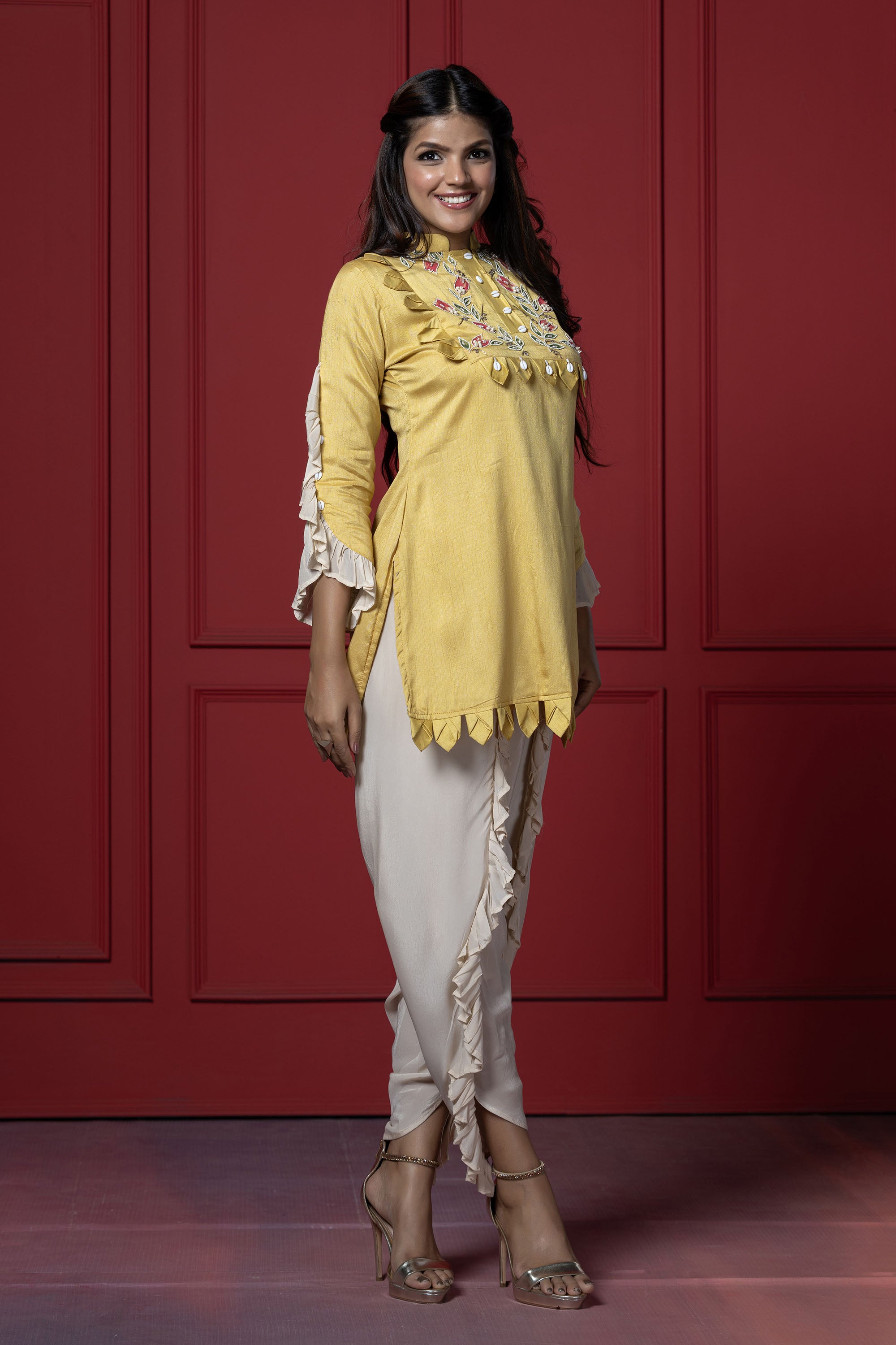 The sleeves are designed in bell pattern that blends well with short kurti and dhoti style pants. To add uniqueness, we have added hand painted motives with cut dana work