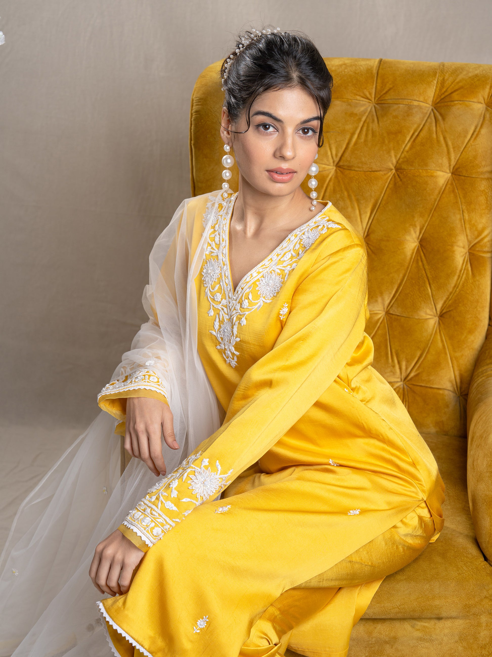 Yellow Kurta Set With Exquisite Neck And Sleeve Embroidery