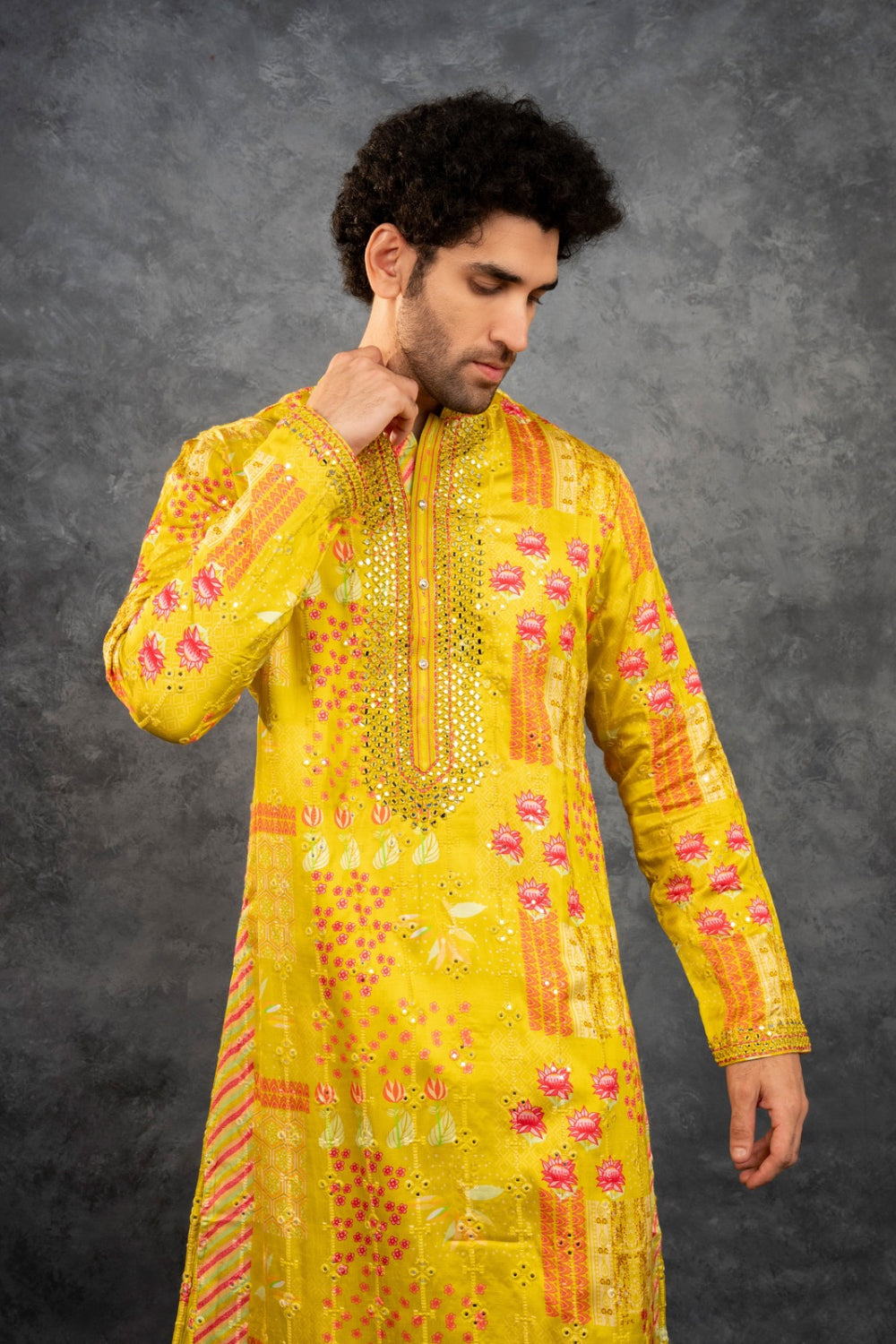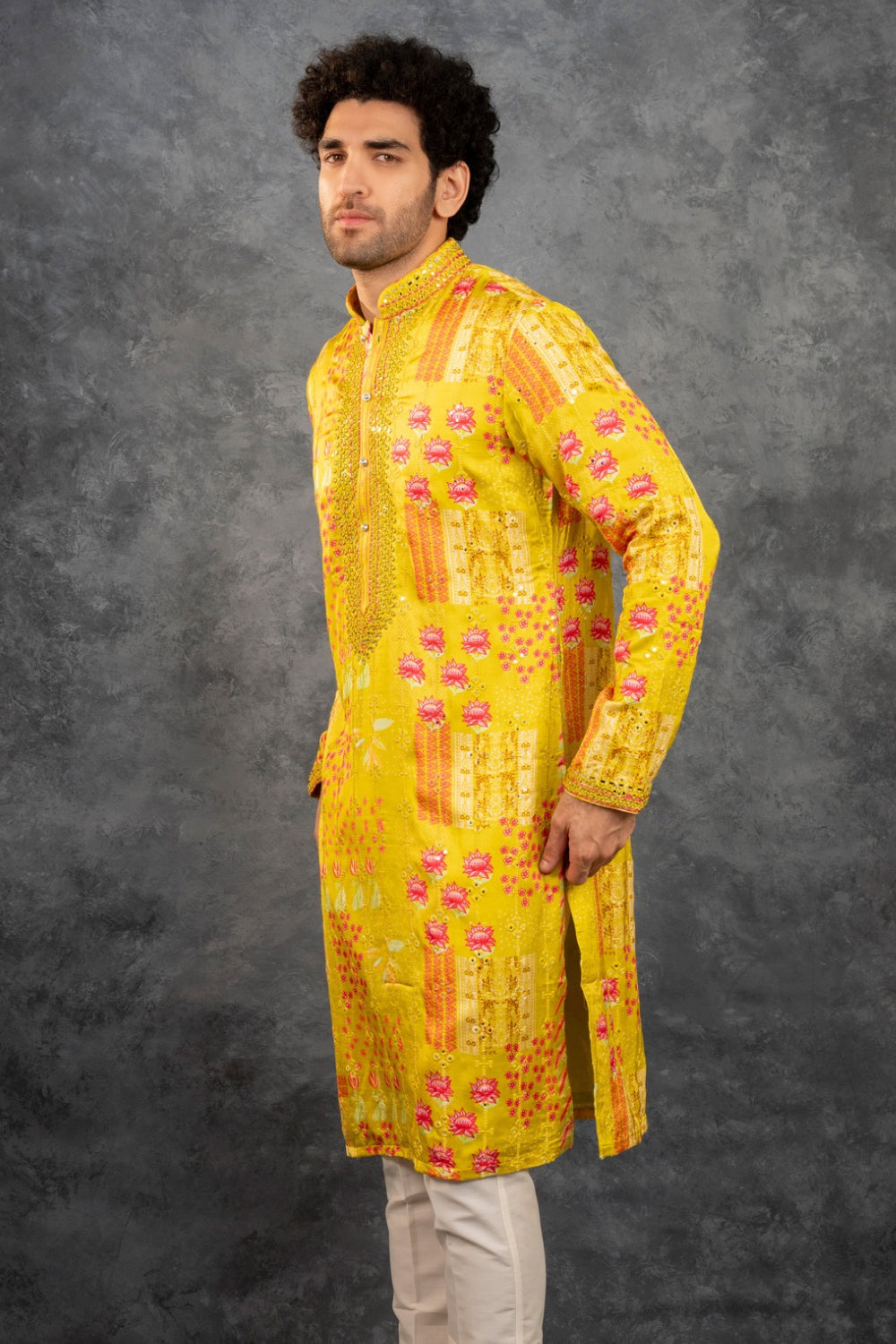 Yellow printed silk kurta set with mirror embroidery