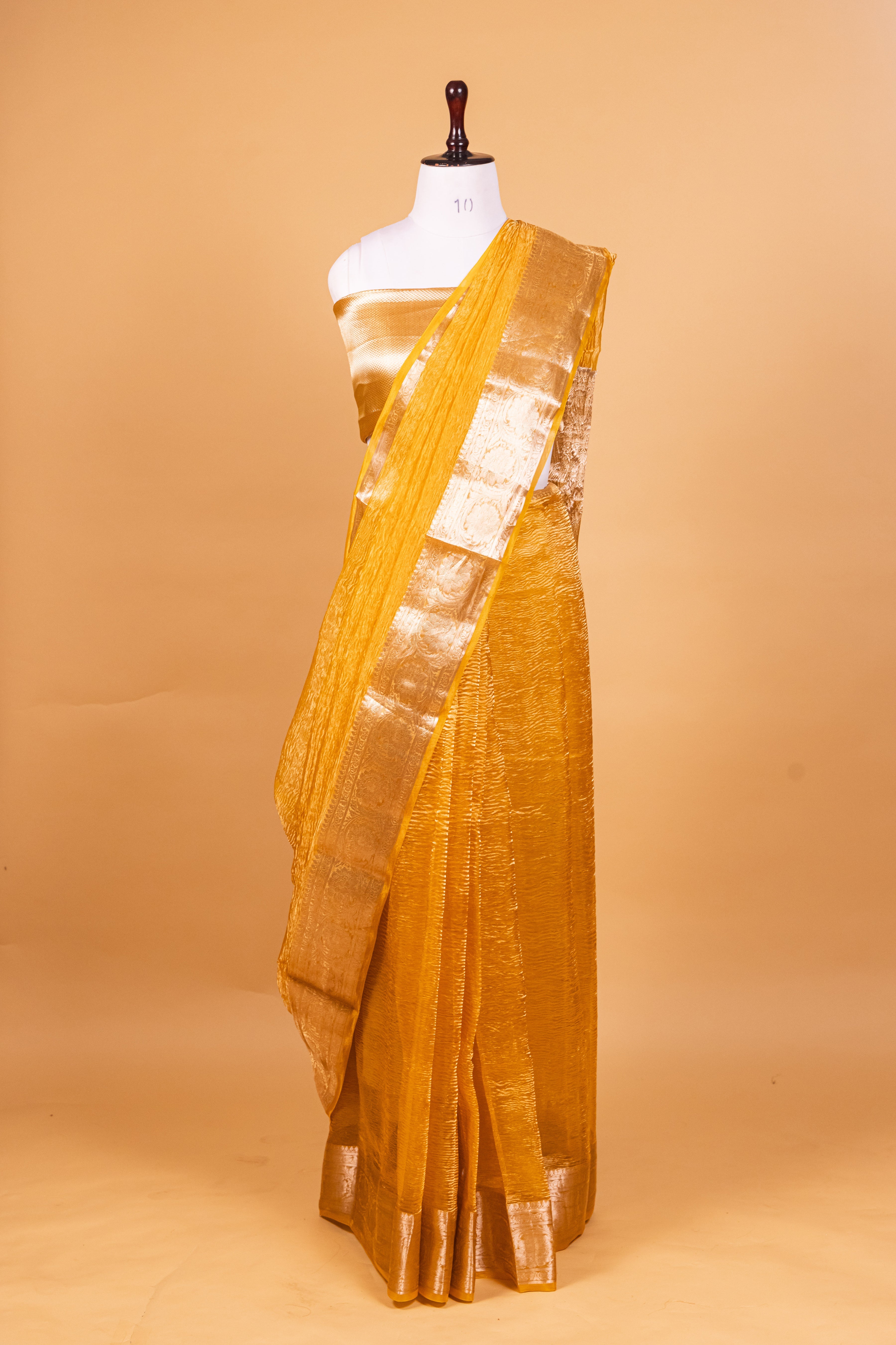 Product Description: Introducing our Yellow Tissue Pure Silk Dyed Saree - the perfect blend of elegance and comfort. Made with pure silk, this saree features a rich yellow color that exudes beauty. Elevate your style and feel confident with this luxurious saree on any occasion.