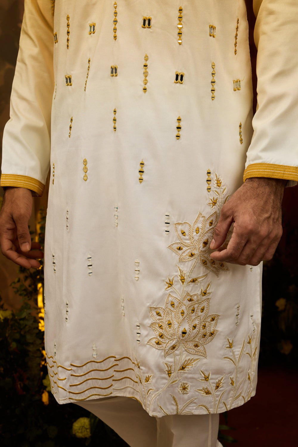 Experience sophistication with the yellow-white ombre silk kurta set. The kurta features beautiful ombre effect along with delicate yellow thread embroidery and subtle mirror work. Paired with a matching white pajama.