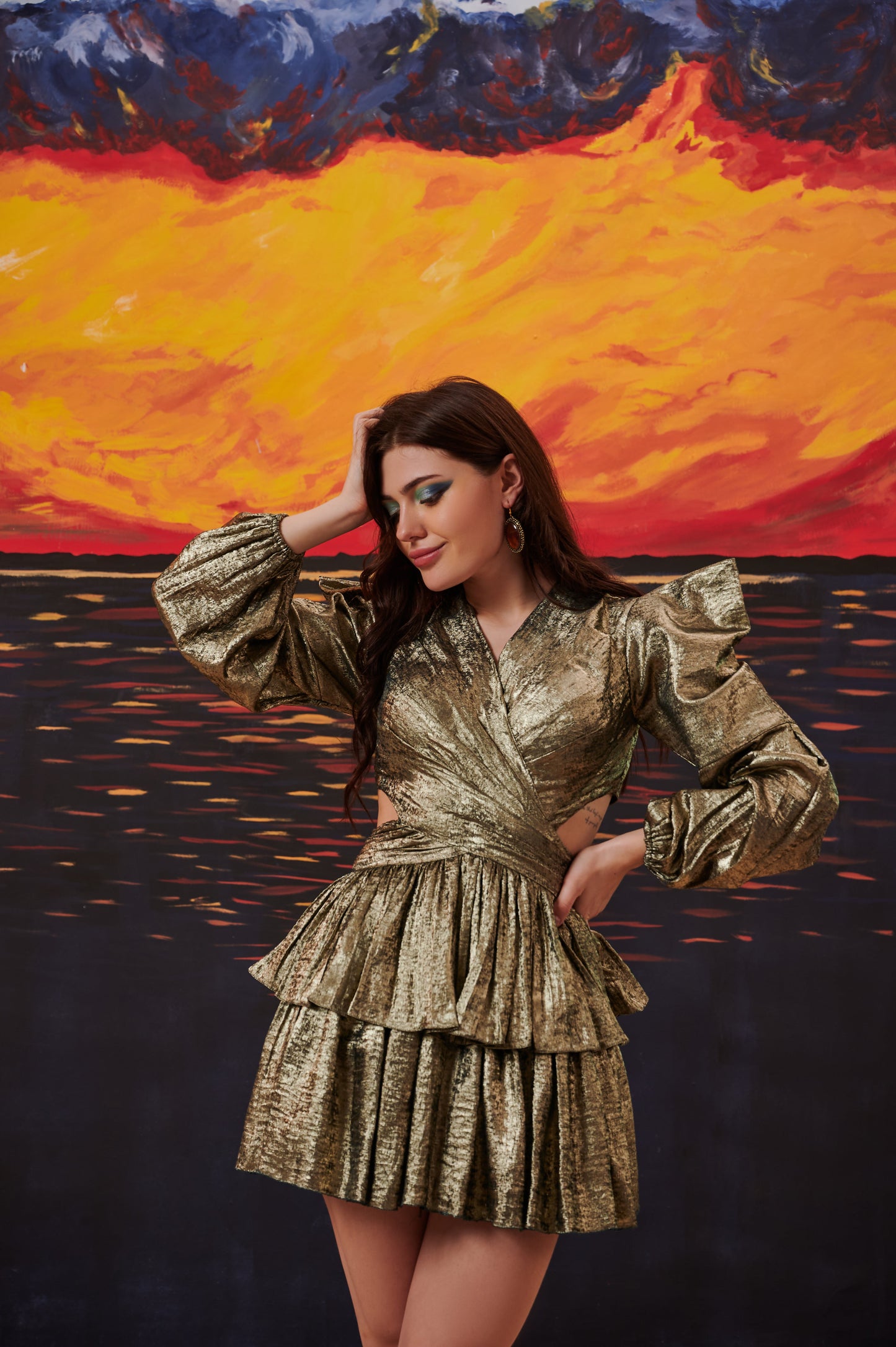 DETAILS- V neck short dress with fitted yok featuring waist cuts going to back along with frilled bottom and extended shoulder full sleeves. Padded and back zip.