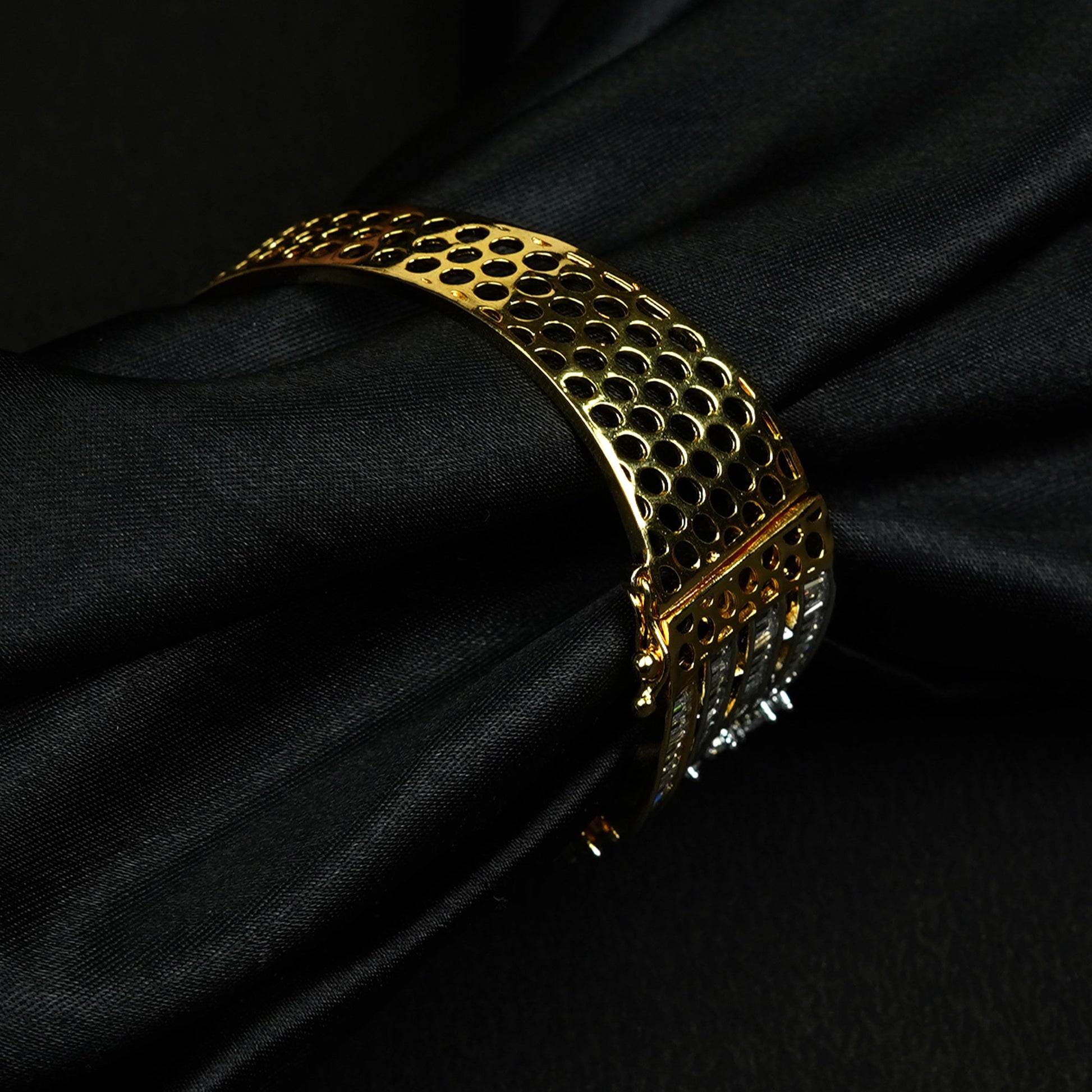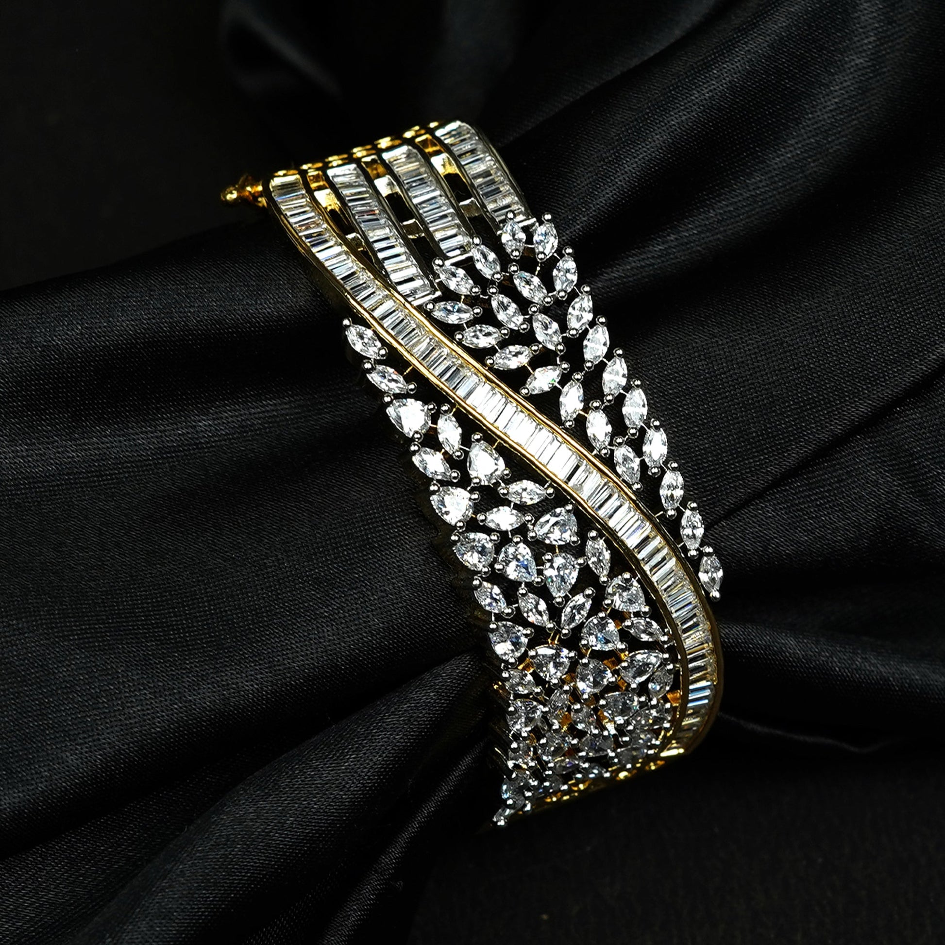 This Zevar Club premium statement bracelet features an exquisite openable design with 22K gold plating and handcrafted brilliance. Adorned with AAA Cubic Zirconia in a flowing leaf-cluster motif, it’s a luxe masterpiece perfect for glamorous parties and celebrations.