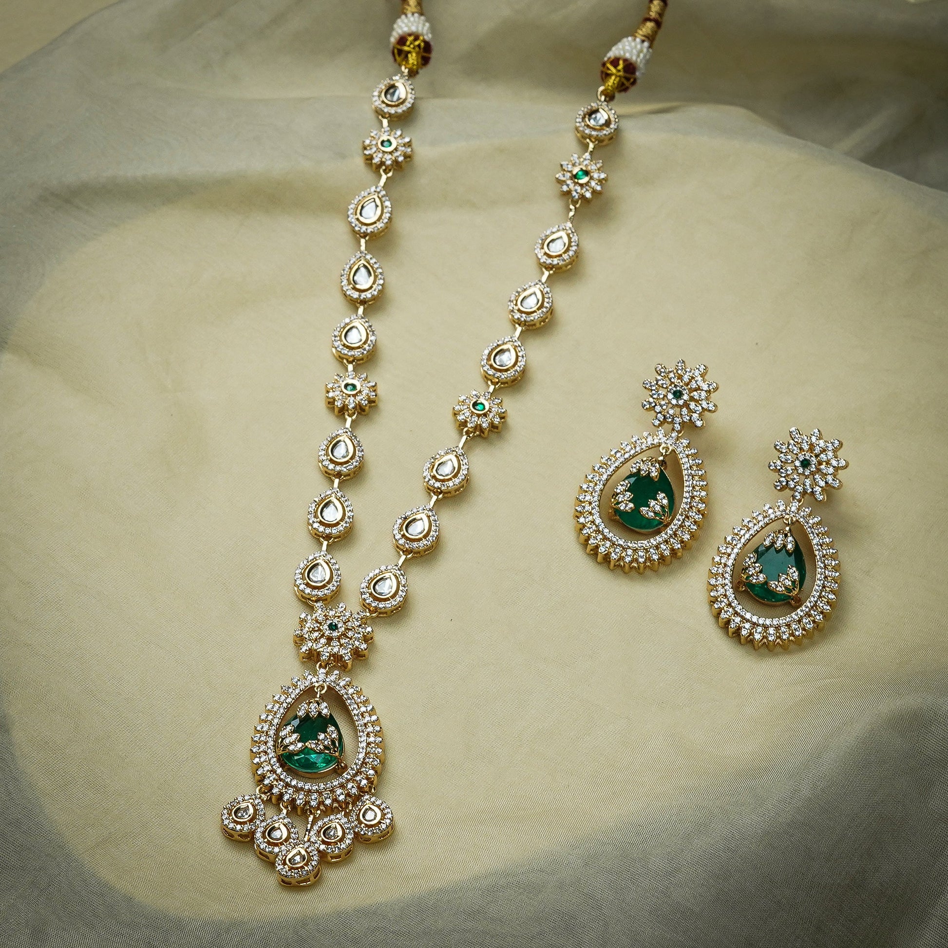 A luxurious 22K gold-plated jewellery set featuring emerald green and white cubic zirconia with kundan detailing in a long necklace style. Perfect for bridal and grand festive looks.