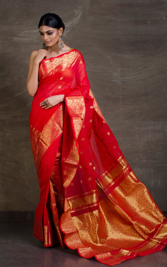 Red sarees are an ideal choice for weddings, as the color red holds deep cultural significance across India, symbolizing auspiciousness and prosperity. Brides are often drawn to this vibrant hue, which beautifully complements the radiant gleam of gold jewelry, creating a stunning and timeless look.
