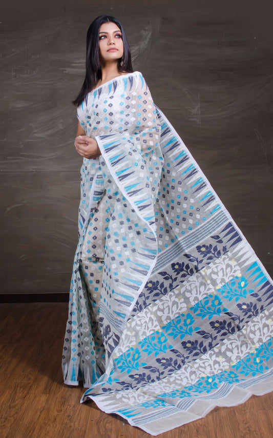 10% off availableBlended Cotton Muslin Jamdani Saree in White and Sea Green