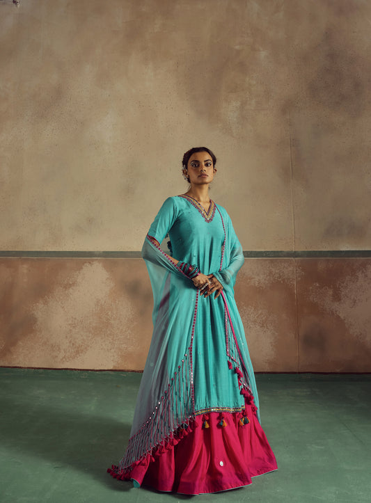 Backless aqua kurta skirt set
