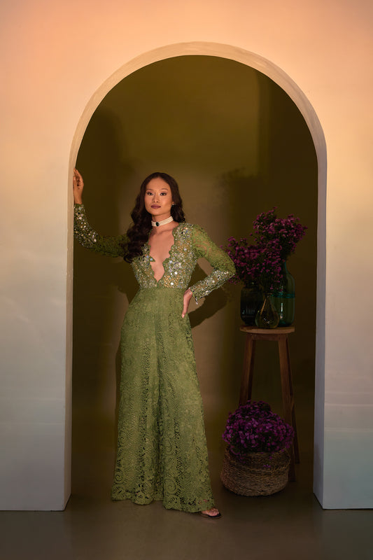 Green Cosmos Tissue Zarkan Embroidery Mehendi Lehenga