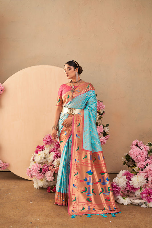 out of stockFirozi Paithani Silk Zari woven Butti Saree