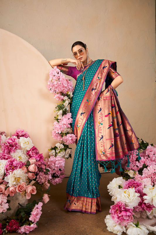 out of stockSea Green Paithani Silk Meenakari Zari Woven Saree
