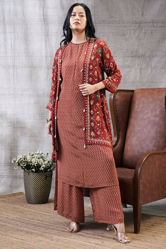 10% off availableRust Digital Printed Viscose Satin With Hand Embroidery Kurta Set