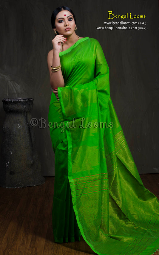 Bengal Handloom Cotton Baluchari Saree in Pistachio Green, Magenta and Midnight Blue