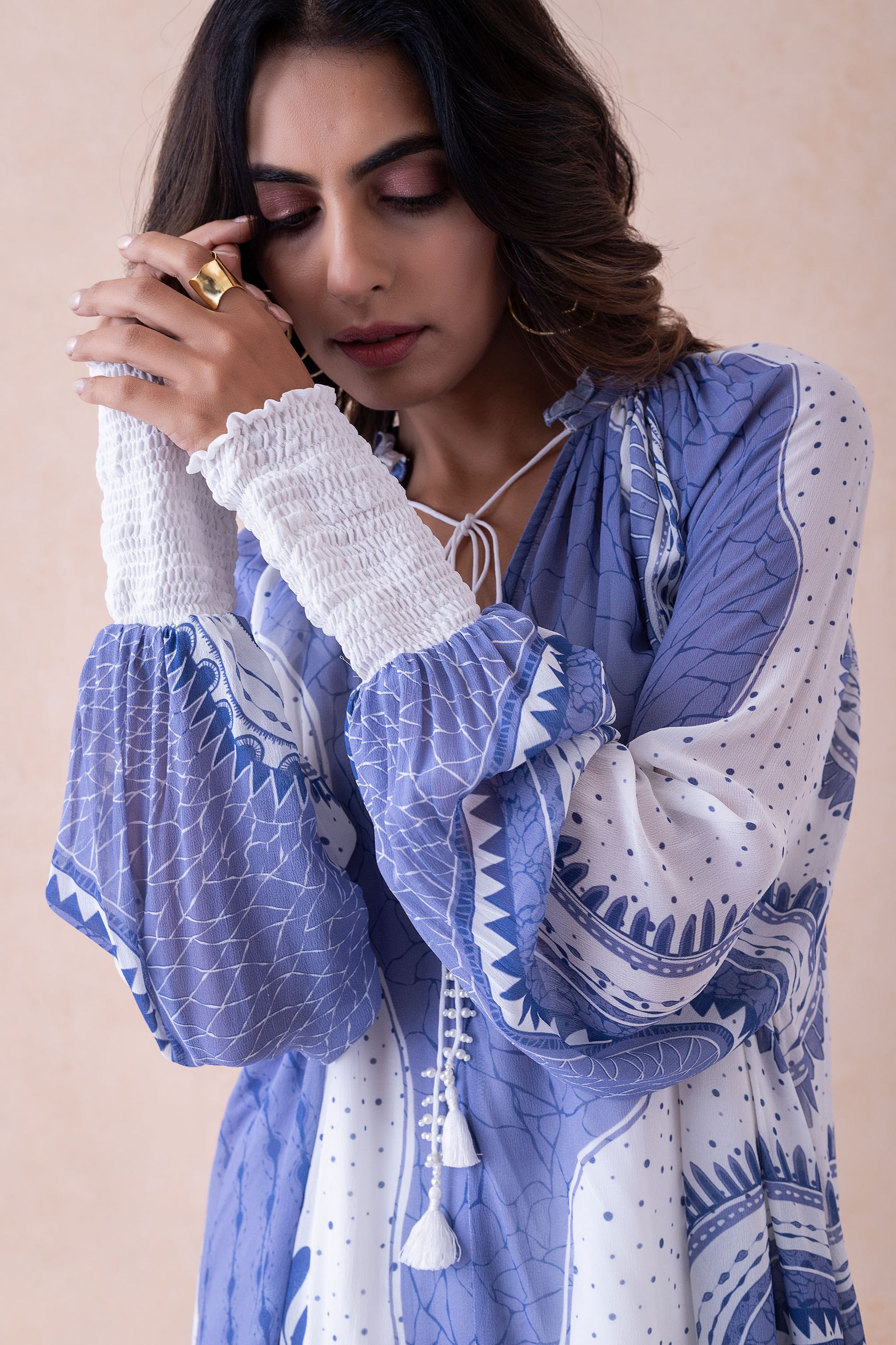 Blue and White Abstract Printed Georgette Co-ord Set with Tassel DetailThis co-ord set features a longline, relaxed-fit top with full sleeves and an abstract wave-like print in soft blue and white. The neckline is finished with delicate tassels. Paired with matching wide-legged bottoms for a breezy, coordinated look.Product Type: Two-Piece Co-ord SetPattern: Abstract Print with Tassel DetailingLength: Top – Longline | Pants – Full-LengthClosure: Slip-OnLining: Fully Lined.