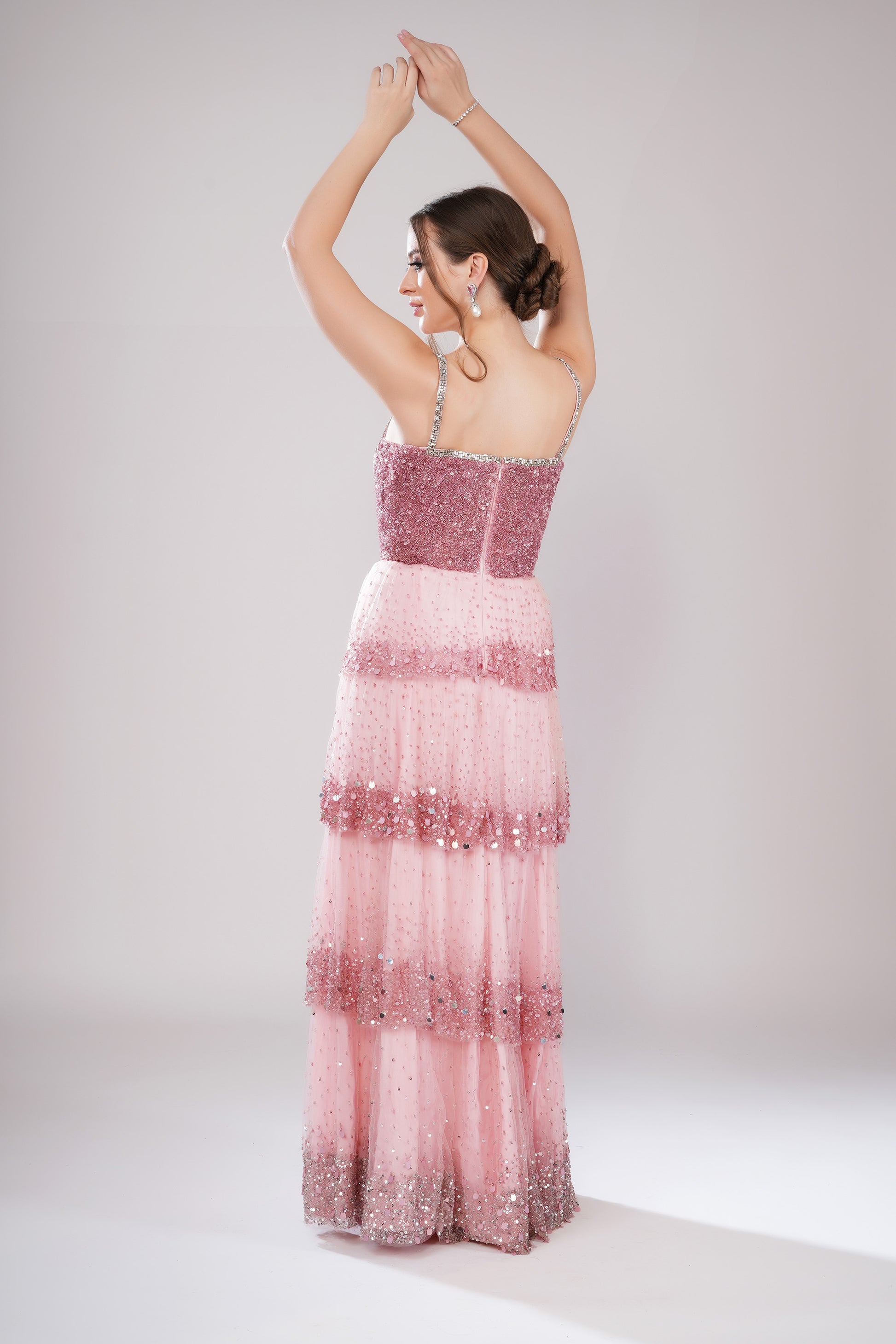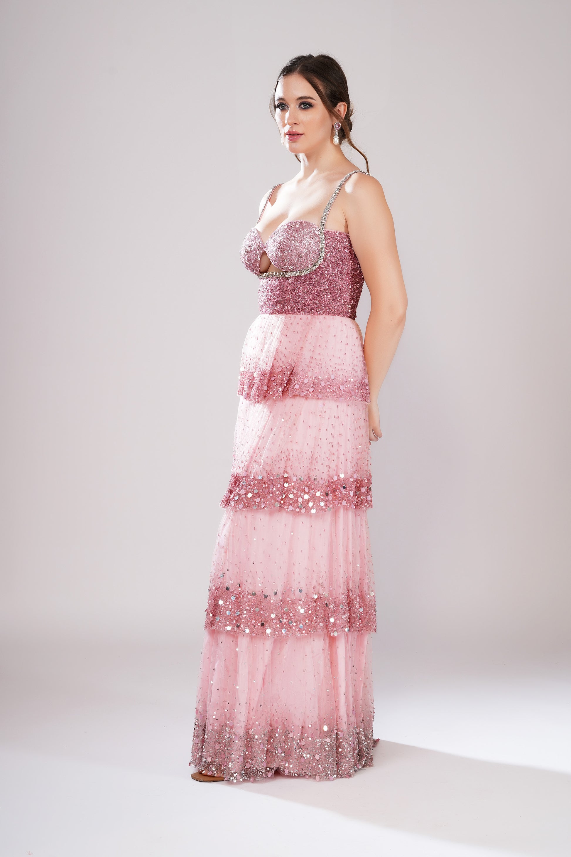 A pink gown featuring a fitted bodice with delicate straps and a sweetheart neckline, paired with a tiered, pleated floor-length skirt. The combination of structure and flow creates a timeless and graceful silhouette.